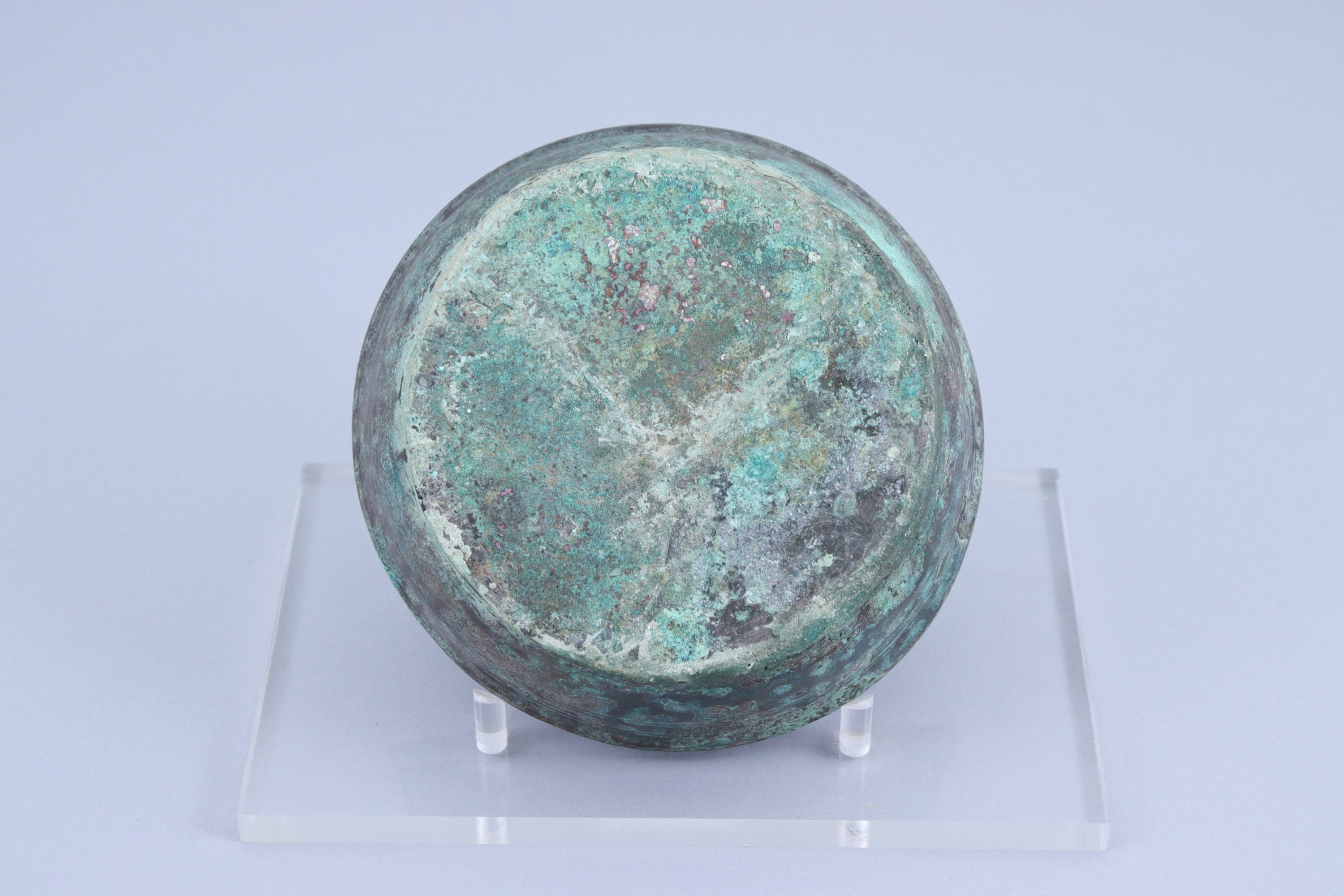 en bronze à patine verte, l’extérieur décoré de bandes en creux.