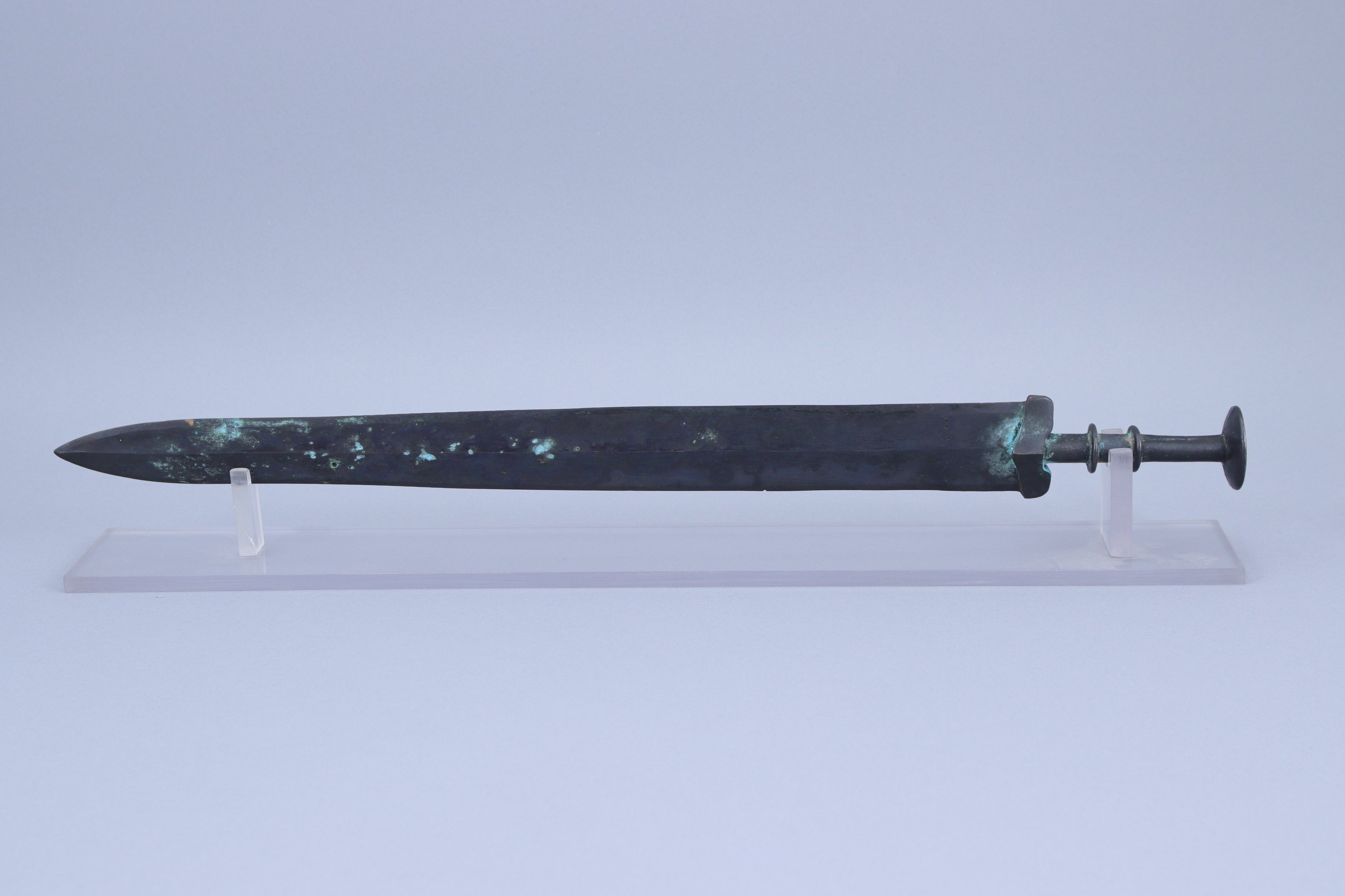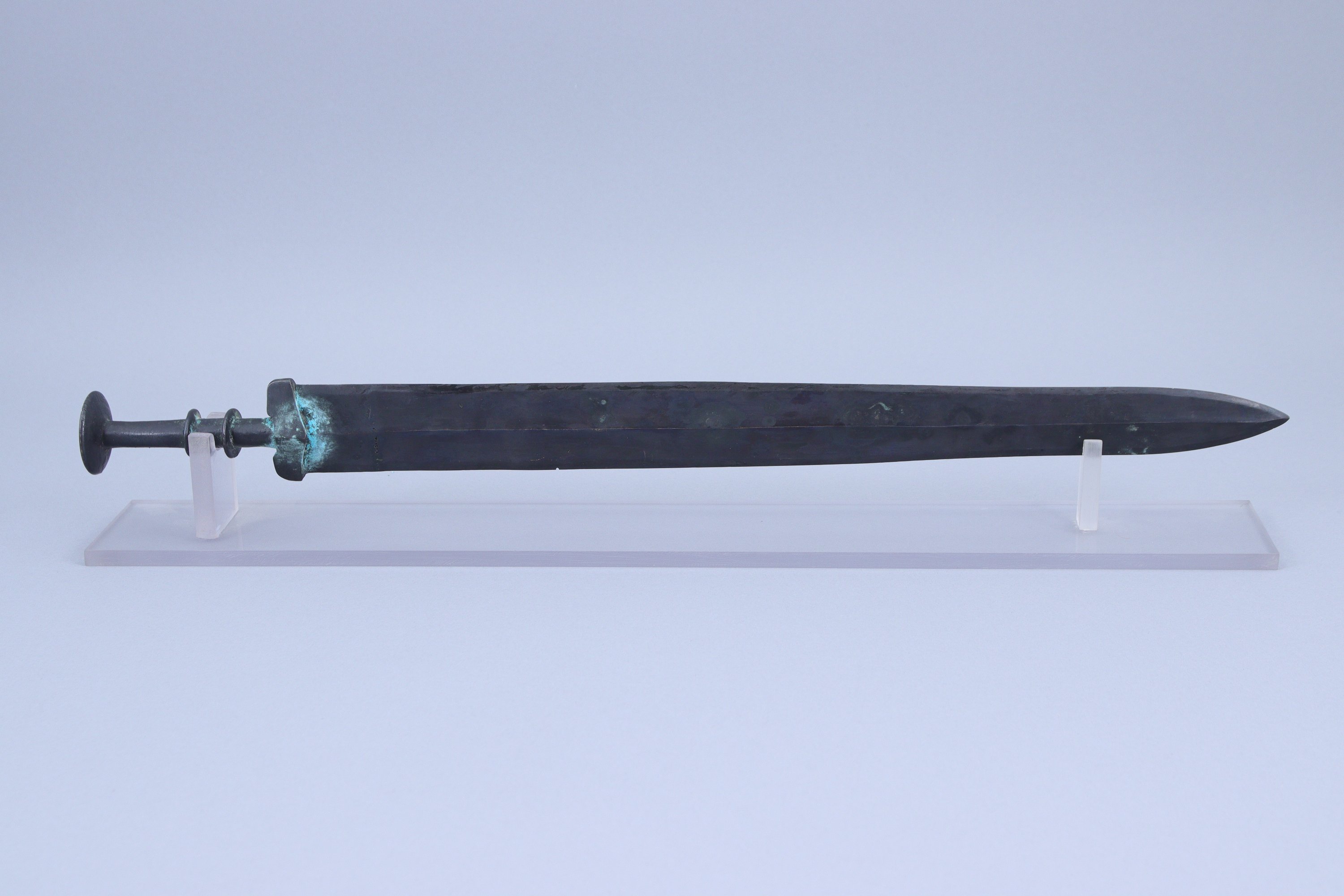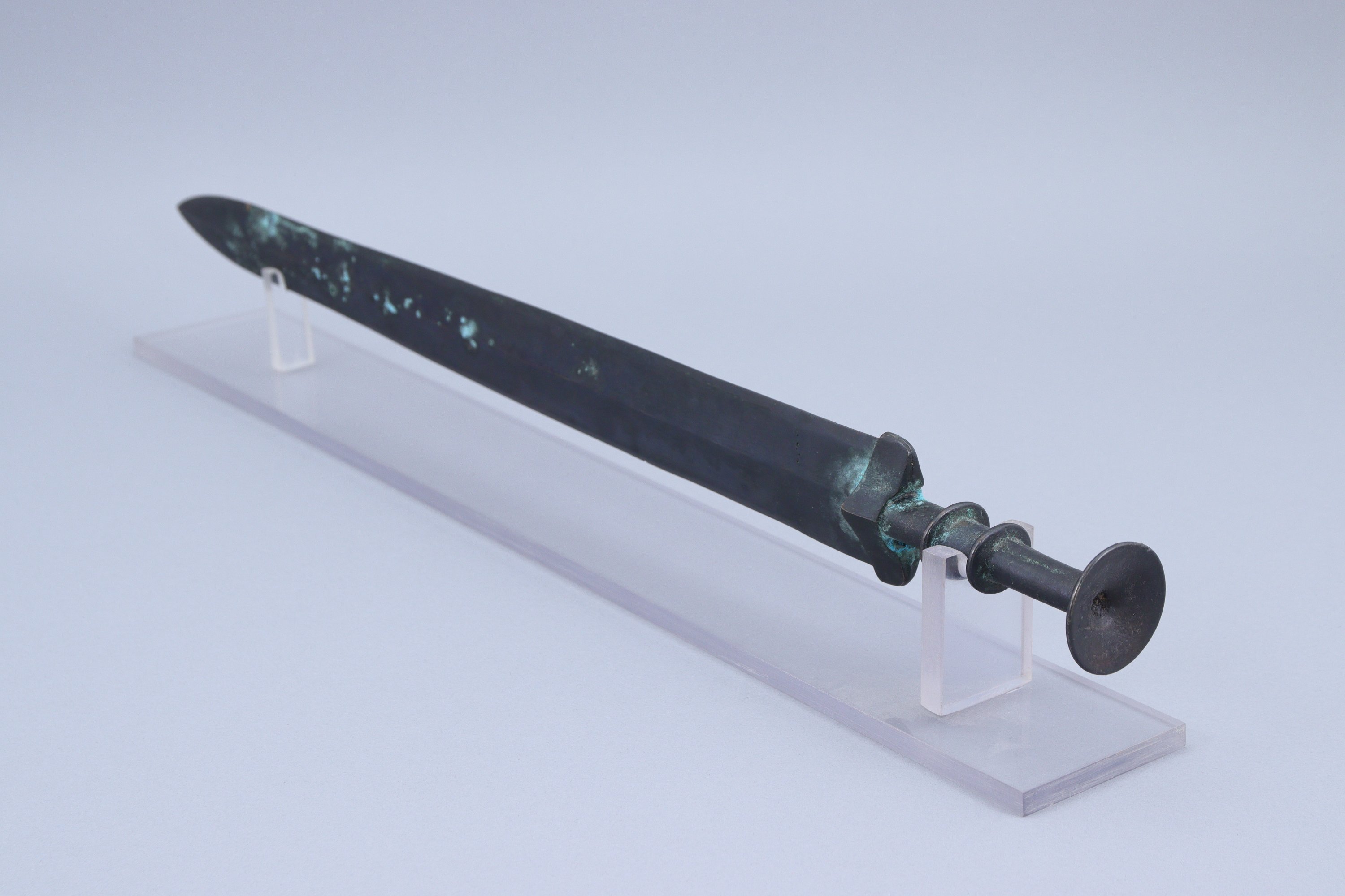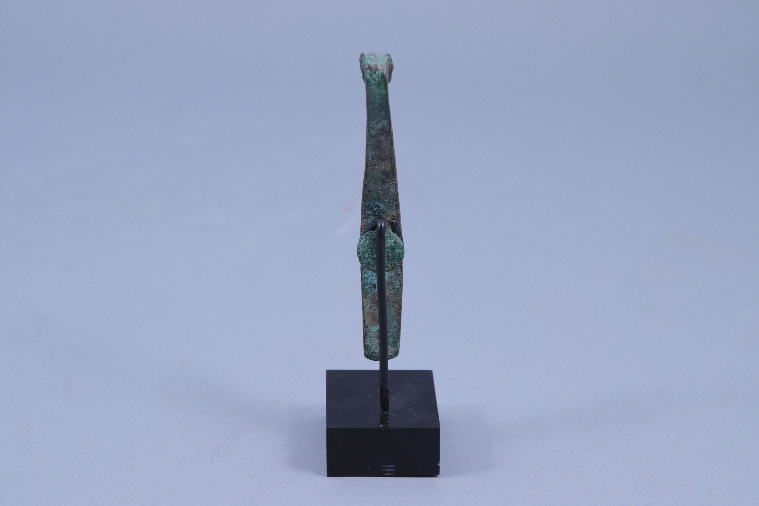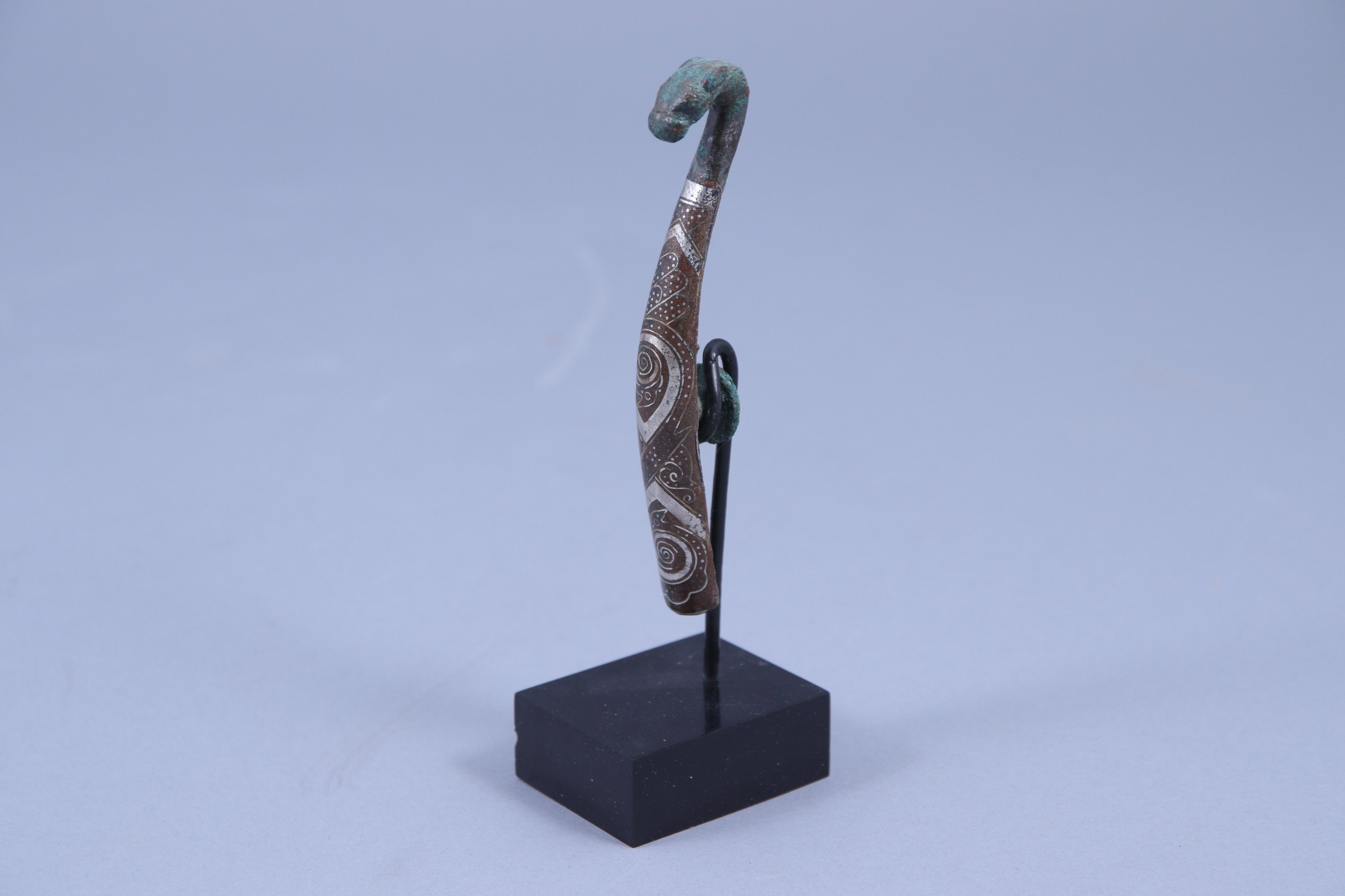 en bronze et fibule en bronze incrusté de fils d'argent, à décor de serpents lovés.