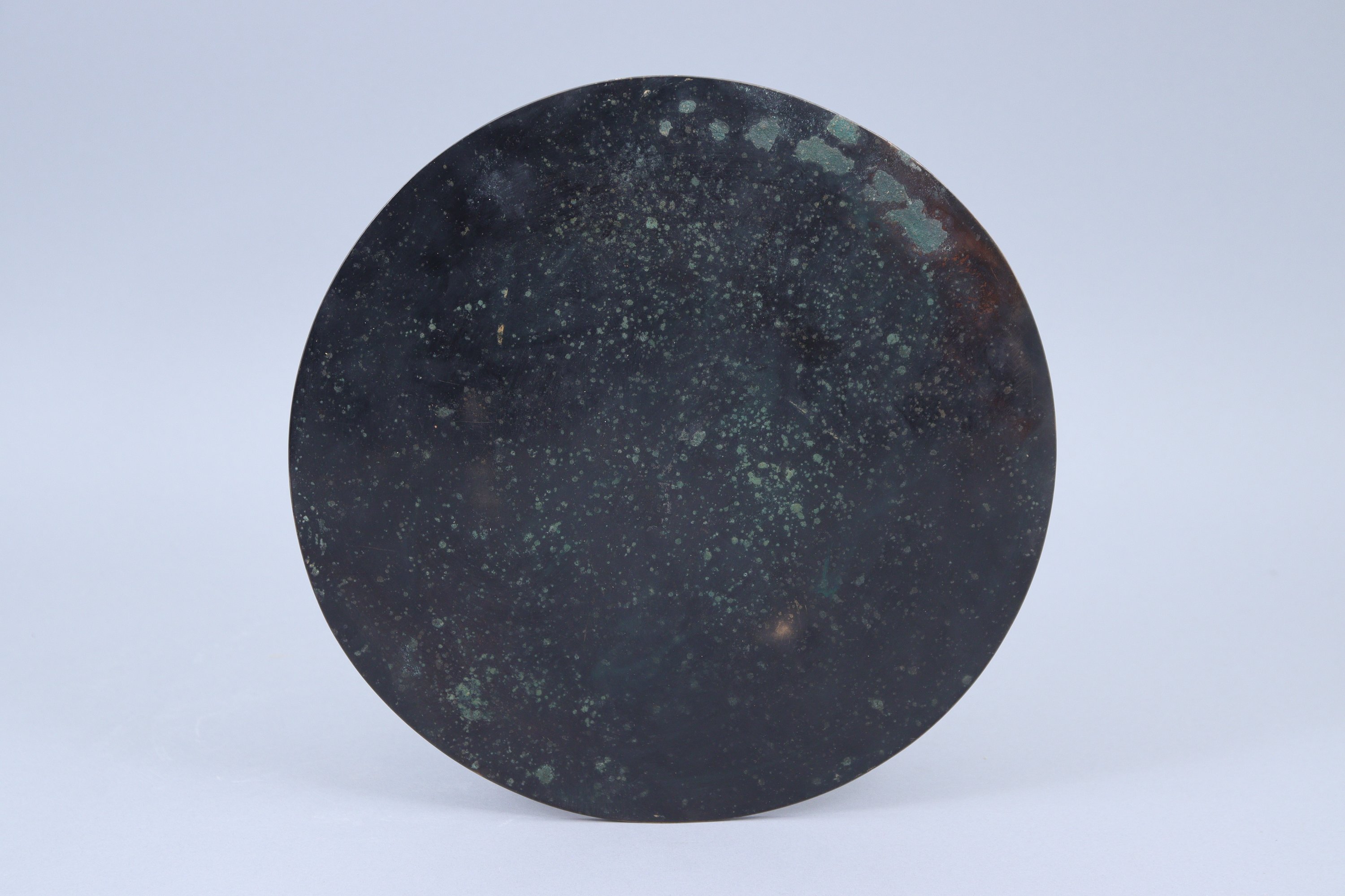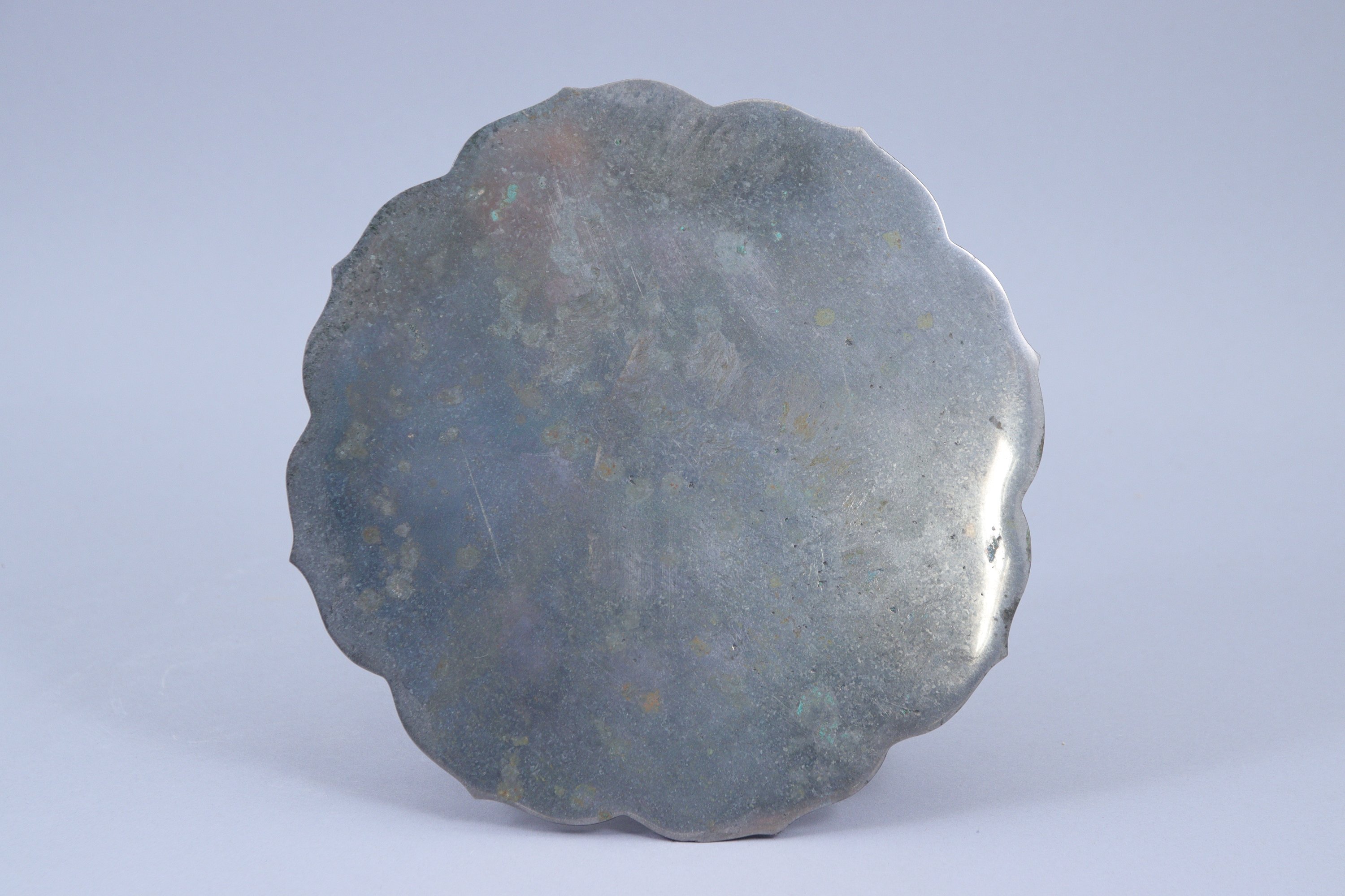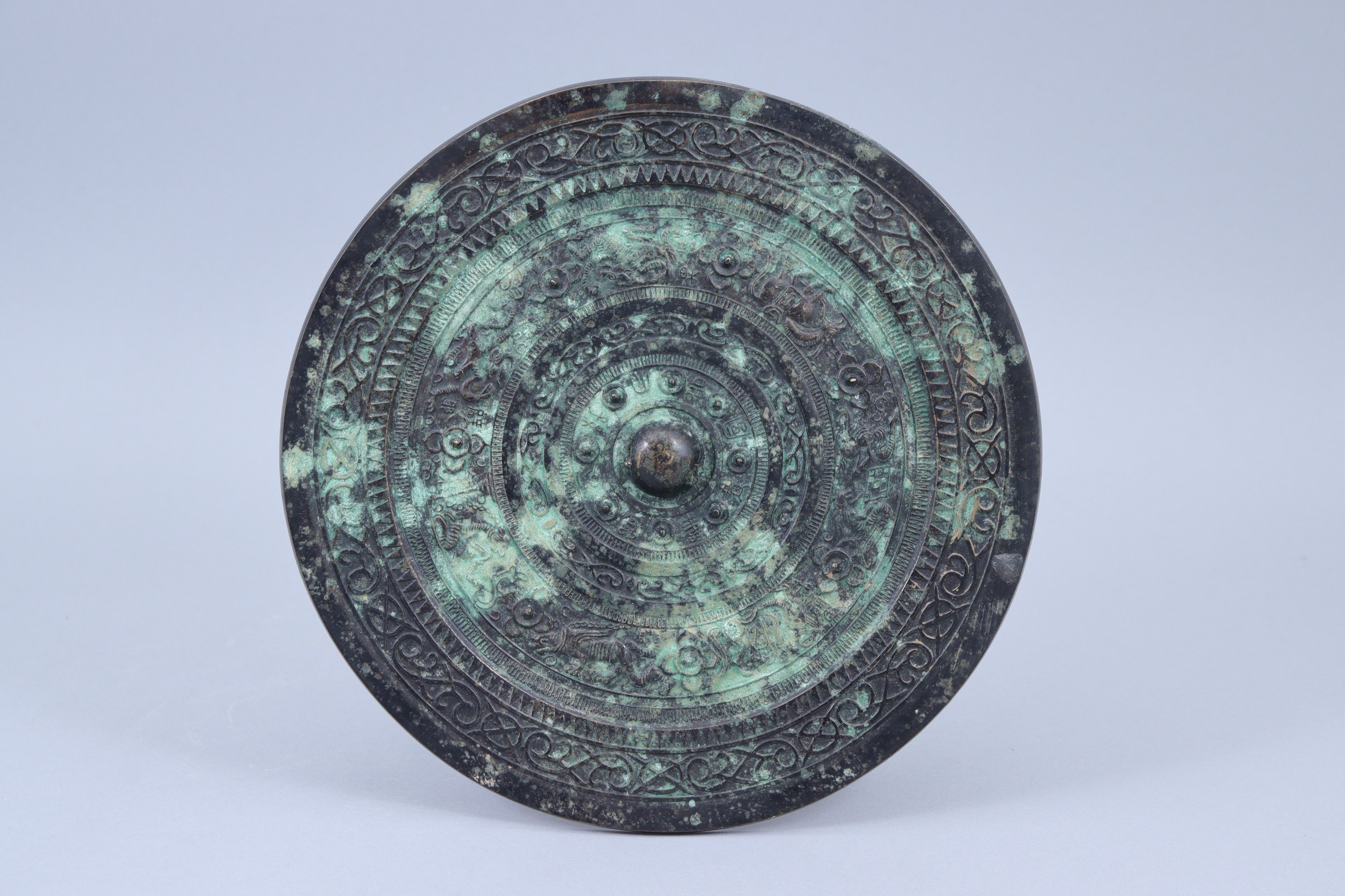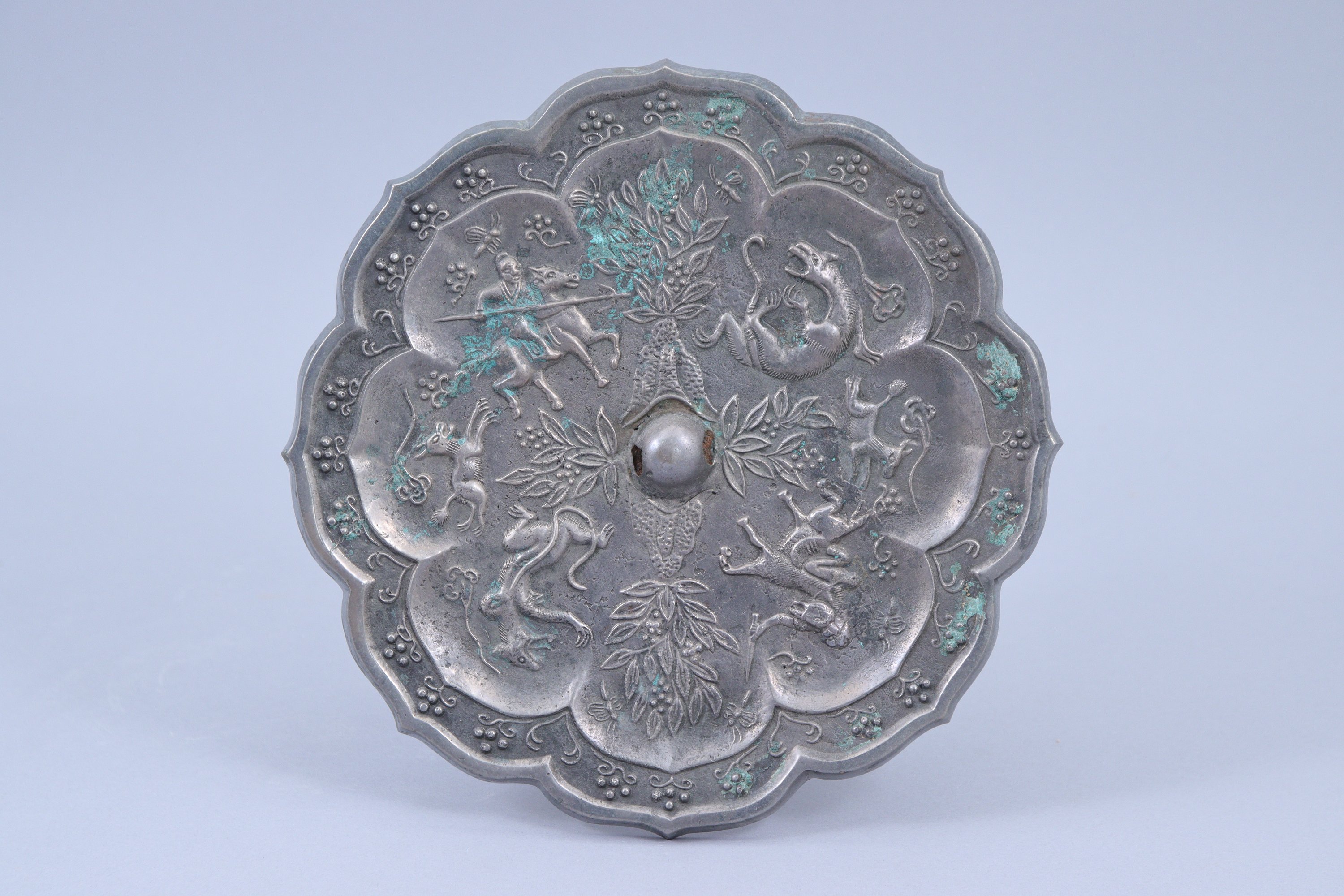 en bronze, l'un circulaire à décor d'animaux et fleurs alternés avec une inscription autour de la prise (style Han), l'autre polylobé en relief de cavaliers chassant des dragons (style Tang).