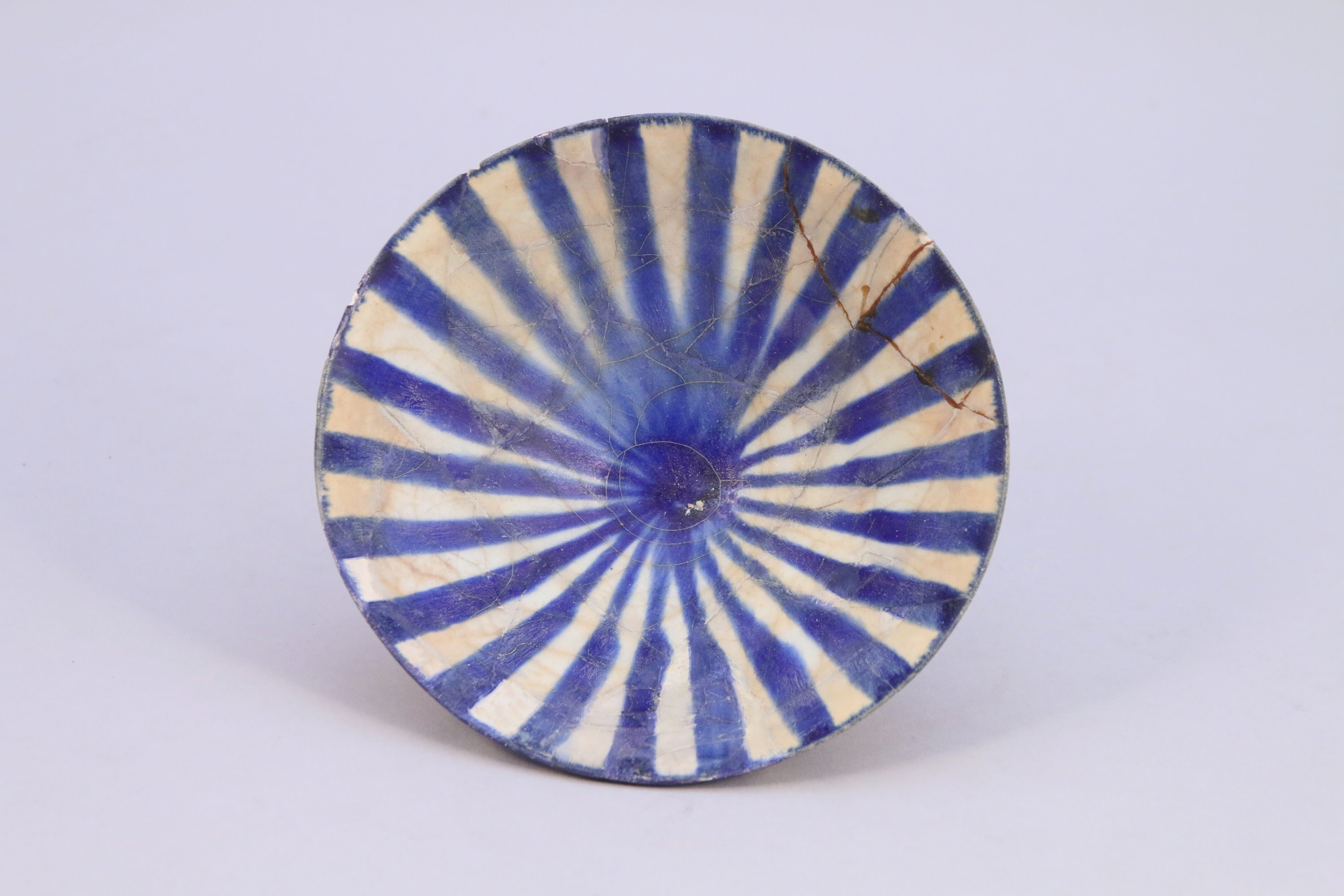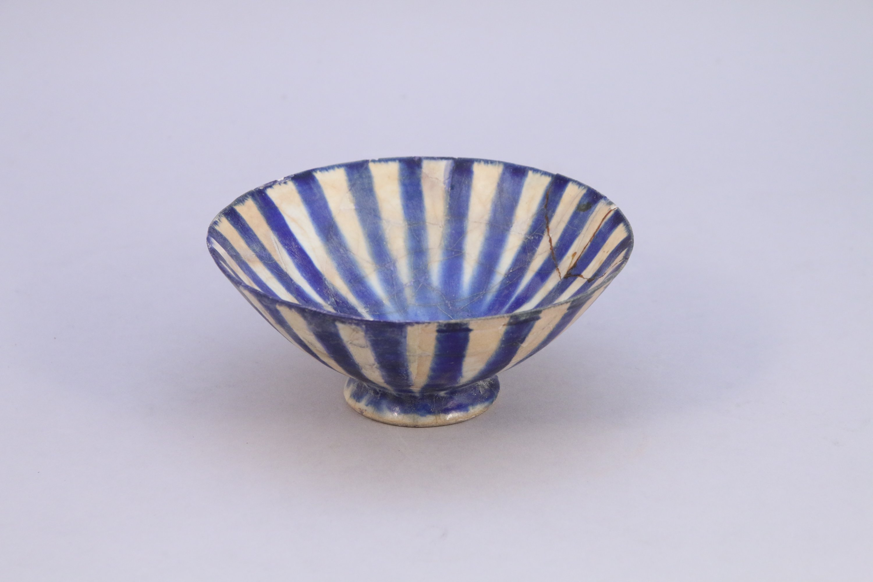 Joint : Iran Seldjoukide, Kashan, XIIe - XIIIe siècle. Coupe à décor rayonnant en céramique siliceuse à décor de rayons peints en bleu cobalt sous glaçure. Haut. 6,5, Diam. 16 cm. (cassures recollées, accidents et restauration)