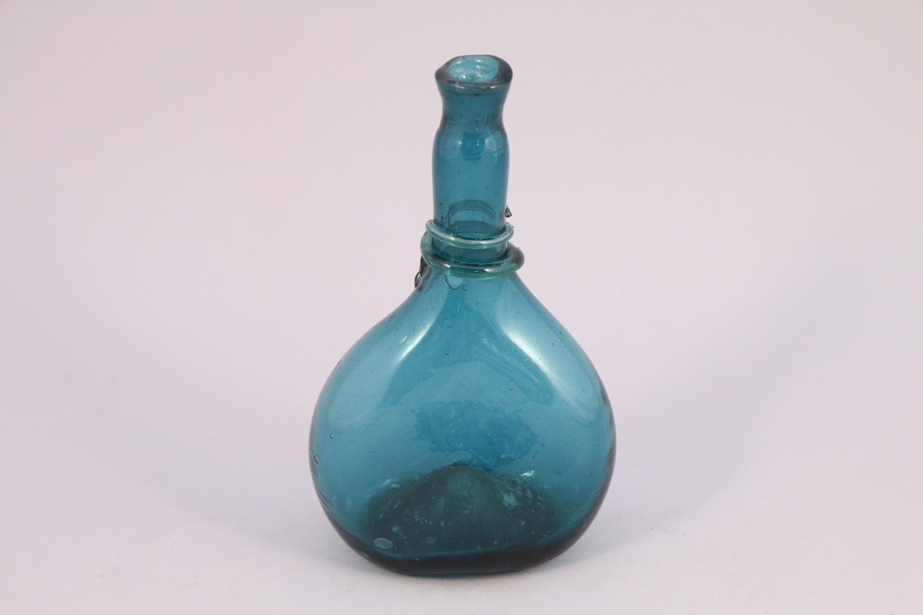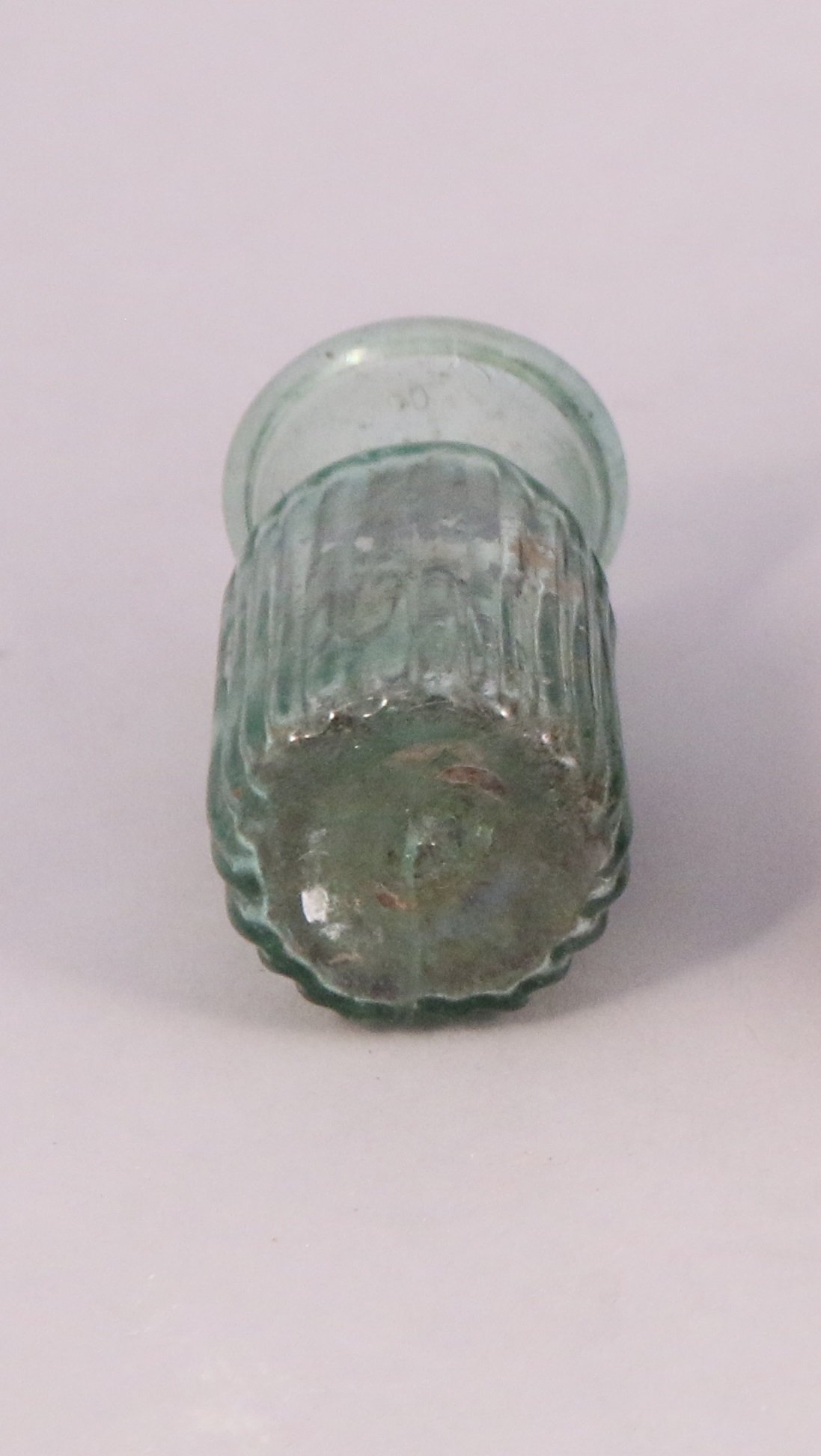 Jointes : Proche et Moyen-Orient, XIXe siècle. Deux verreries islamiques ; la première, un petit flacon en verre vert à panse côtelée et large col, Egypte ou Proche-Orient. La seconde, un flacon à panse tronconique ornée de cercles gravés et col cylindrique côtelé entouré dune collerette et achevé dune embouchure évasée, Iran. Haut. flacon Iran 10 cm.