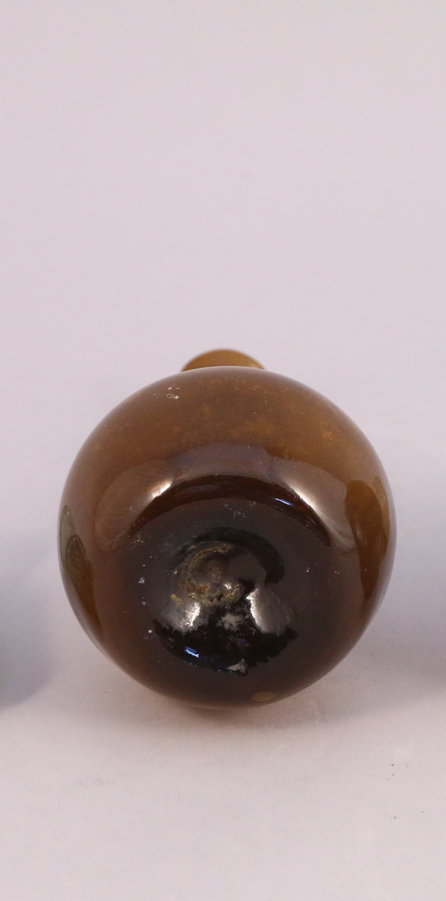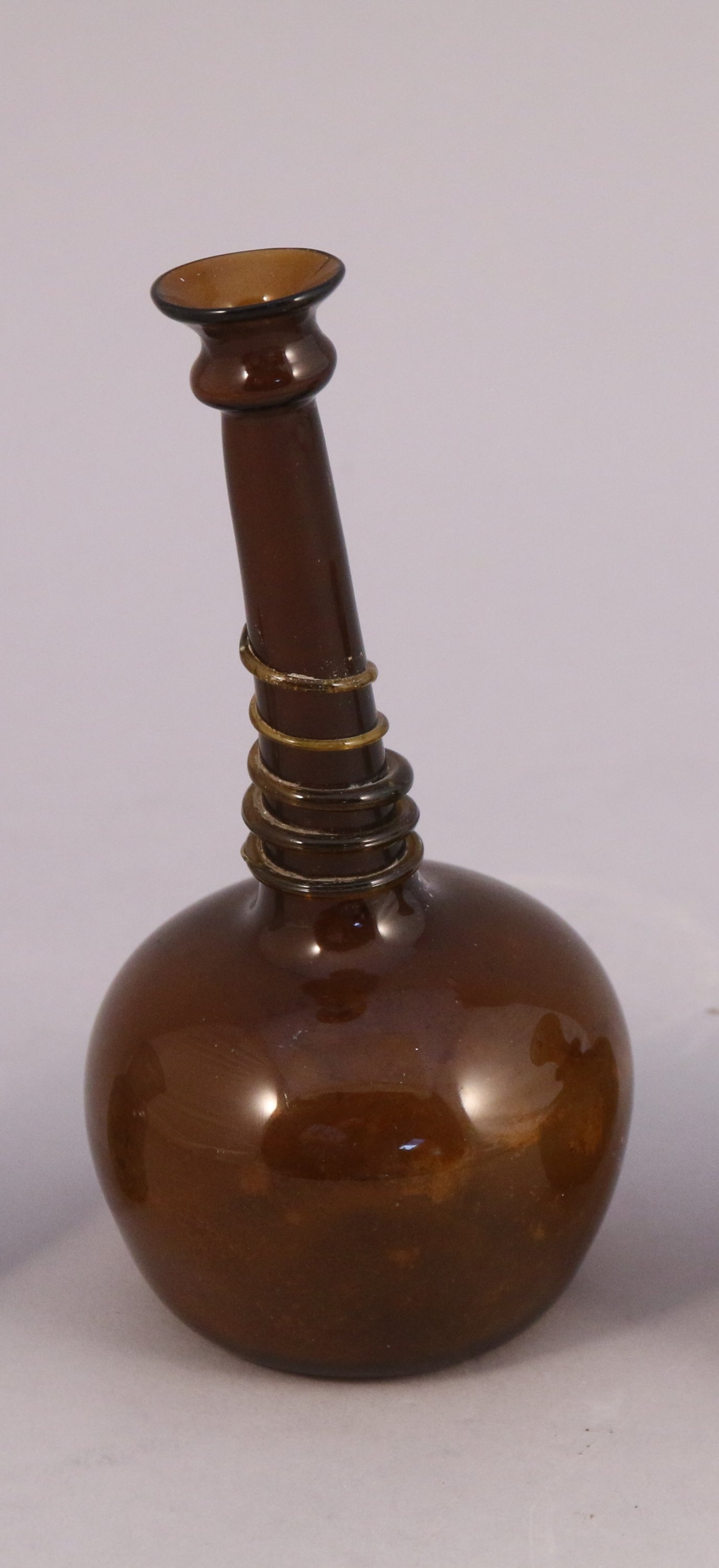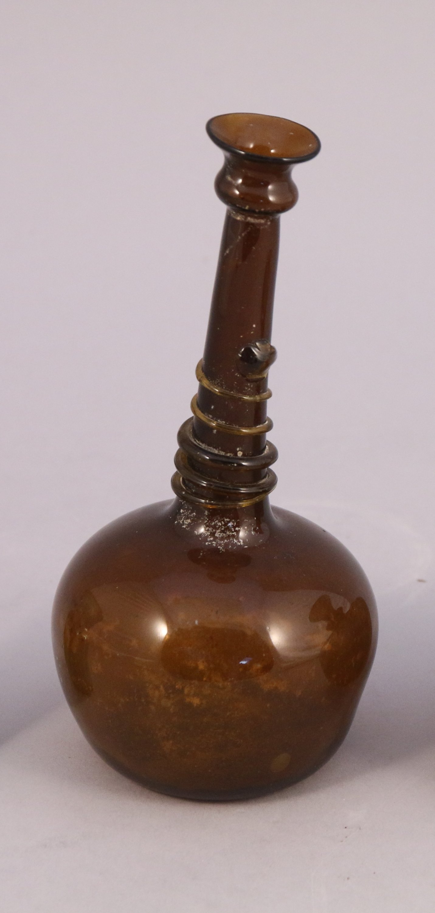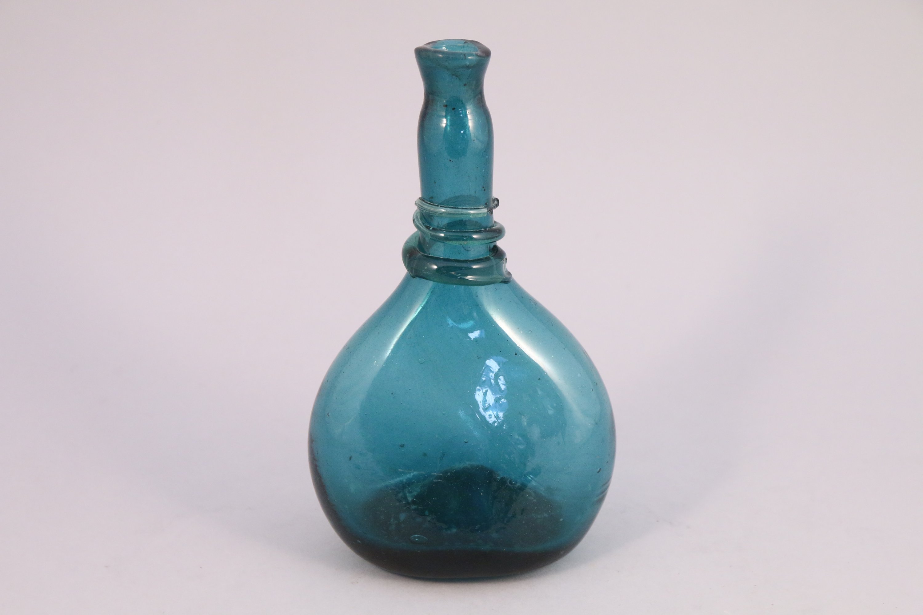 en verre coloré, lune en verre brun à panse globulaire surmontée dun long col cylindrique à large embouchure et décor de filets, la seconde en verre bleu à panse ovoïde surmontée dun col cylindrique à décor de filets.