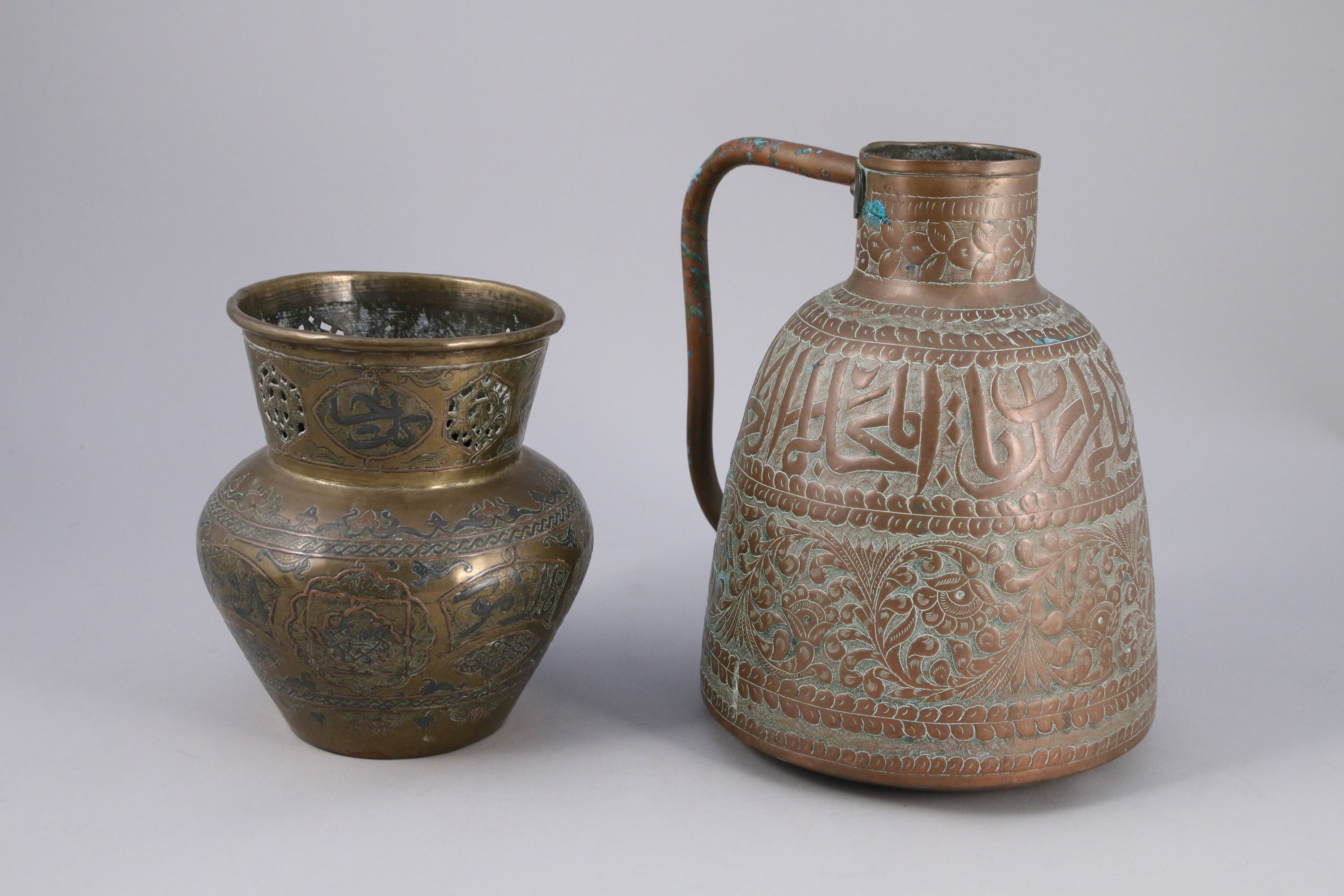 Joint : Iran - XIXe s. Broc en cuivre à décor épigraphique et végétal gravé. Haut. 25 cm. (incrustations d’argent oxydées)