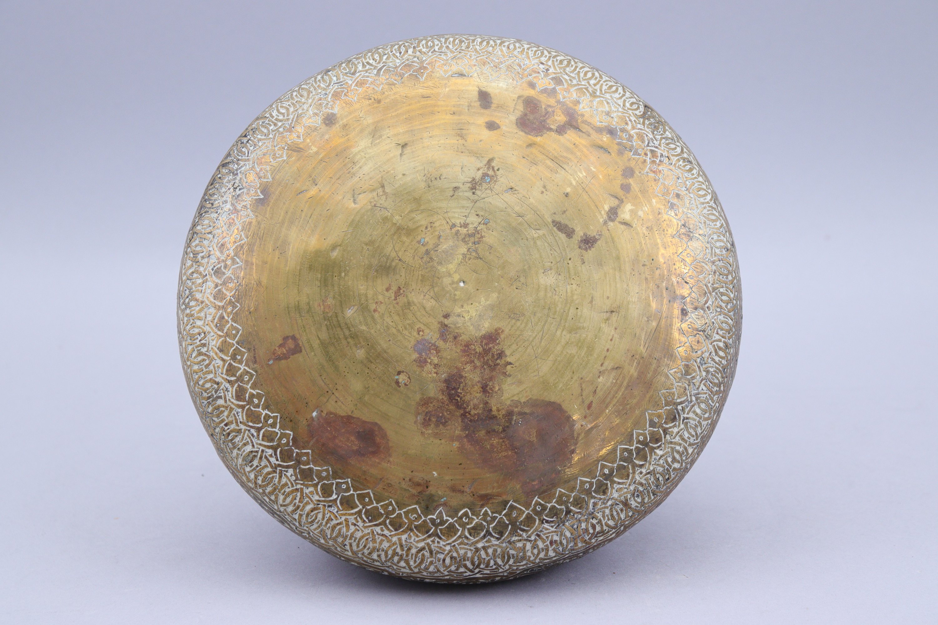 Joint : Syrie ou Afrique du Nord, fin XIXe-XXe siècle. Pot en laiton gravé à décor de rinceaux. Haut. 11,5 cm. (enfoncements).