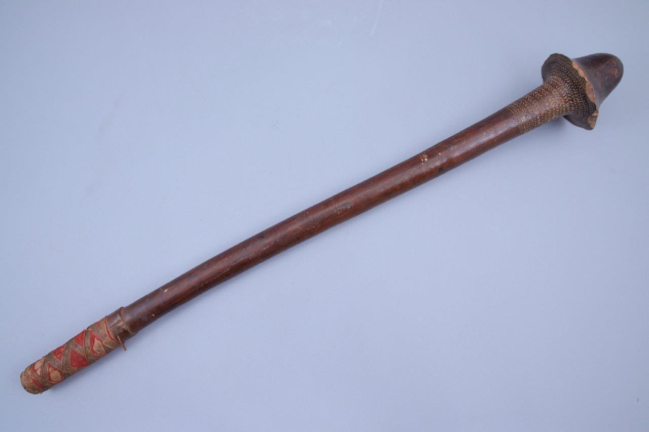 en bois dur à belle patine d'usage brune brillante. Phallomorphe, il est orné de fins décors gravés en pointillés sur la collerette. La prise est gainée de tissus et cordelettes de fibres végétales tressées.