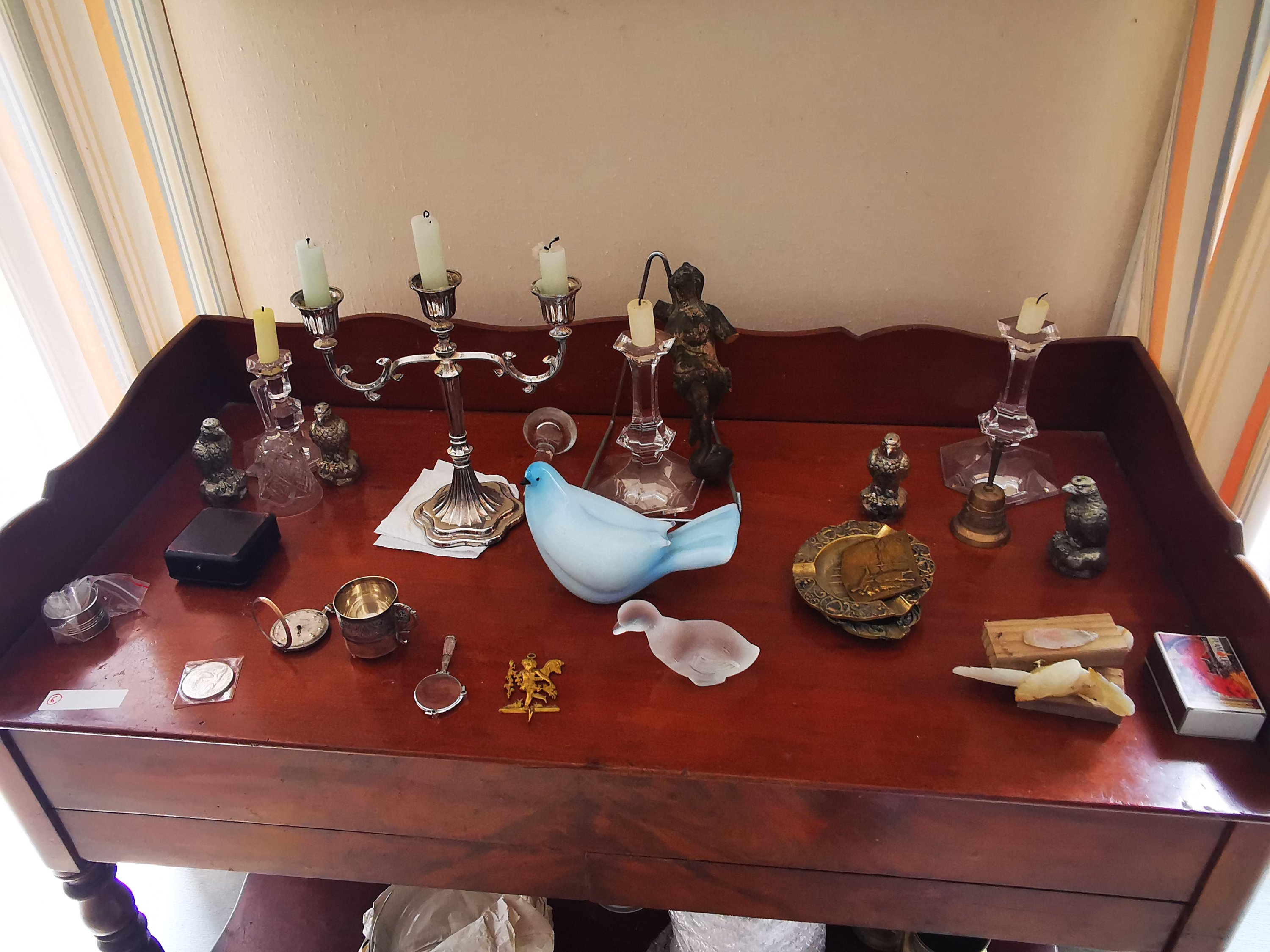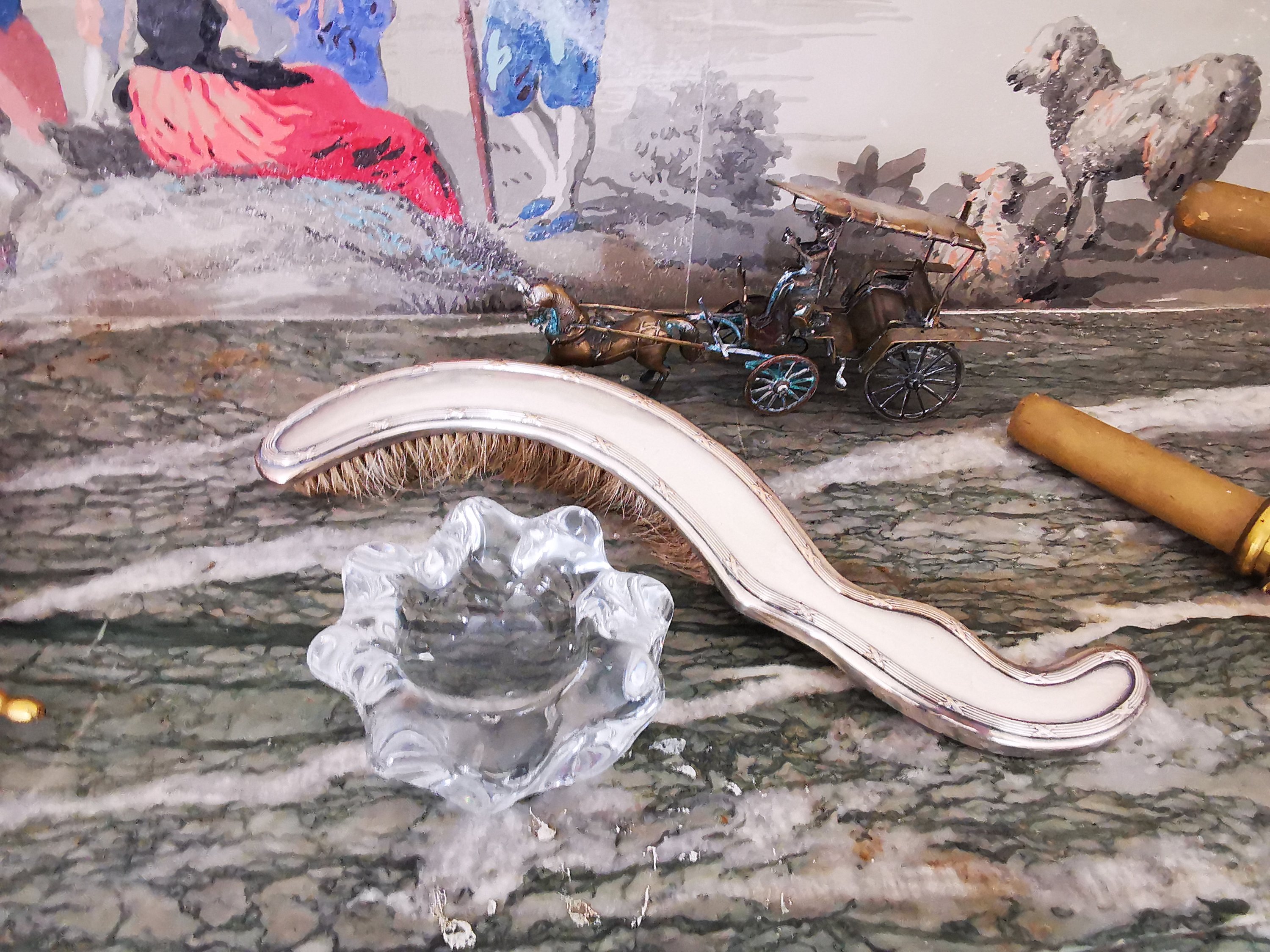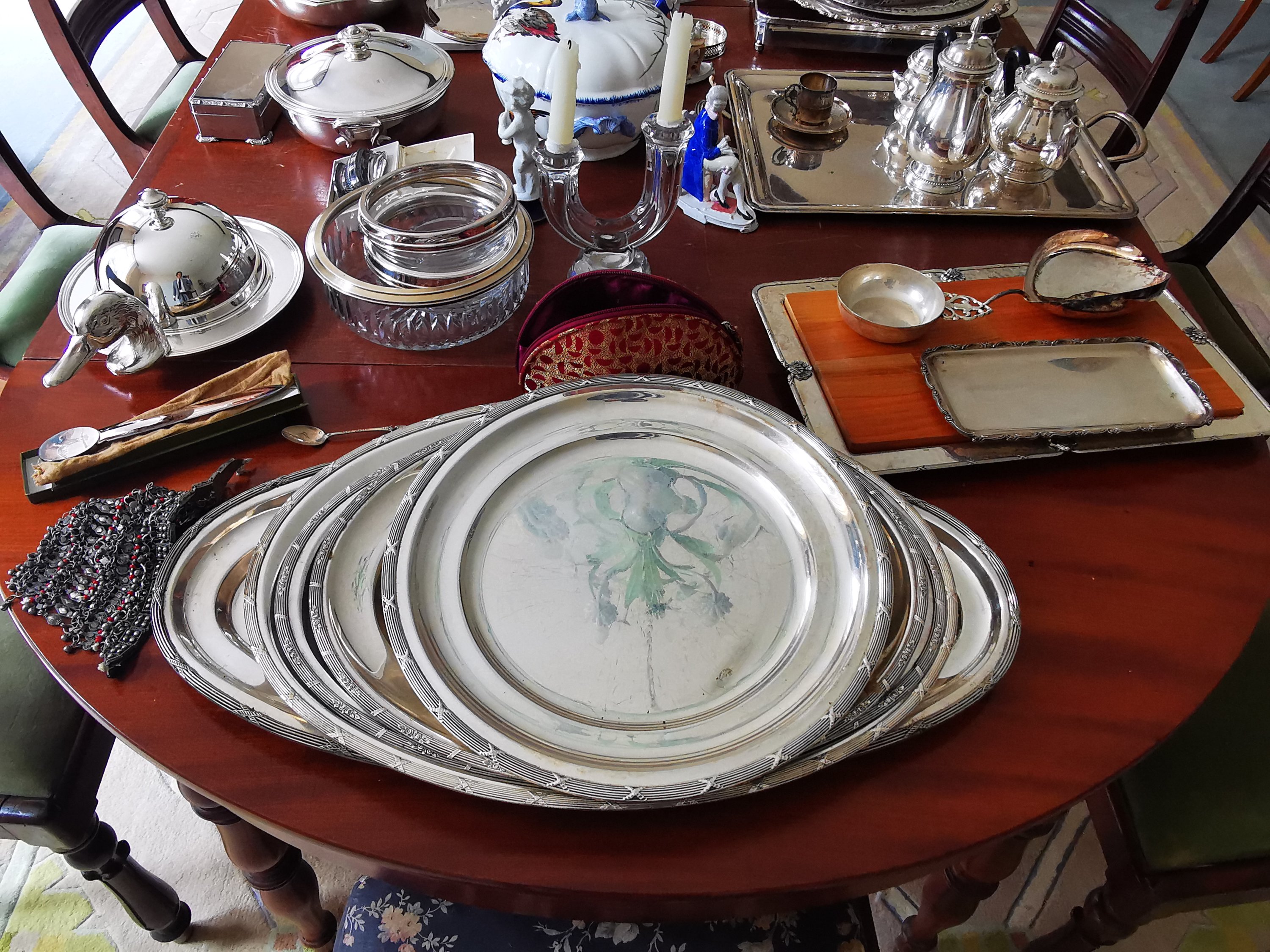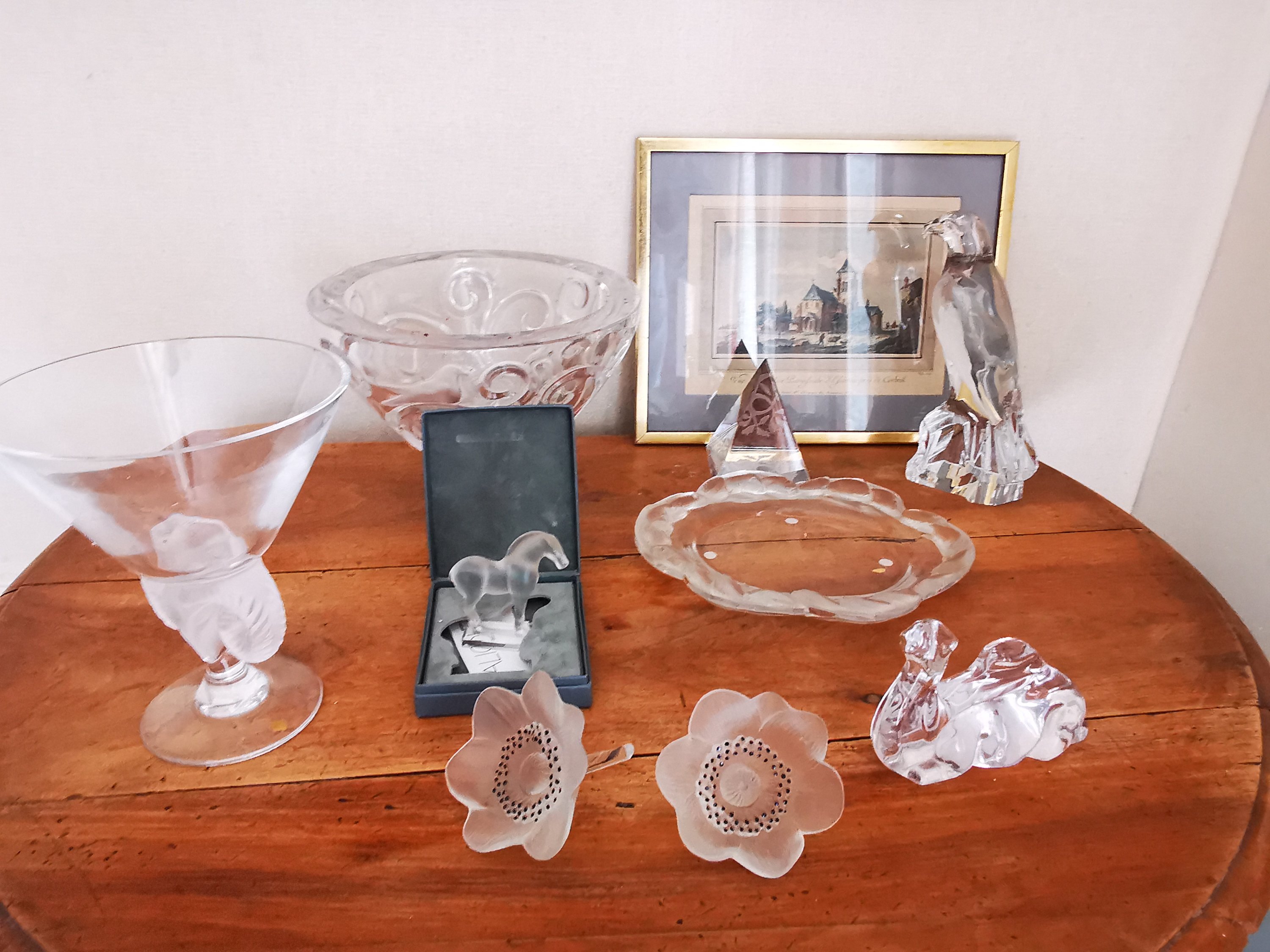 petit mobilier (chaises, console), verreries (dont Lalique), nombreuses pièces de métal argenté, vaisselle, nécessaire de voyage, tableaux...