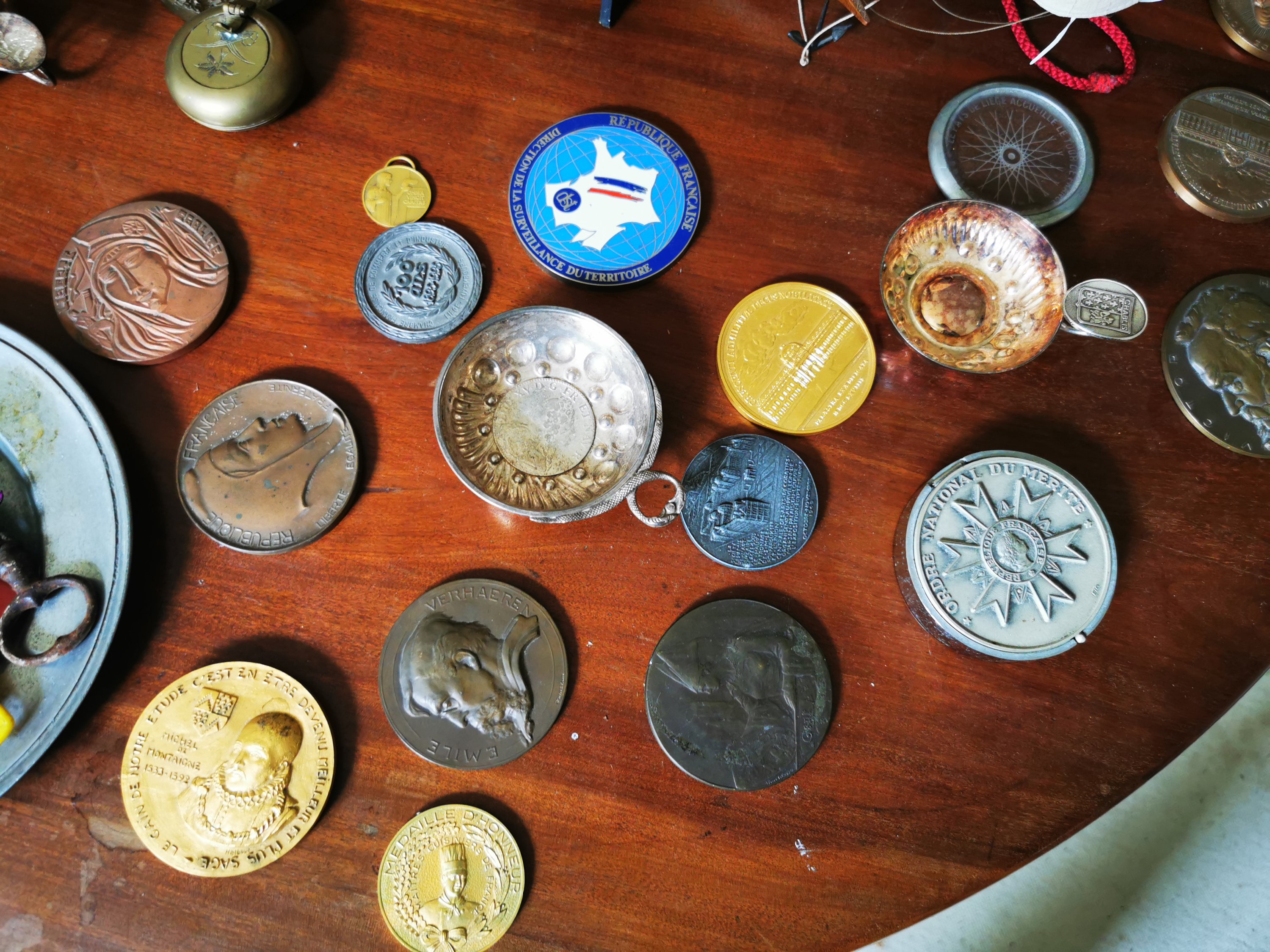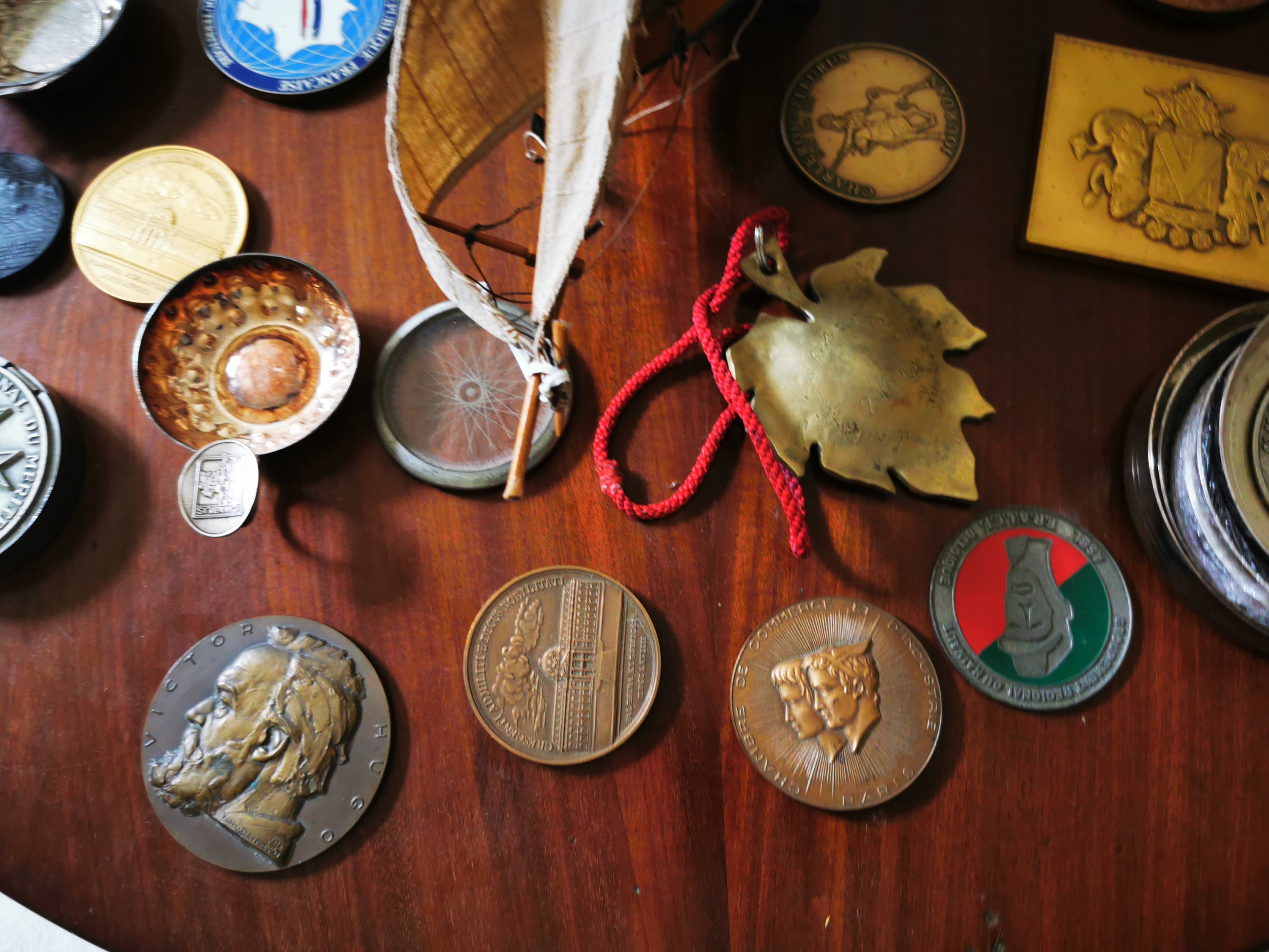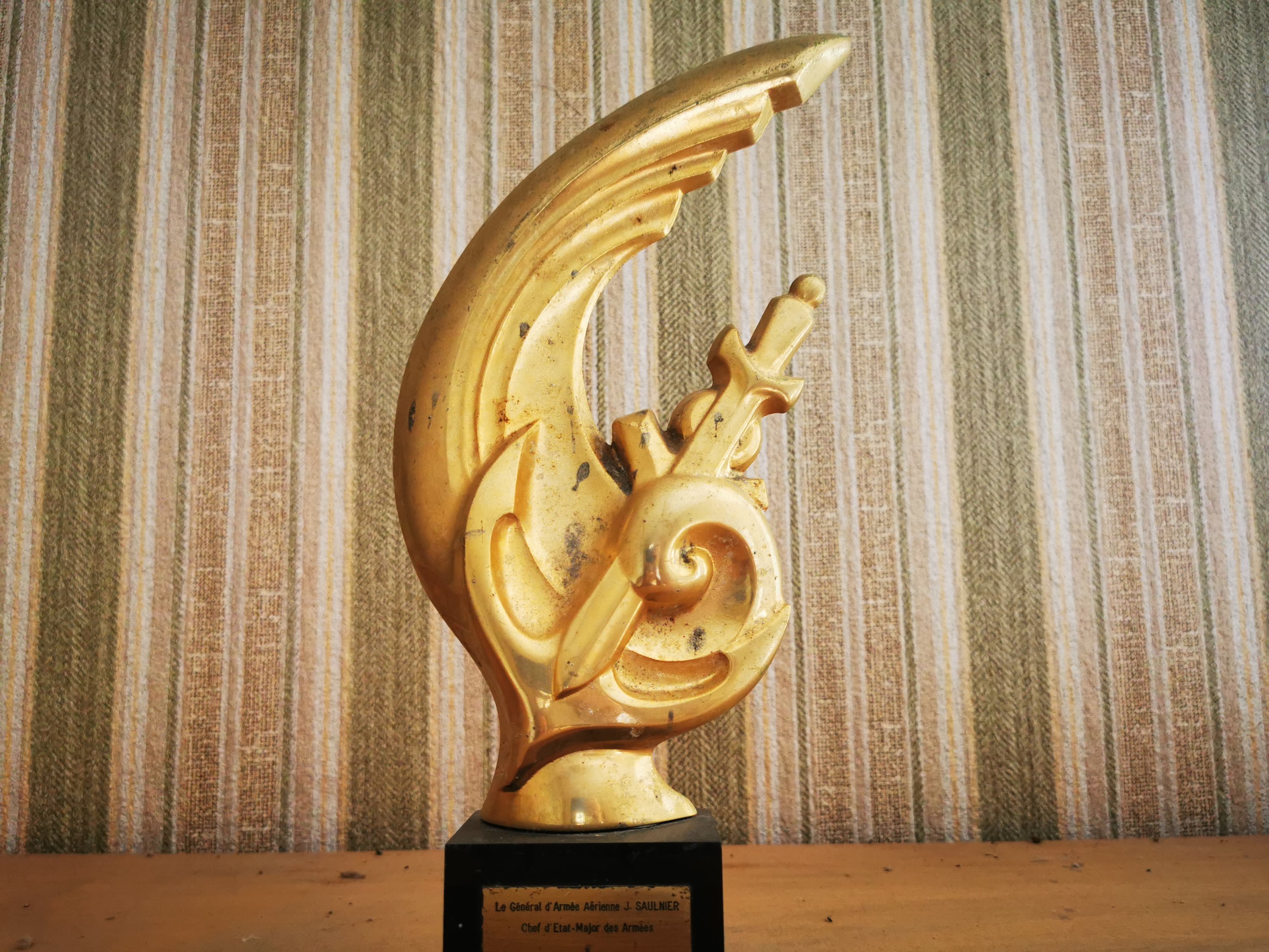 Joint: trophée en métal doré représentant une ancre e un glaive enchassés dans une vague, offert à Jacques Bernière par le Général J. Saulnier.