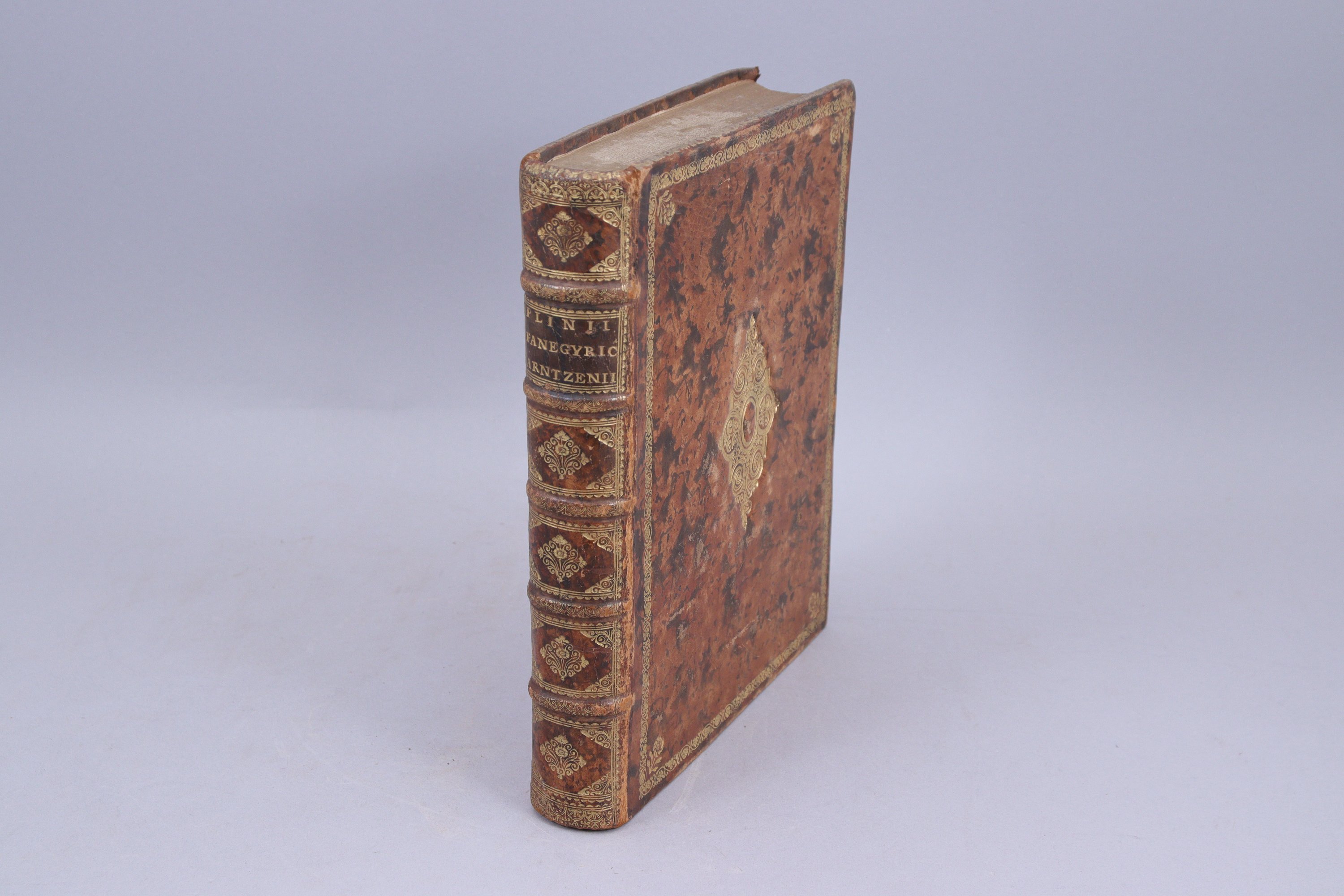 Frontispice gravé par W. Jongman. Savante édition du Panégyrique de Trajan par Pline le Jeune, donnée par Jan Arntzenius (1702-1759), professeur à Nimègue, puis à Franeker, avec les notes de Juste-Lipse, J. Gruter, etc...