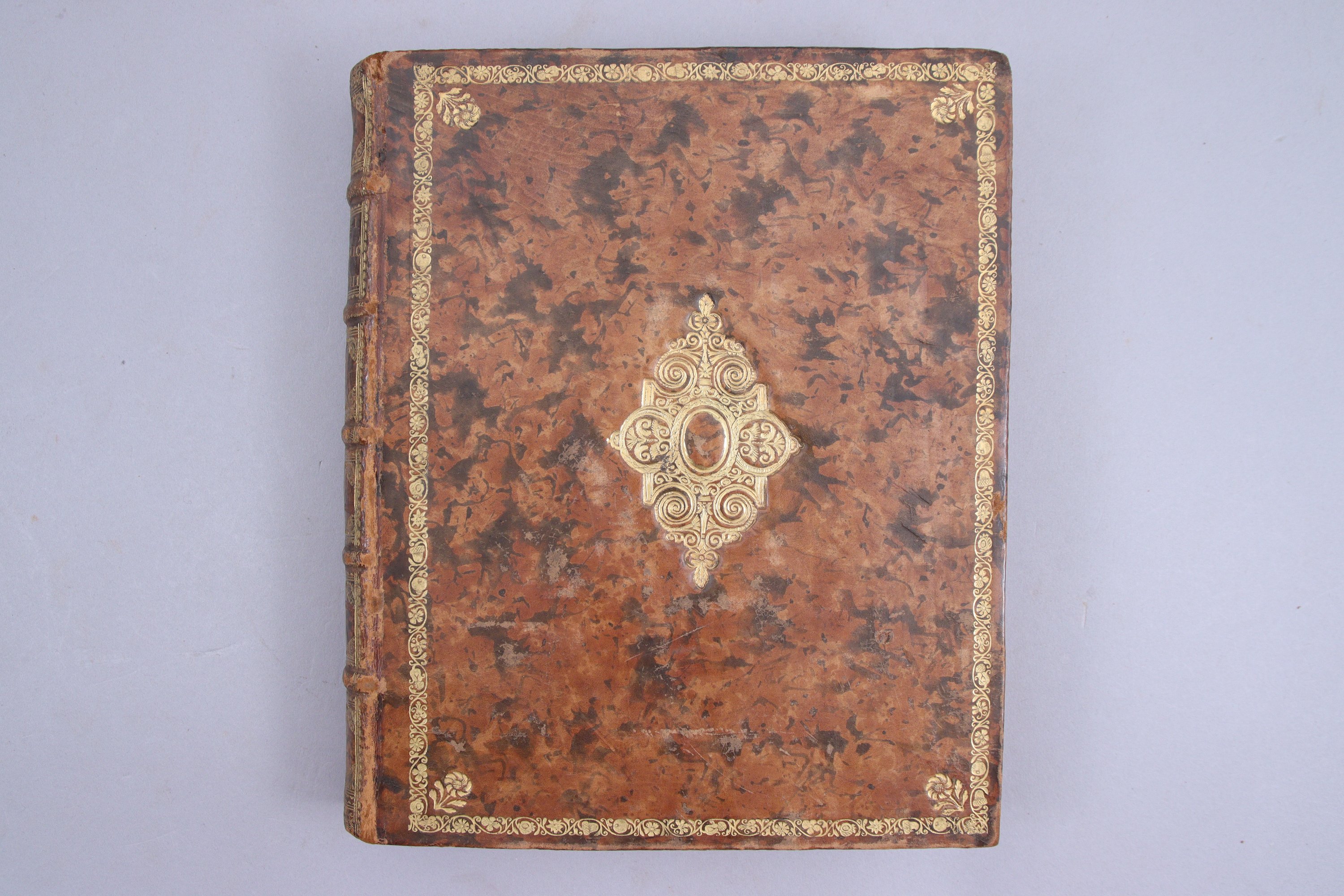 In-4°, plein veau raciné, large roulette d'encadrement, grand fer aux arabesques au centre des plats, dos très orné, toutes tranches dorées. Reliure hollandaise du temps. (Quelques cahiers roussis).