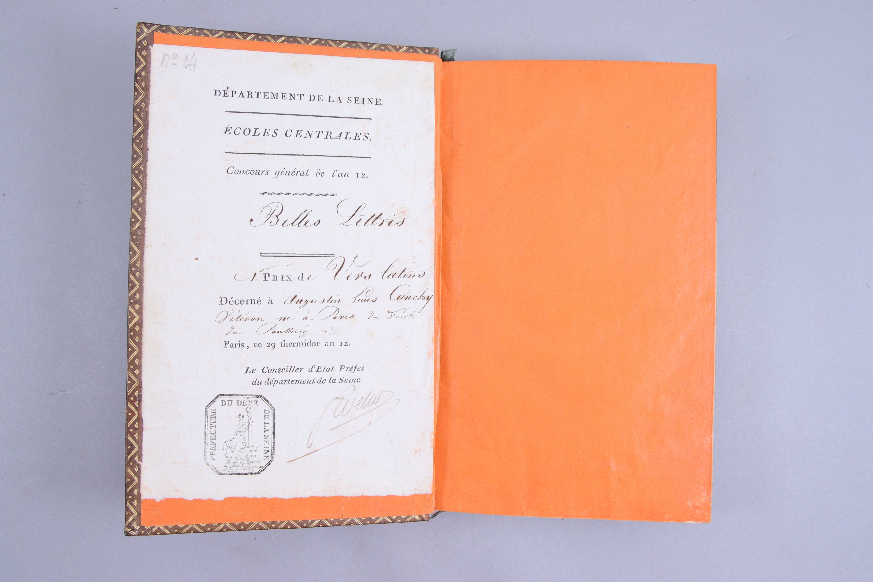 Très bel exemplaire. Ex-praemio contrecollé sur la première garde : l'ouvrage a été remis en prix au Concours Général de l'An XII, section Belles Lettres, vers latins, à Augustin Louis Cauchy "de l'Ecole du Panthéon".
