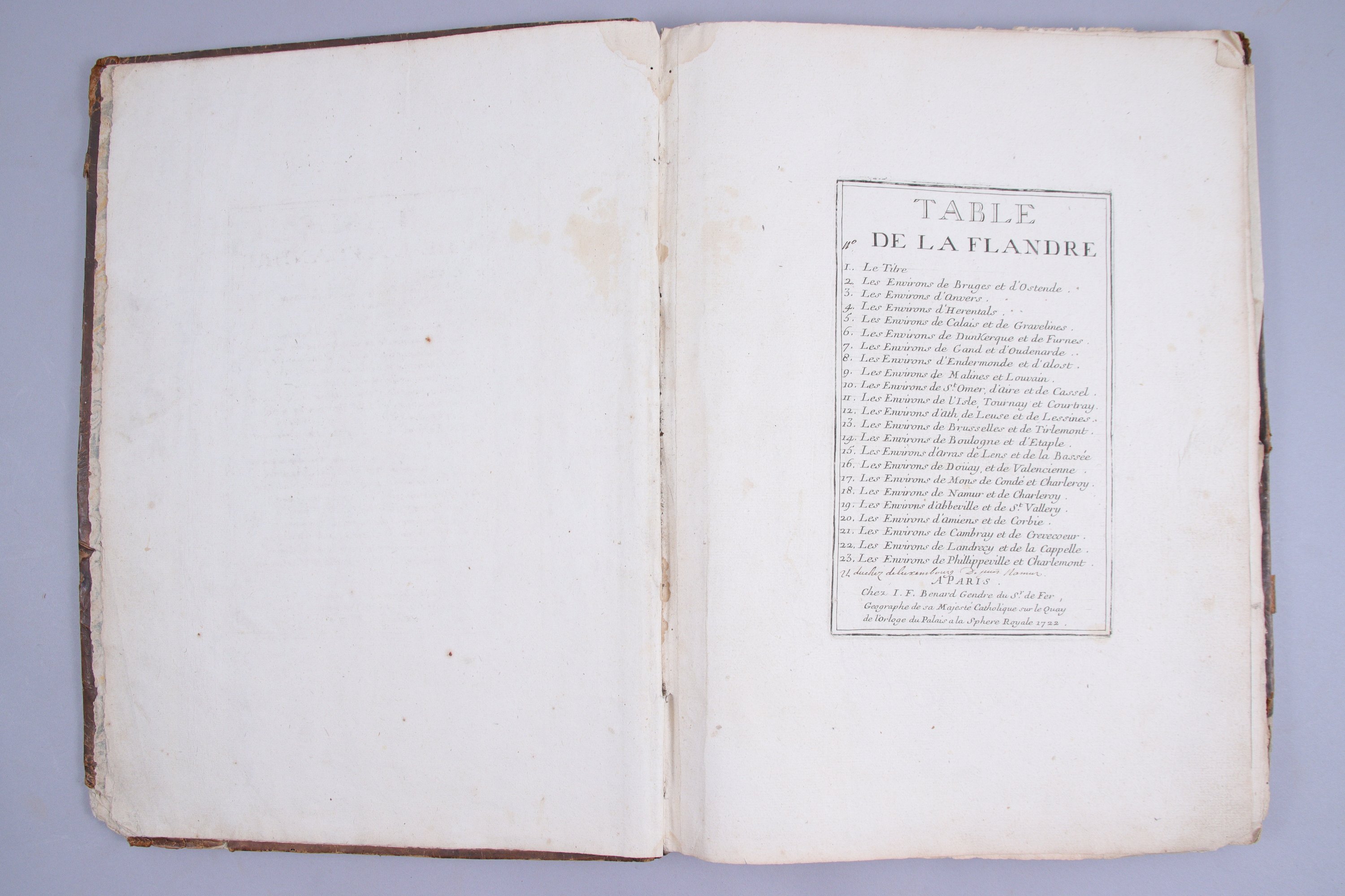 In-folio (375 X 270 mm). Titre avec liste des planches. Titre gravé par Starckman, sur double page. 24 cartes doubles en noir et blanc. Veau du temps. (Reliure très endommagée. Cinq des cartes sont froissées ou chiffonnées, salies, ou déchirées avec ou sans manque).