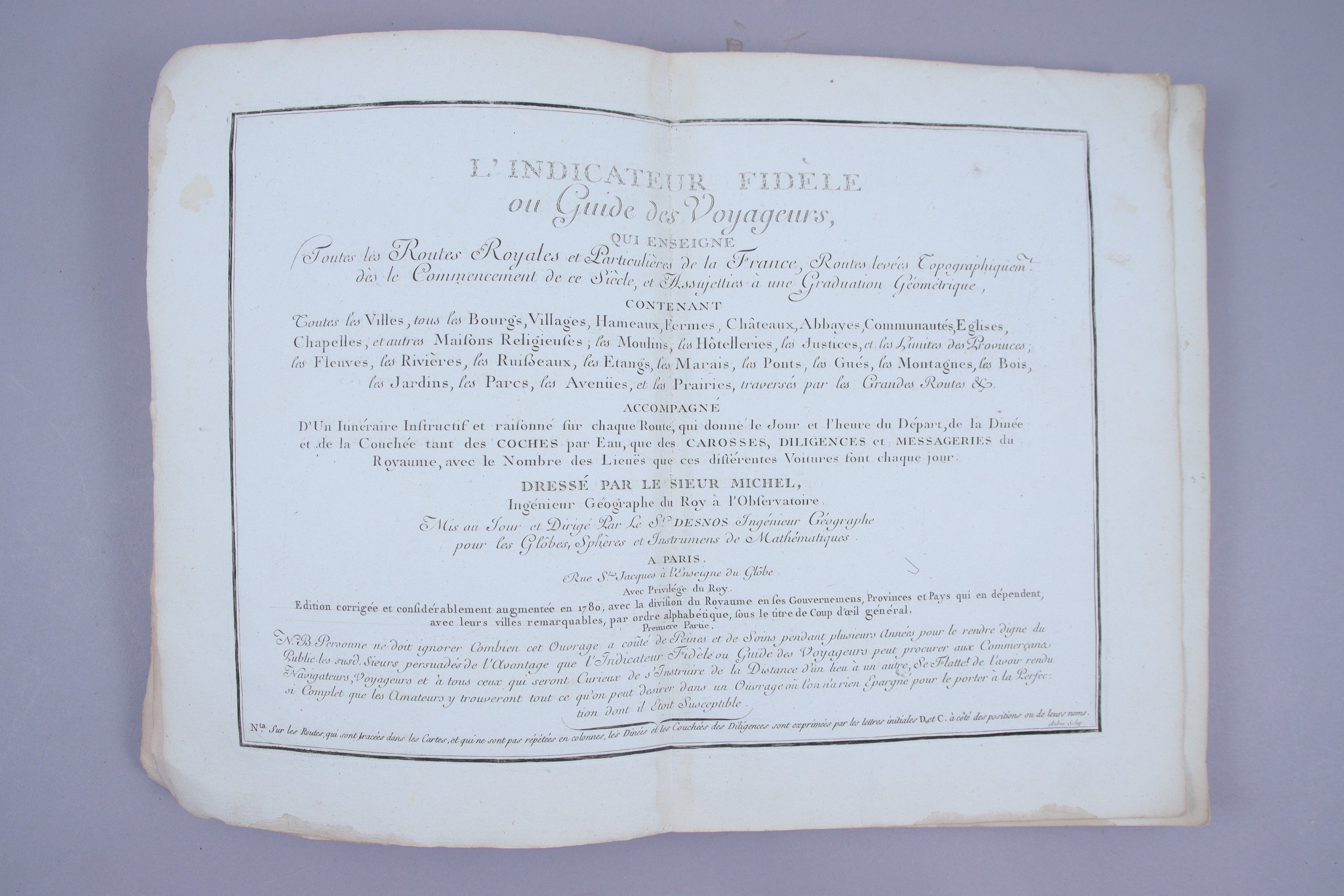 Ce guide des voyageurs est complet pour la France y compris des cartes numérotées 14 à 18, décrites dans l'Avis, à la fin du Prospectus, comme cartes supplémentaires. Un second volume, consacré aux routes des royaumes étrangers, était en vente chez Desnos en 1780.