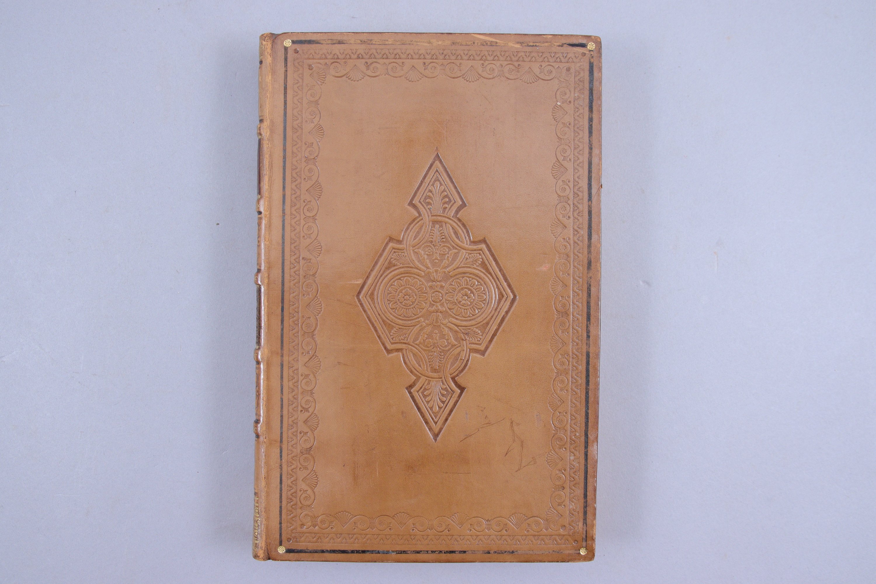 In-8, plein veau fauve. Encadrement d'un filet noir, dans lequel s'inscrivent deux roulettes de palmettes ; large plaque d'arabesques frappées à froid au centre des plats. Dos très orné de décors à chaud et à froid. Toutes tranches dorées. Fine roulette sur les coupes. Roulette de fleurs de lotus stylisées sur les chasses. Reliure signée Thouvenin en queue. (Petits effacements du filet noir. Rousseurs sur le titre).