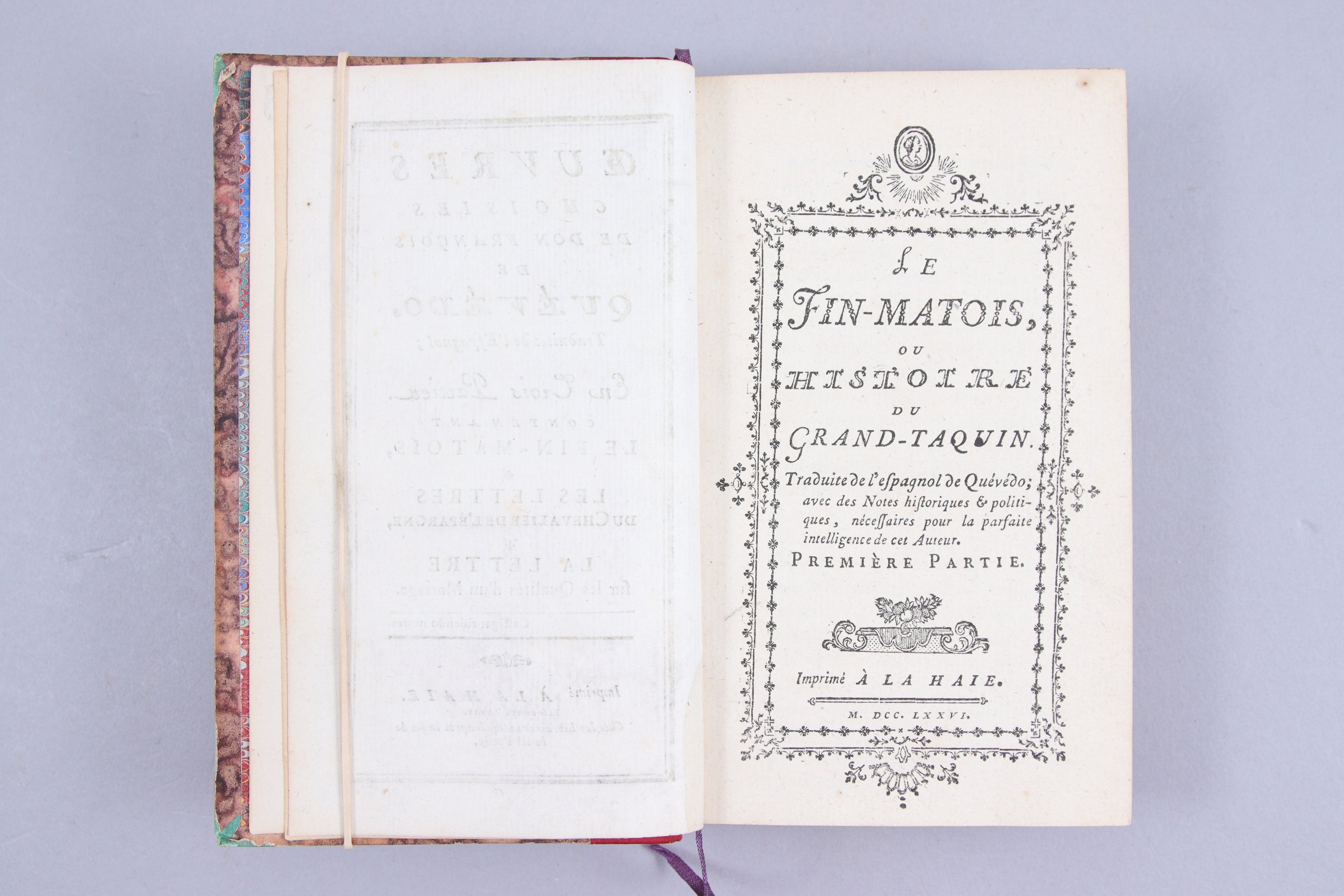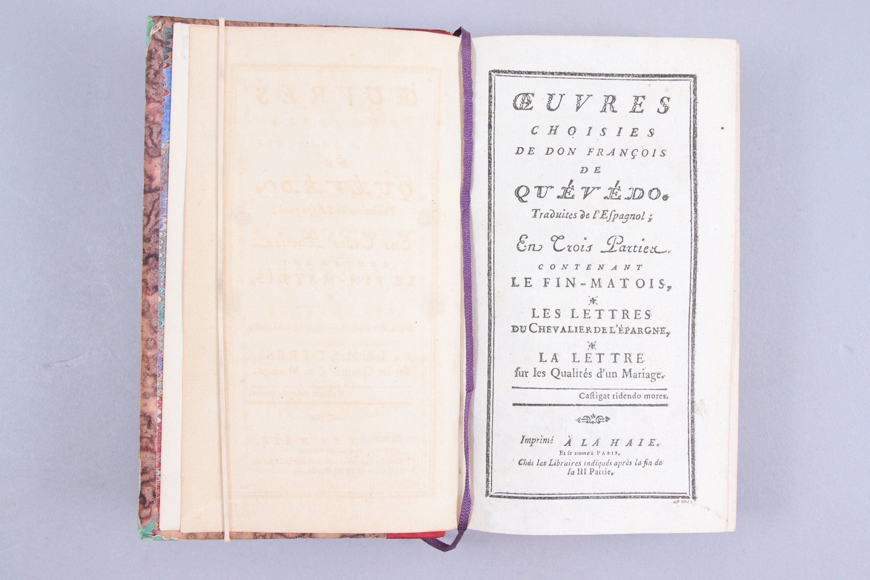 Edition originale. Bien que datée 1776, elle parut en juin 1775, avec le titre général, placé avant le titre du tome I : « uvres choisies de Don François de Quévédo