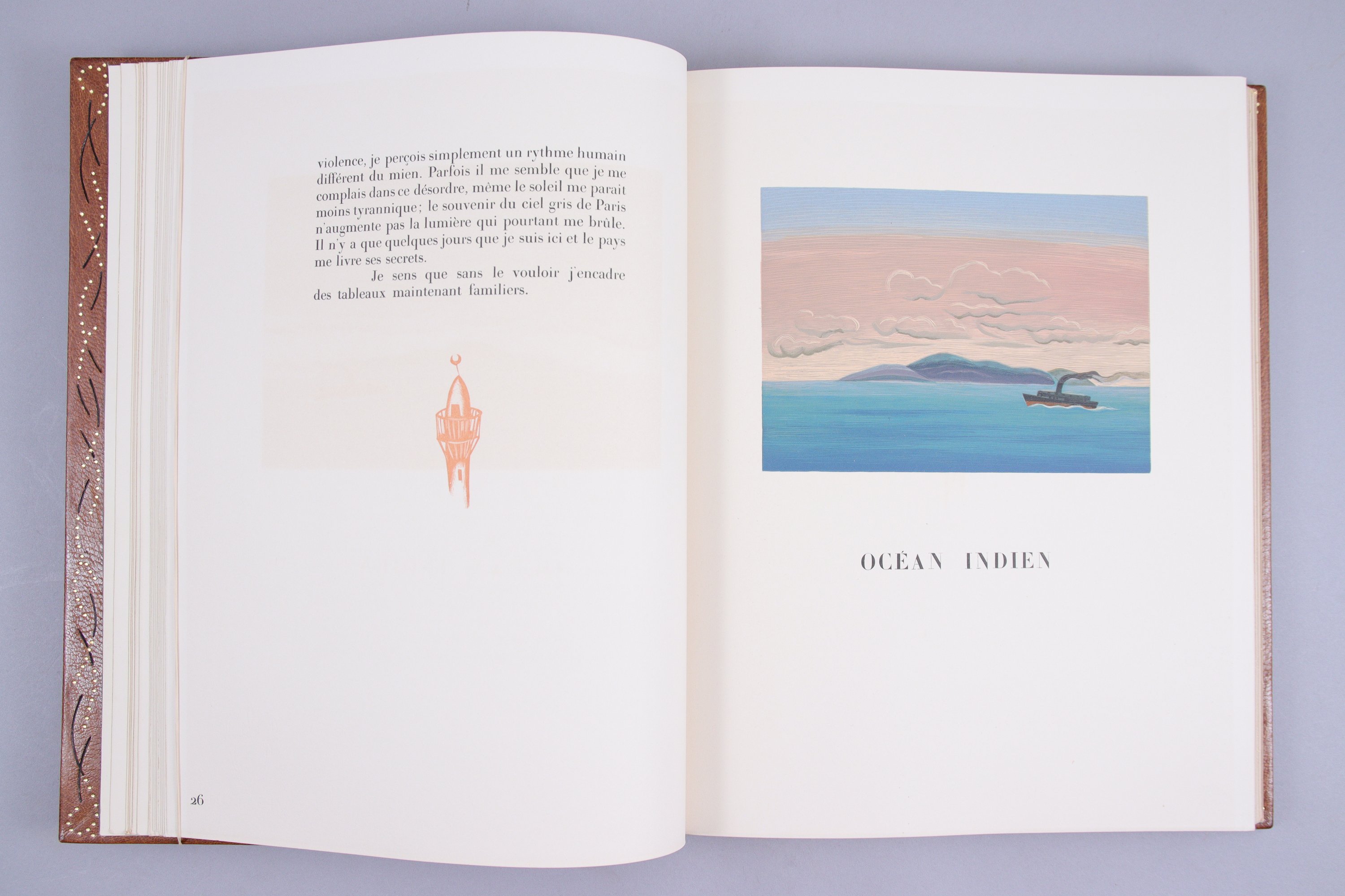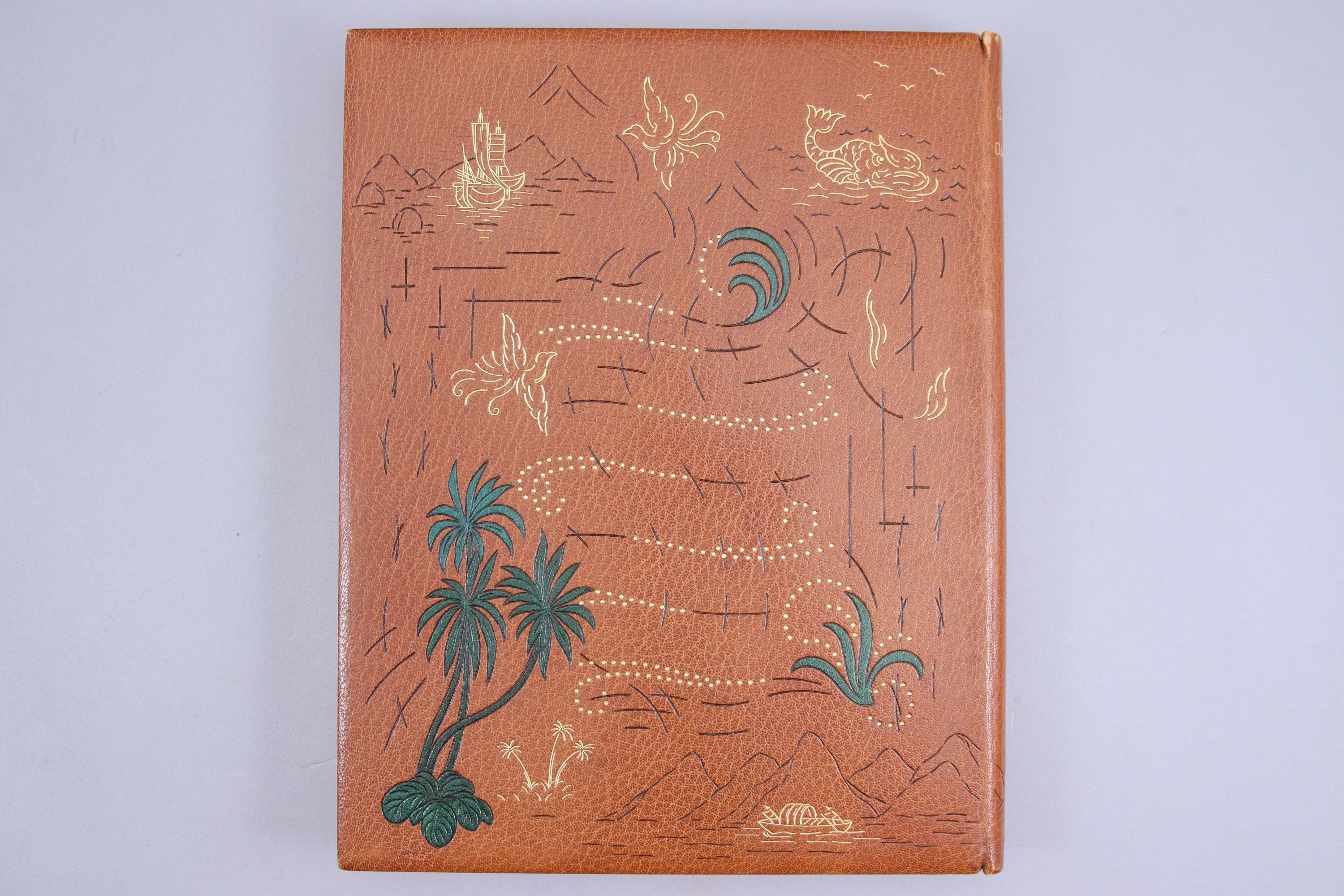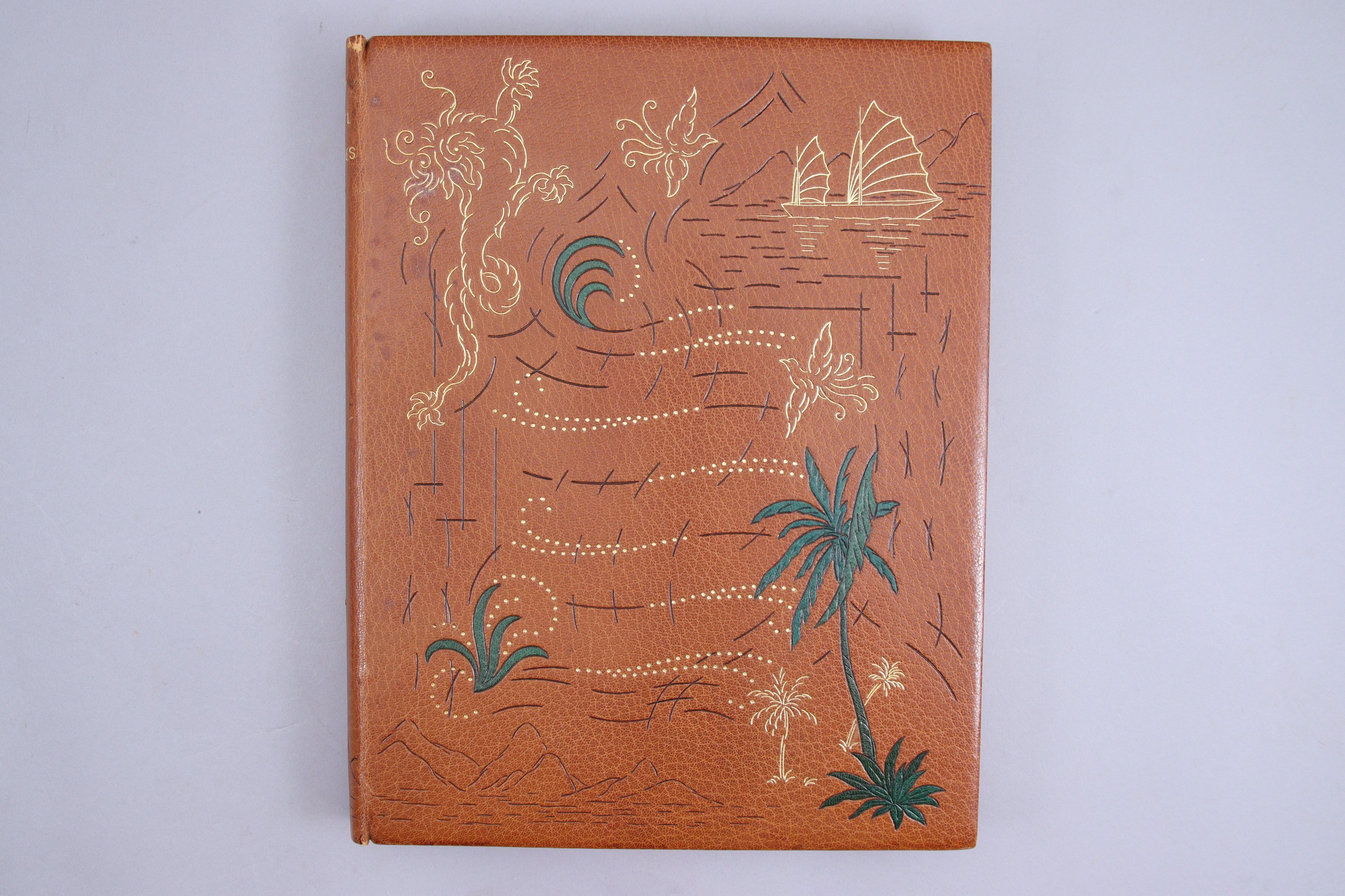 Grand in-4° (345 X 270 mm). Plein maroquin havane mosaïqué ; décor mosaïqué de palmiers ; décor à froid de paysages montagneux ; décor à chaud de jonques, d'un dragon, et d'oiseaux de Paradis. Large bande intérieure, gardes de moire. Toutes tranches dorées. Etui avec coupes de maroquin havane. Reliure signée Gruel. (Etui frotté en tête et en queue).
