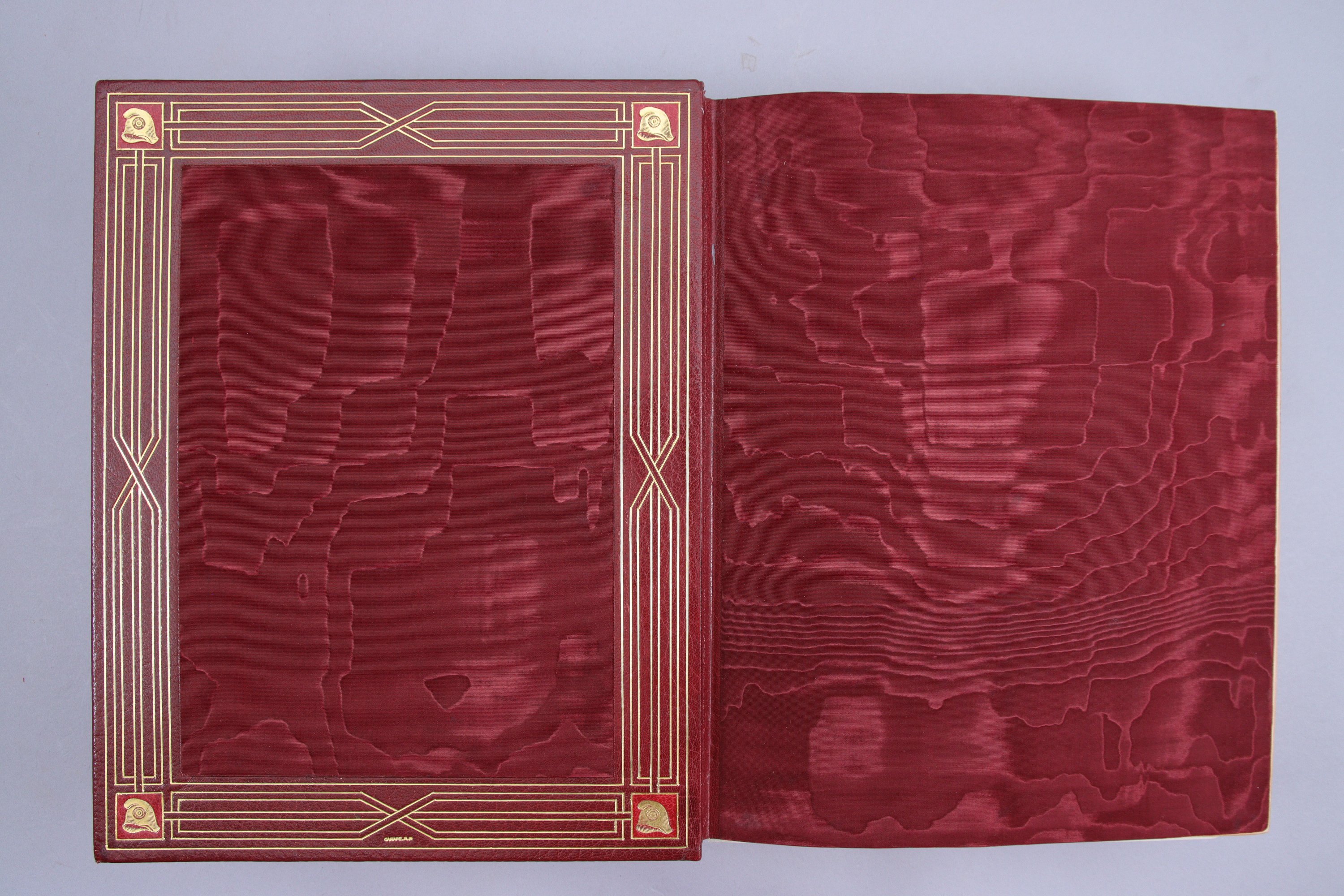 In-4°, plein maroquin mosaïqué bordeaux ; décor de grille sur les plats et le dos. Large décor intérieur composé de 8 filets droits, délimitant dans les angles un carré orné d'un bonnet phrygien poussé à l'or sur fond de maroquin rouge coquelicot ; gardes de moire. Toutes tranches dorées. Couvertures conservées. Chemise de 1/2 maroquin bordeaux, intérieur de veau beige ; étui avec coupes de maroquin bordeaux (Etui endommagé. Rousseurs sur la deuxième garde volante provoquée par le report d'un ex-libris placée au verso de la première garde volante)
