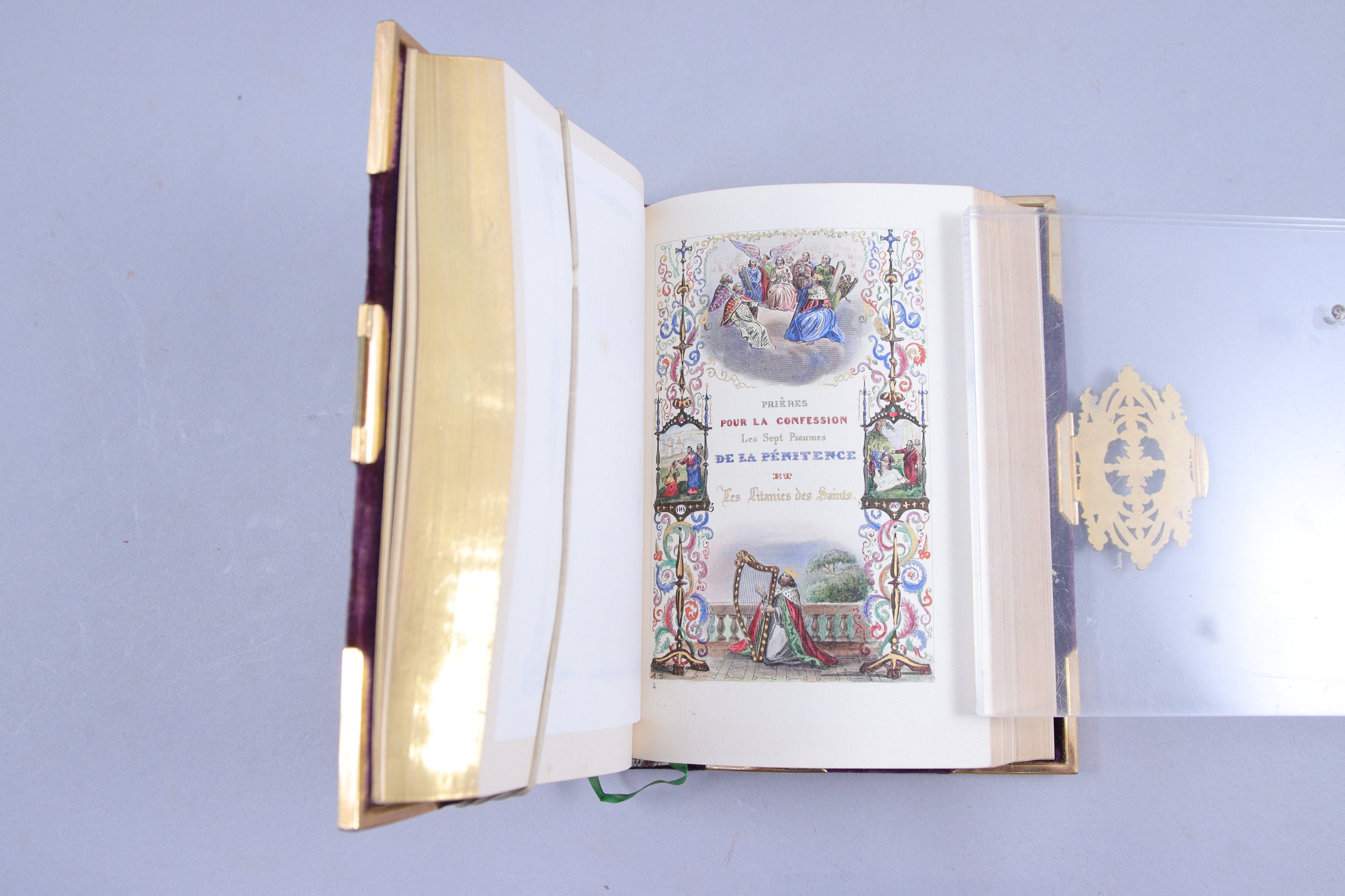Petit in-8, 596 pages. Plein velours cramoisi, 4 écoinçons de laiton doré composés d'arabesques au centre desquelles figure un angelot ; 3 pièces de laiton doré au dos, l'une d'entre elles portant le titre ; très riche fermoir complet de ses 3 parties en laiton doré. Toutes tranches dorées. Gardes de moire. Chemise et étui. (Quelques menus défauts à la chemise et à l'étui).