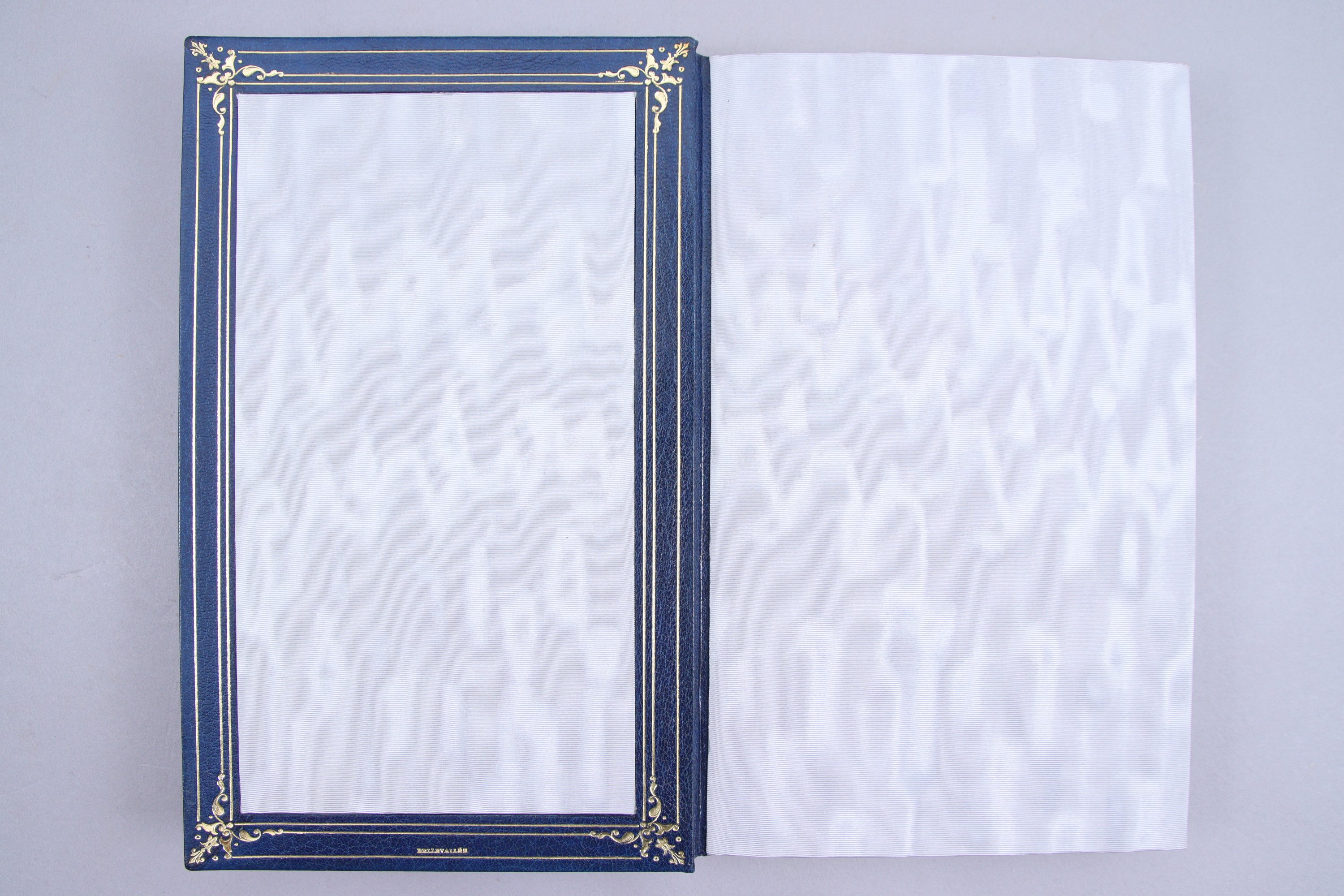 Grand in-8, plein maroquin janséniste à gros grains bleu-nuit, filets sur les coiffes et sur les coins. Large encadrement intérieur de maroquin bleu nuit orné de 3 filets droits et de fers dans les angles ; gardes de moire. Tête dorée. Couvertures et dos conservés. Etui bordé de maroquin.