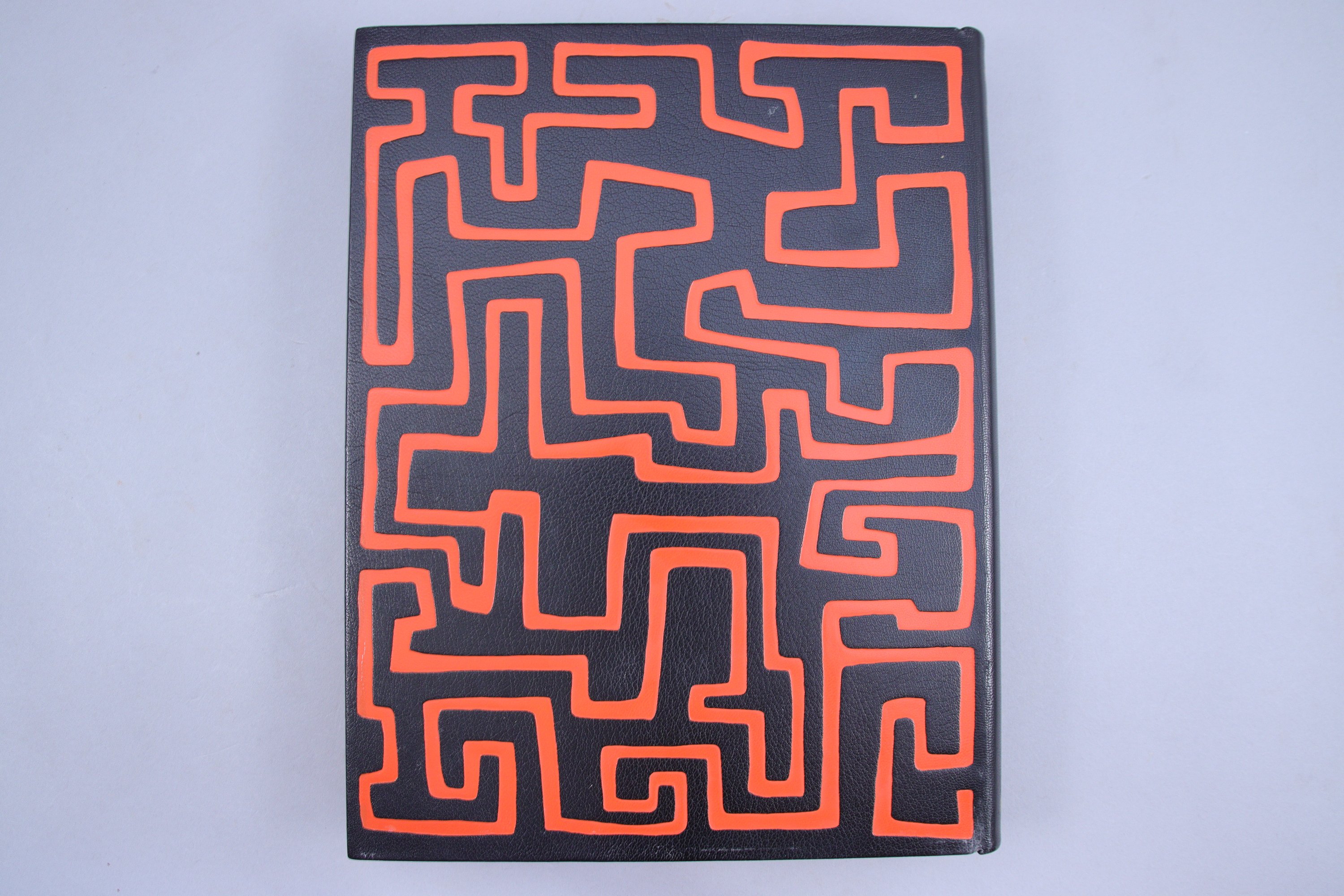 In-4°, plein maroquin noir mosaïqué d'une bande de veau rouge figurant un dédale, orné de fers dorés en forme de coeurs. Tête dorée. Couvertures conservées. Etui. Reliure de l'éditeur.