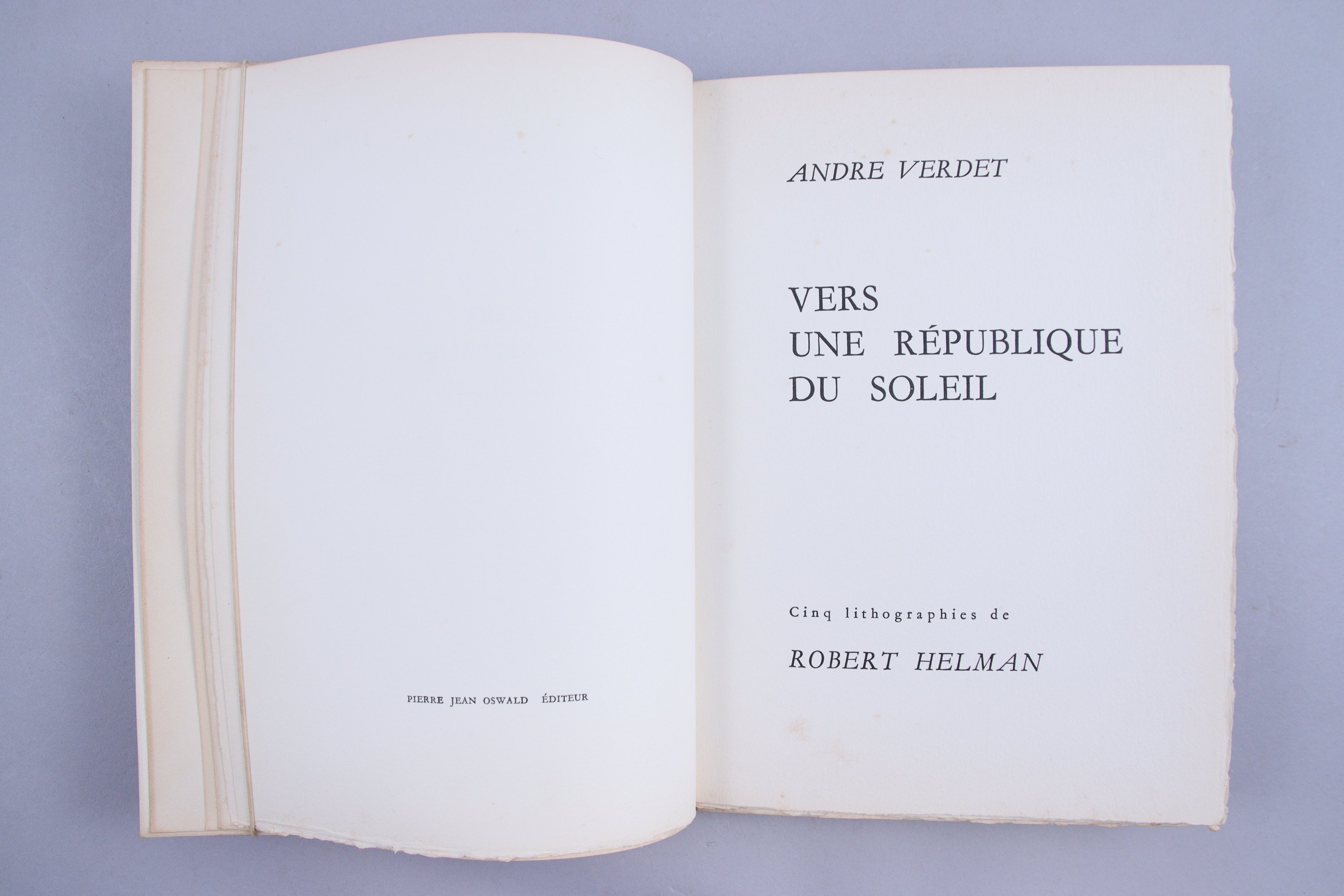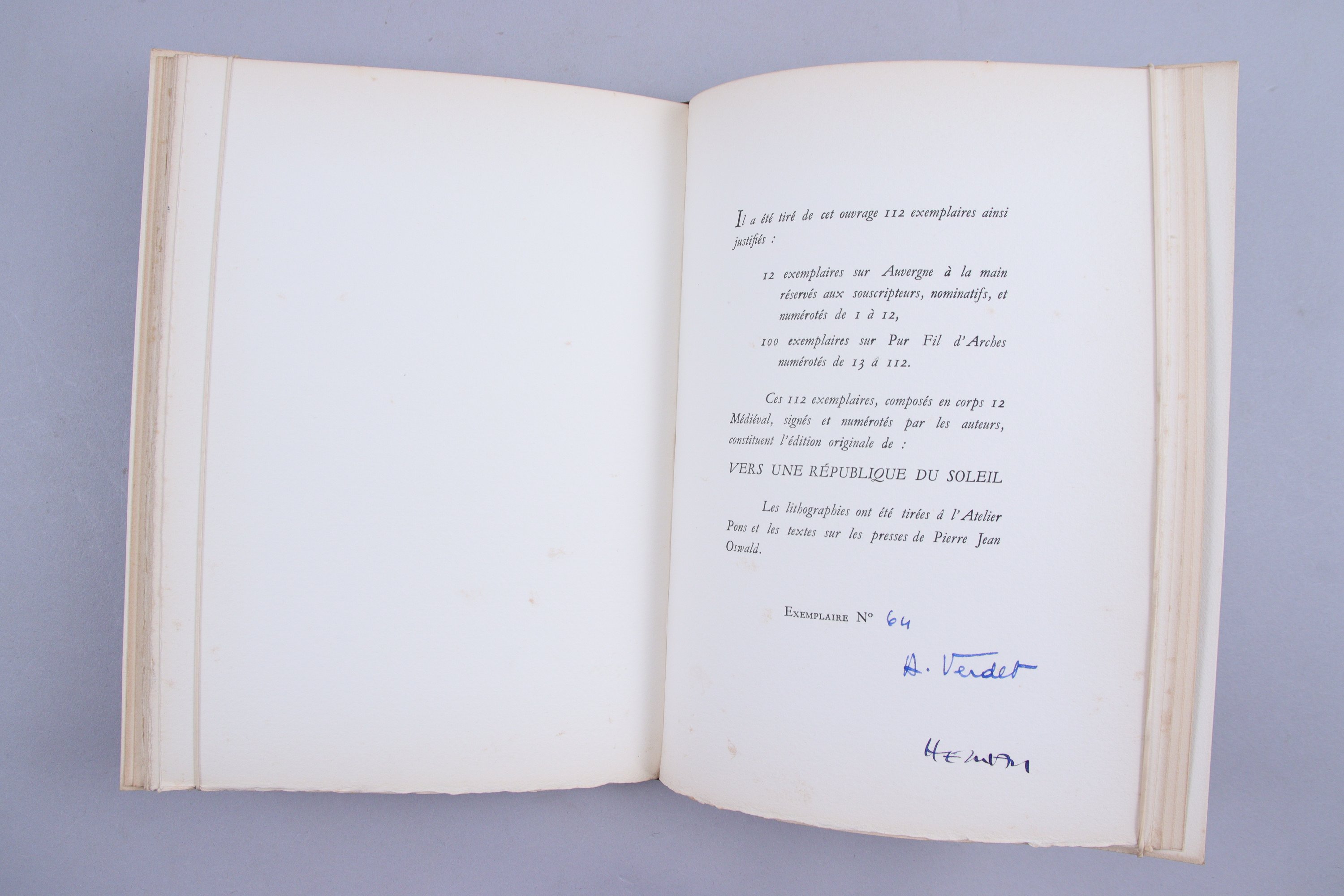 Edition originale de ces puissants poèmes. Tirage à 112 exemplaires seulement, celui-ci, n°64, un des 100 sur pur fil d'Arches. Exemplaire signé par Verdet et Helman.