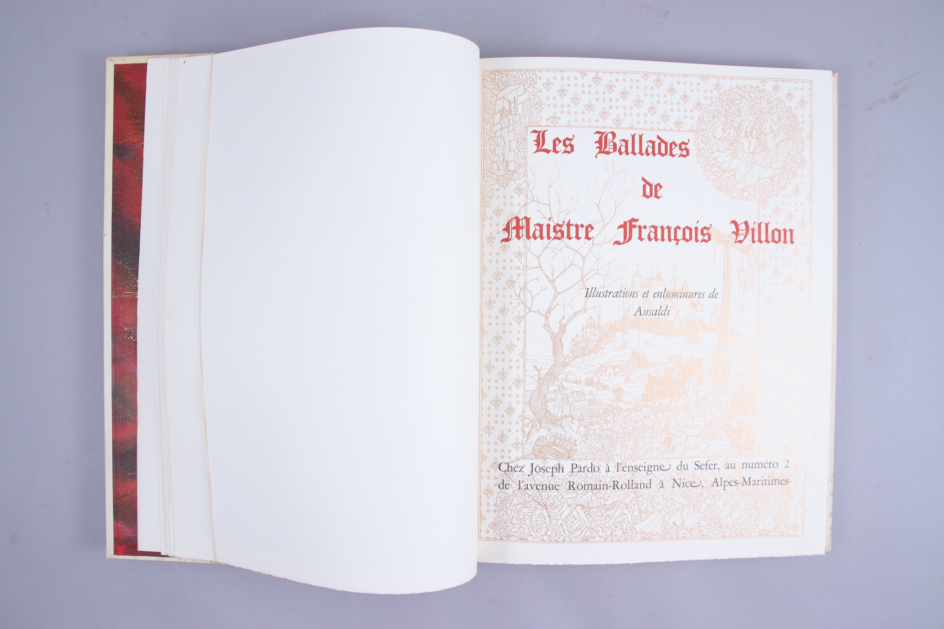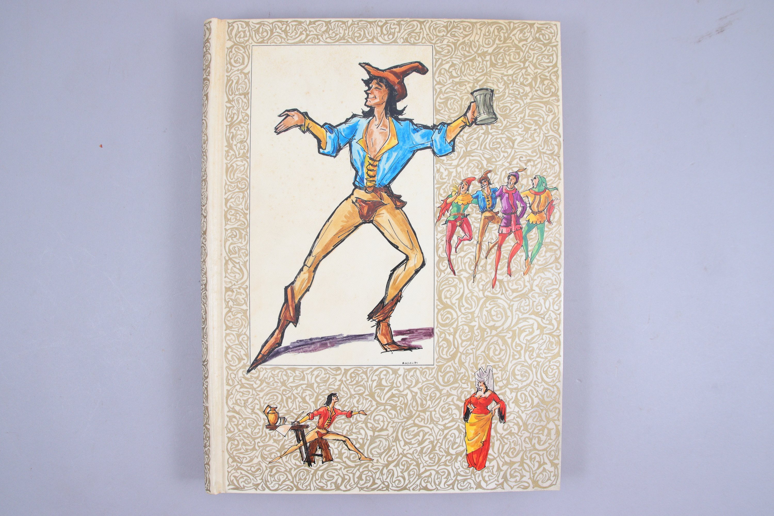 Grand in-4°, plein vélin rigide décoré sur les plats de grandes miniatures appliquées en couleurs, et signées Ansaldi. Reliure de l'éditeur.
