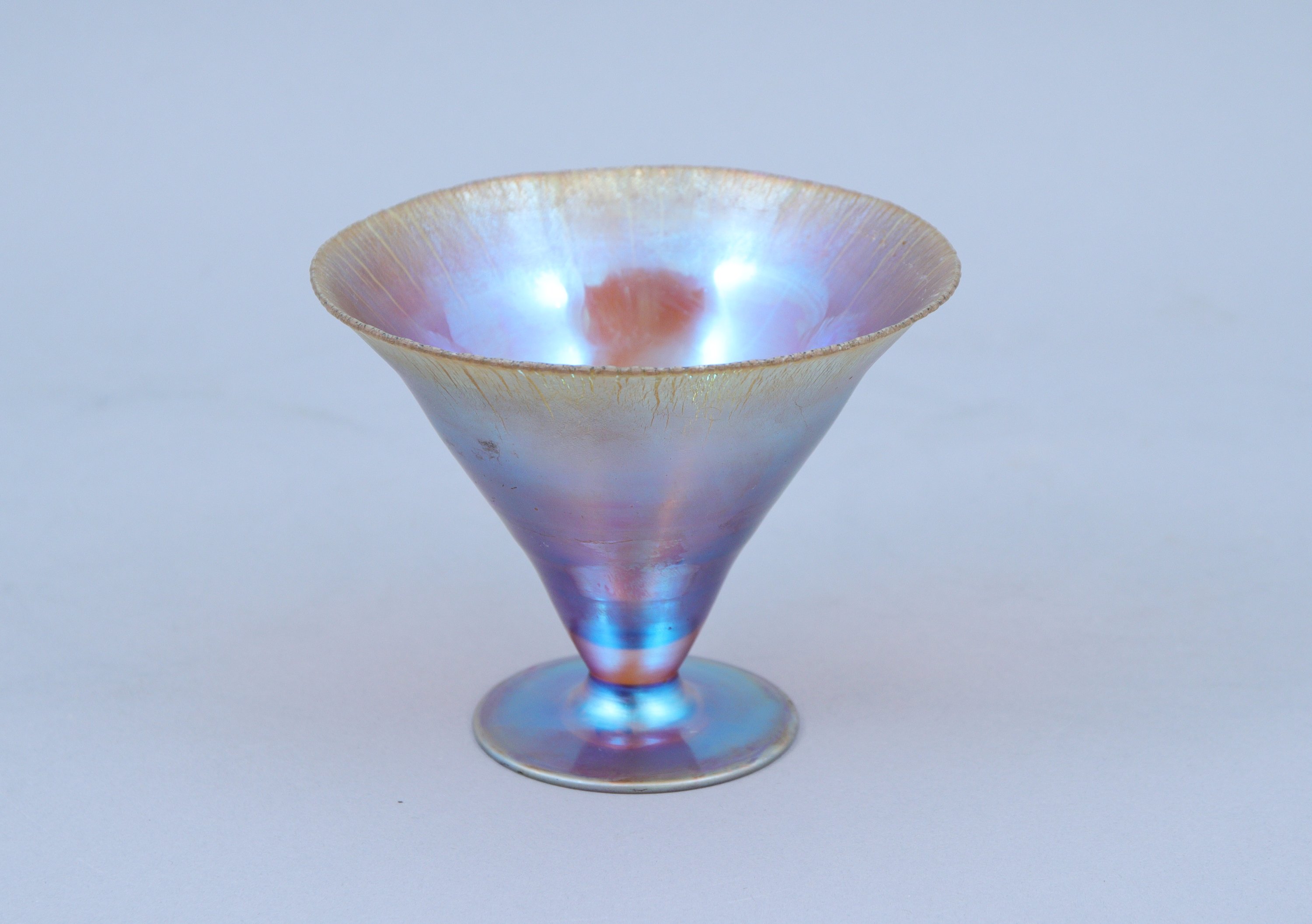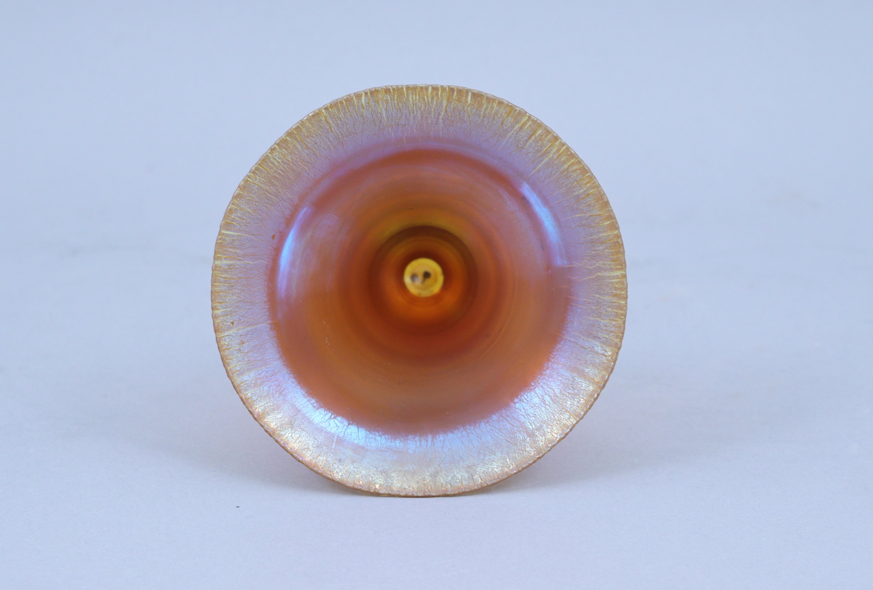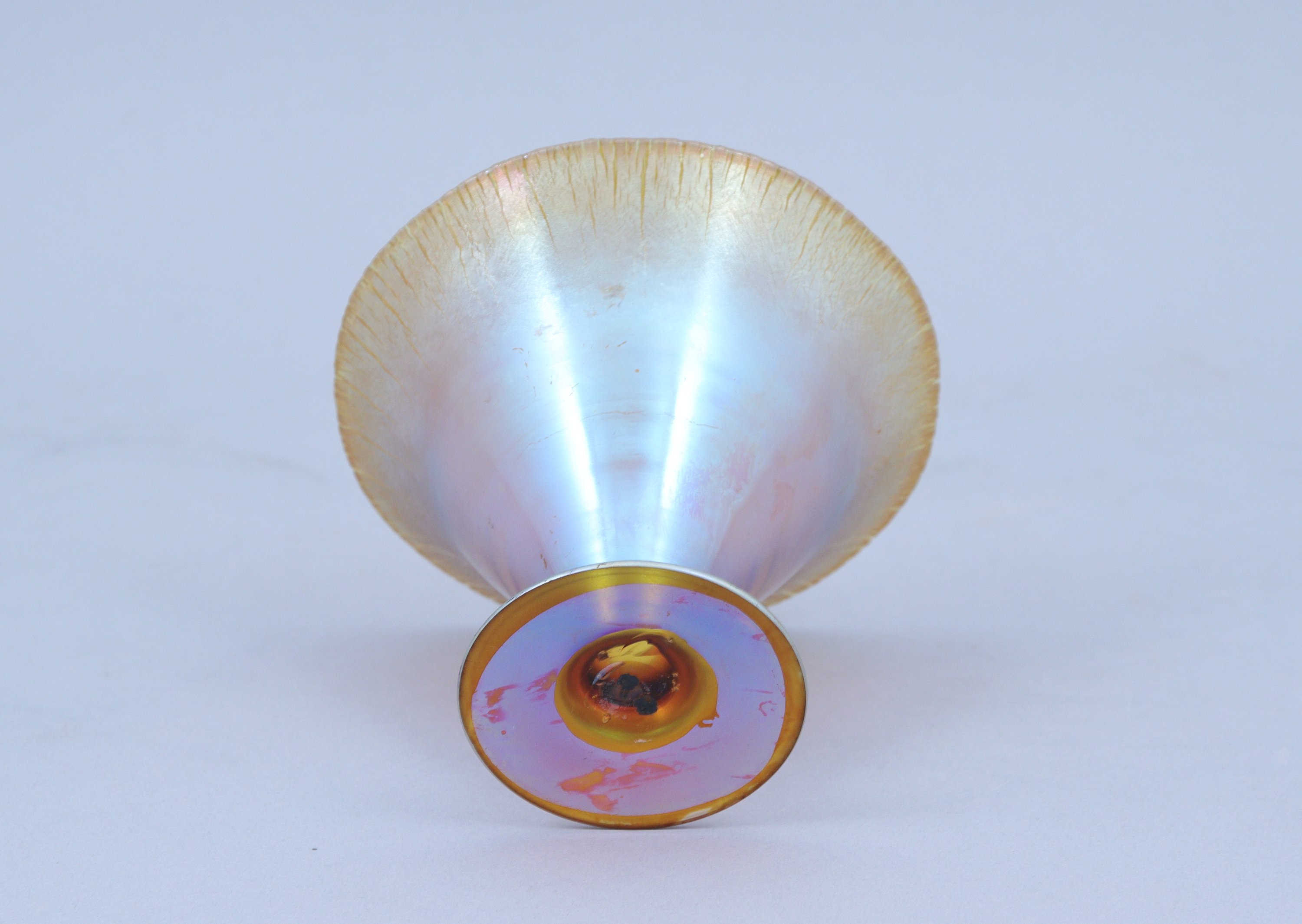 en cristal soufflé à lustre métallique reposant sur un pied circulaire.