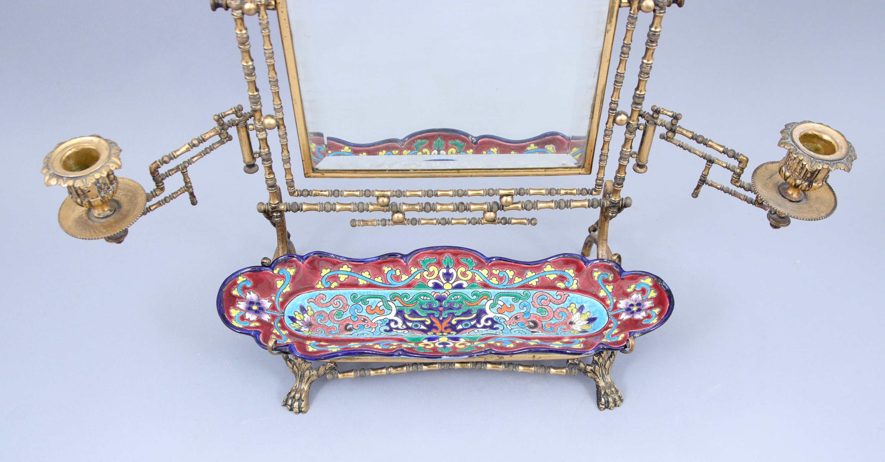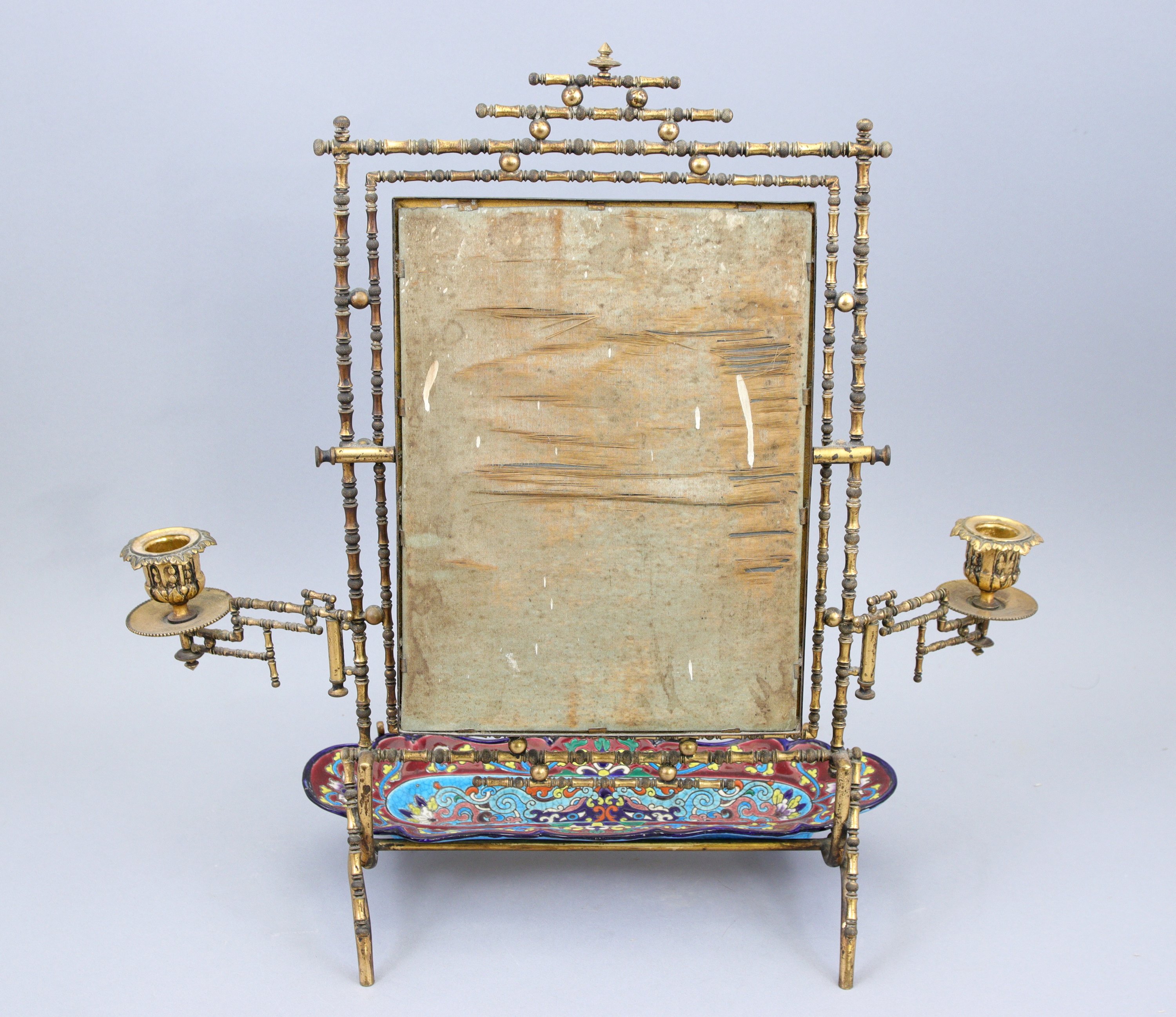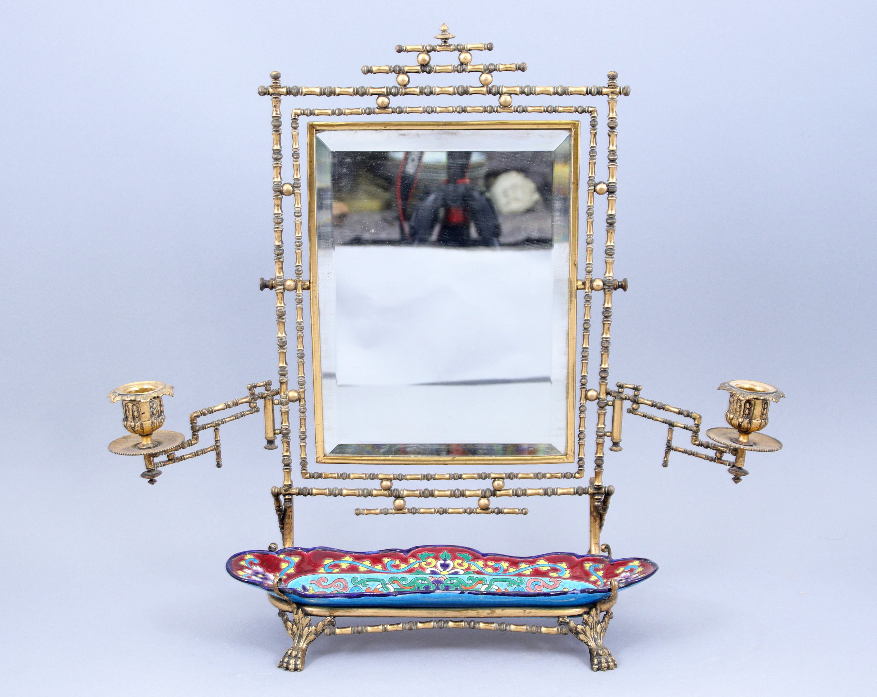 en bronze et émaux de Longwy. La glace biseautée dans un encadrement à fronton à l'imitation du bambou. Deux bougeoirs mobiles, la cuvette à décor d'entrelacs. Quatre pieds, dont les antérieurs à décor de griffes.