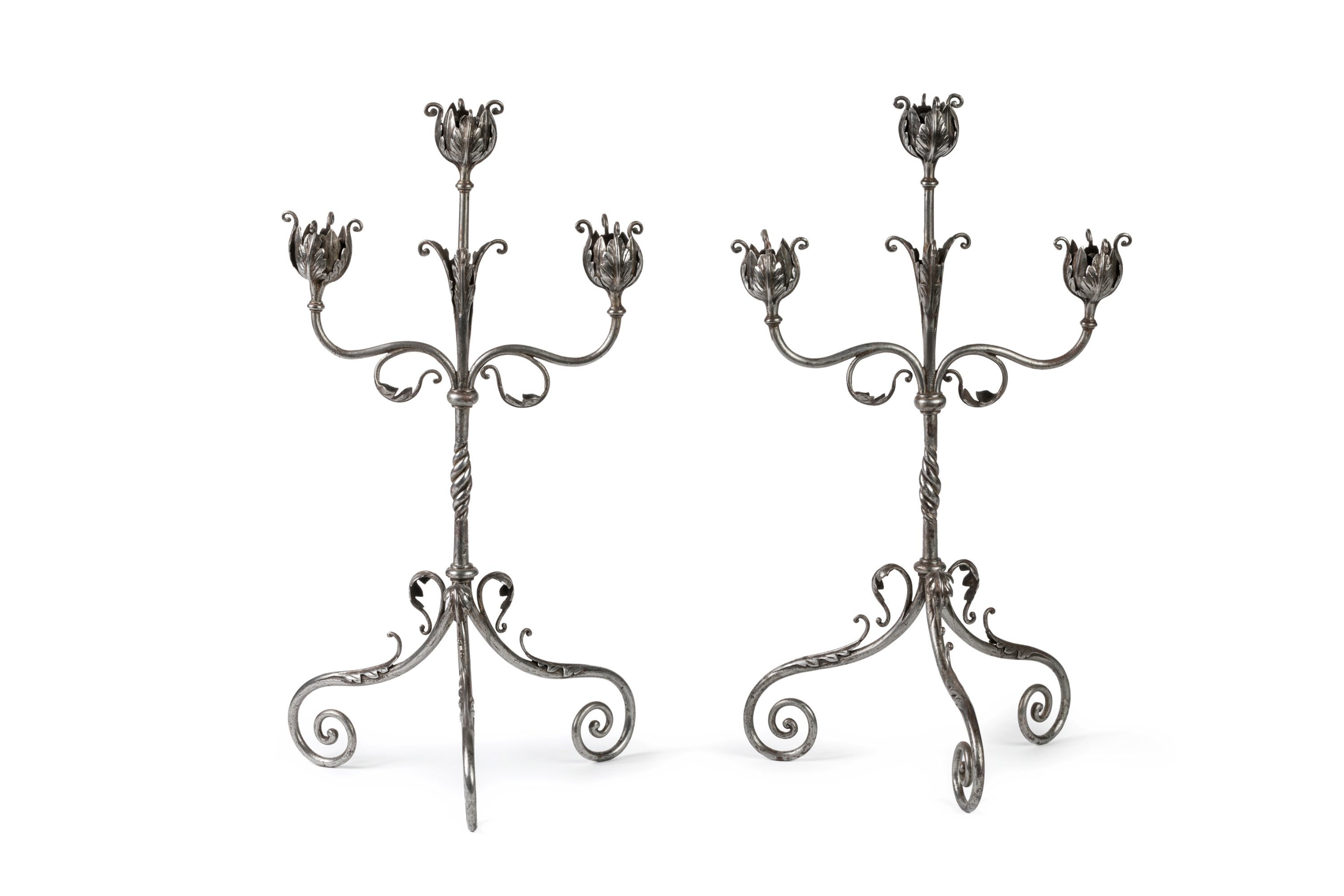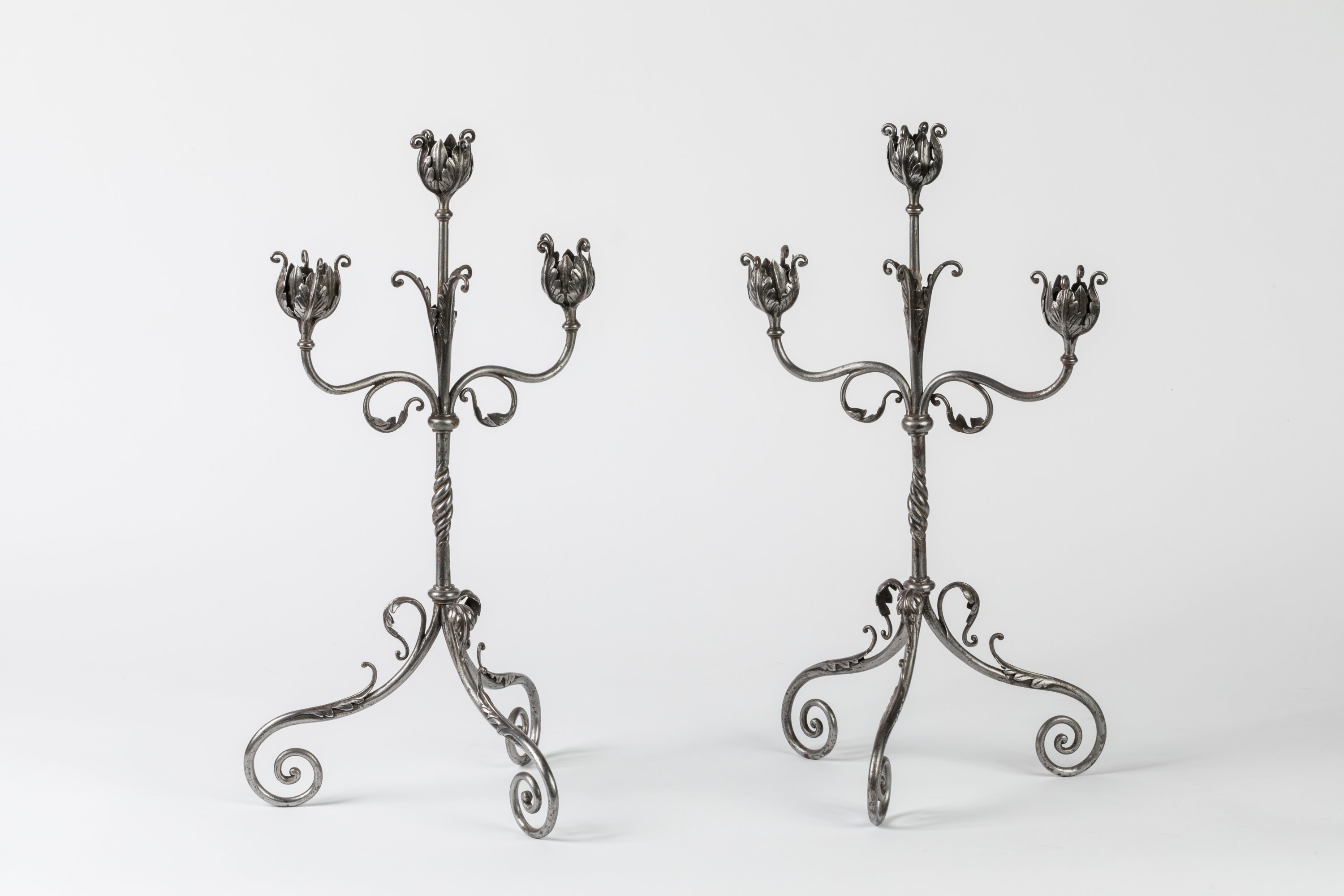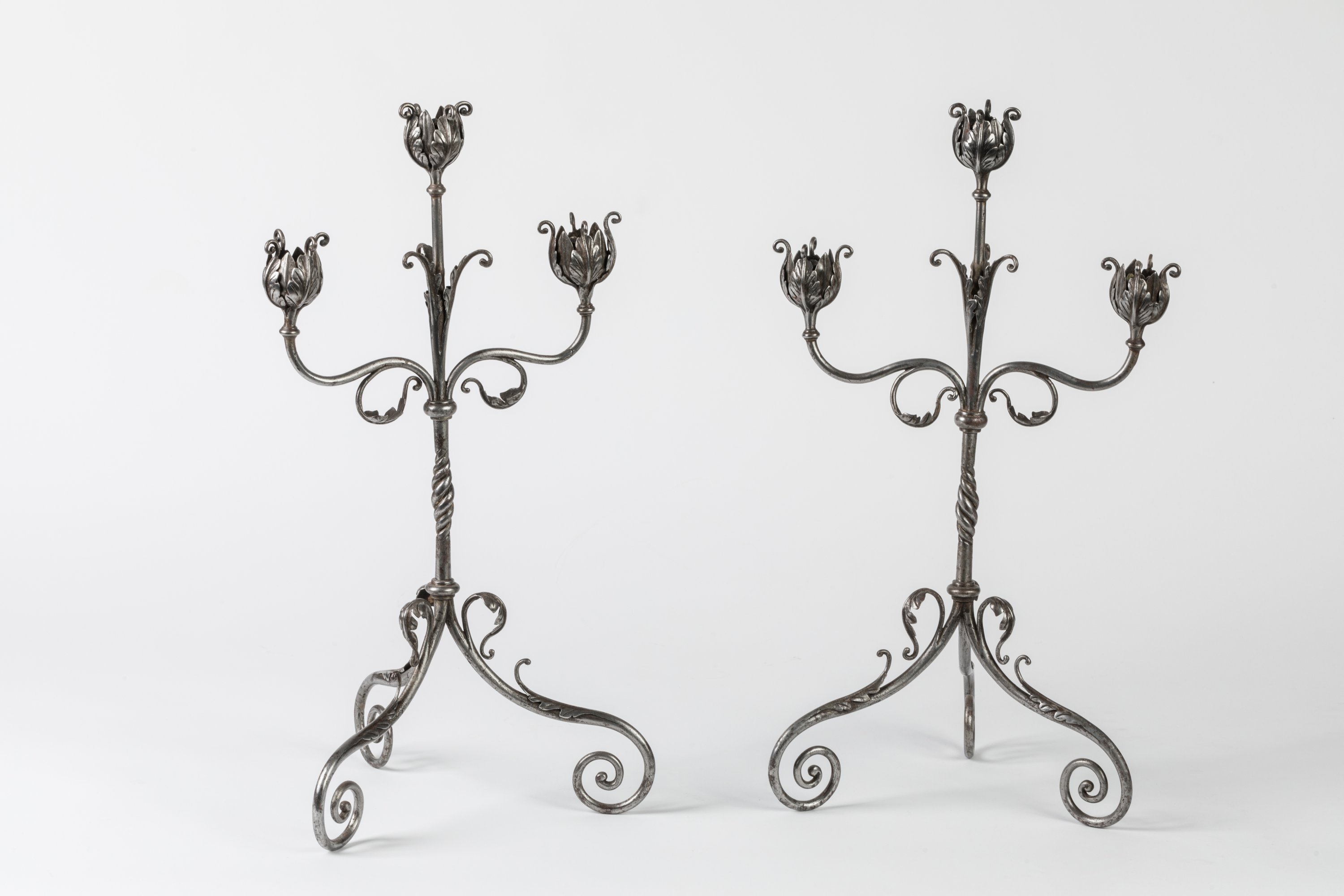 en fer forgé martelé, les binets à décor de feuilles d'acanthe se terminant en enroulements, le fût torsadé. Piètement tripode.