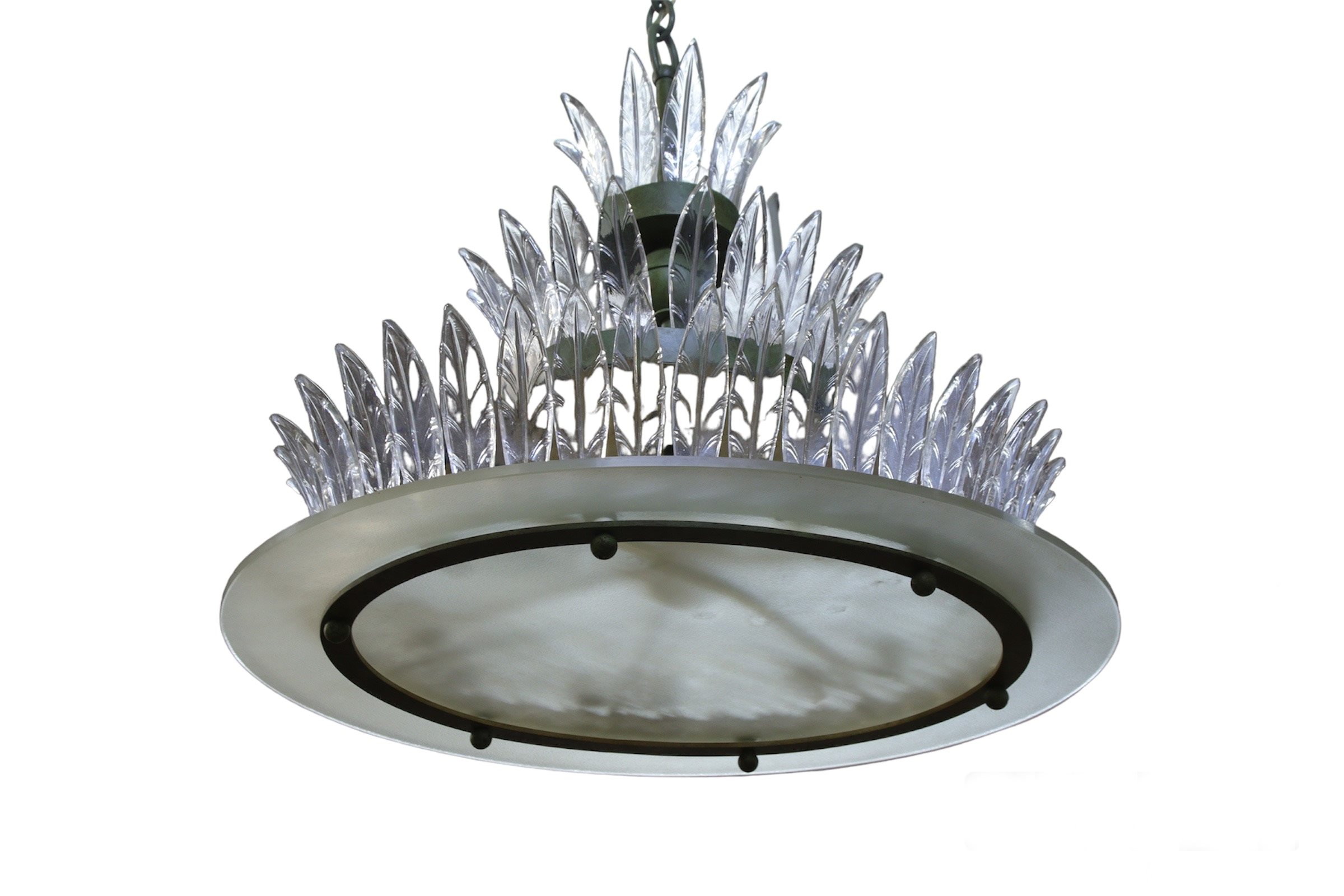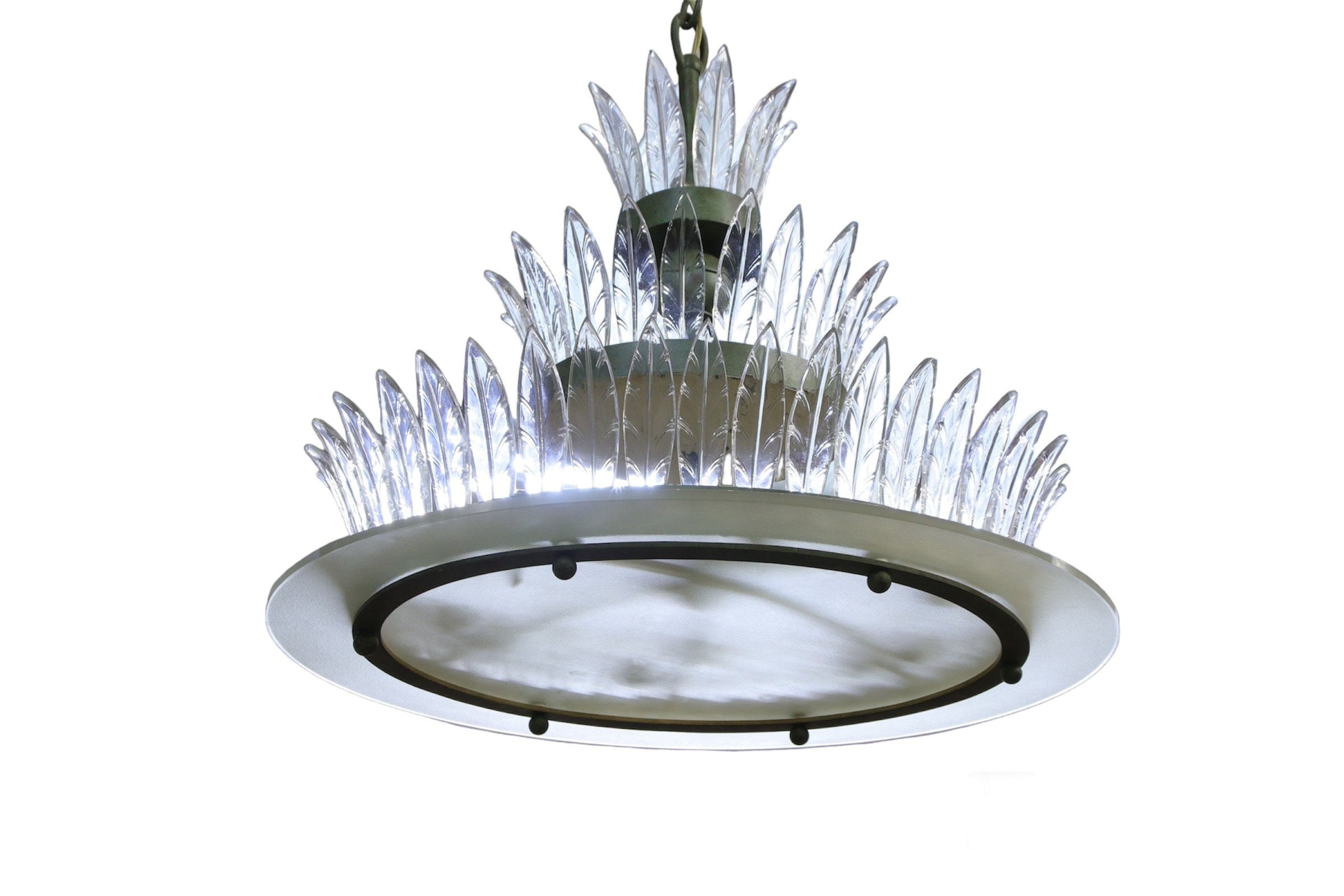 Travail d'inspiration Art Déco Grand lustre aux plumes à trois couronnes de plumes en verre...
