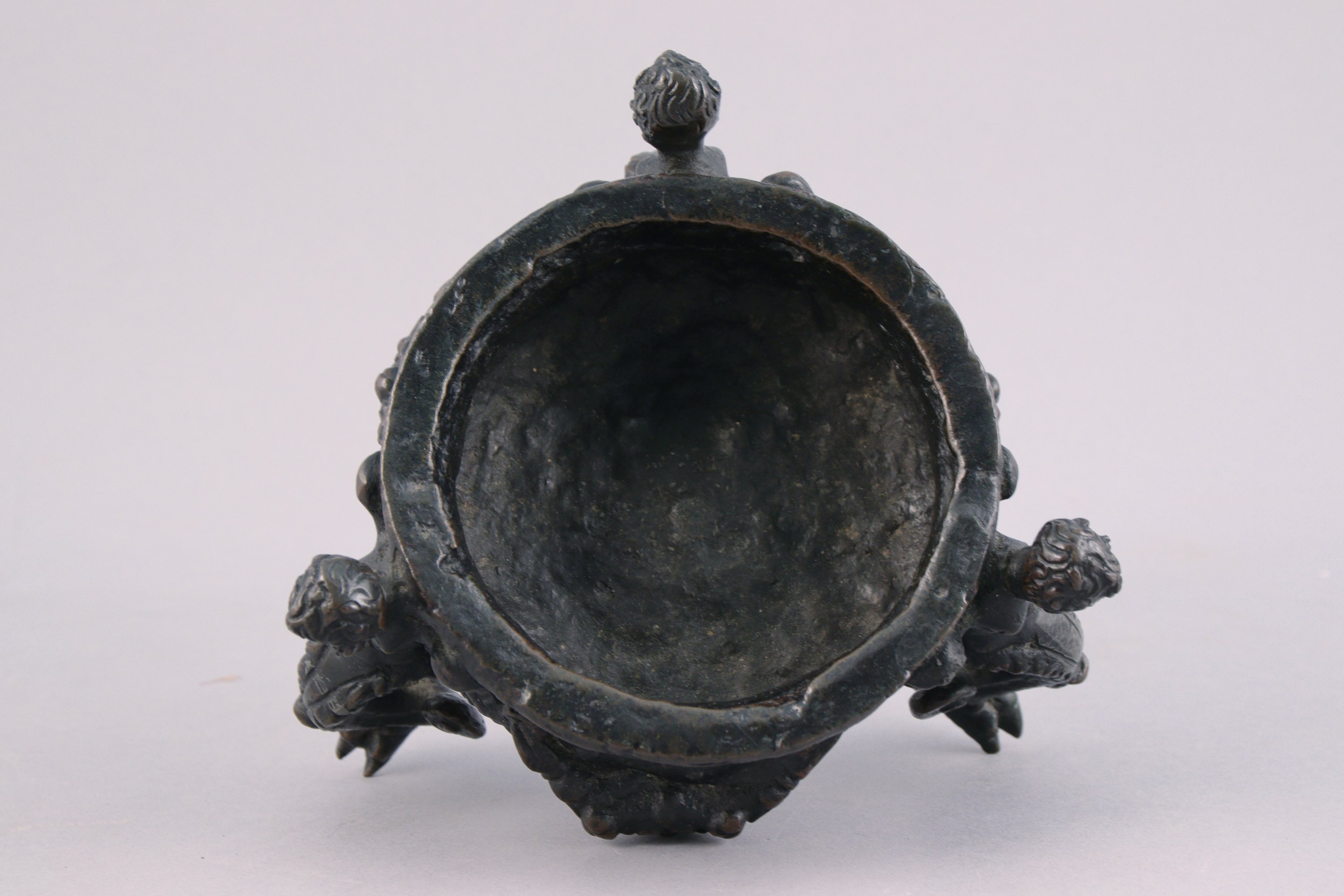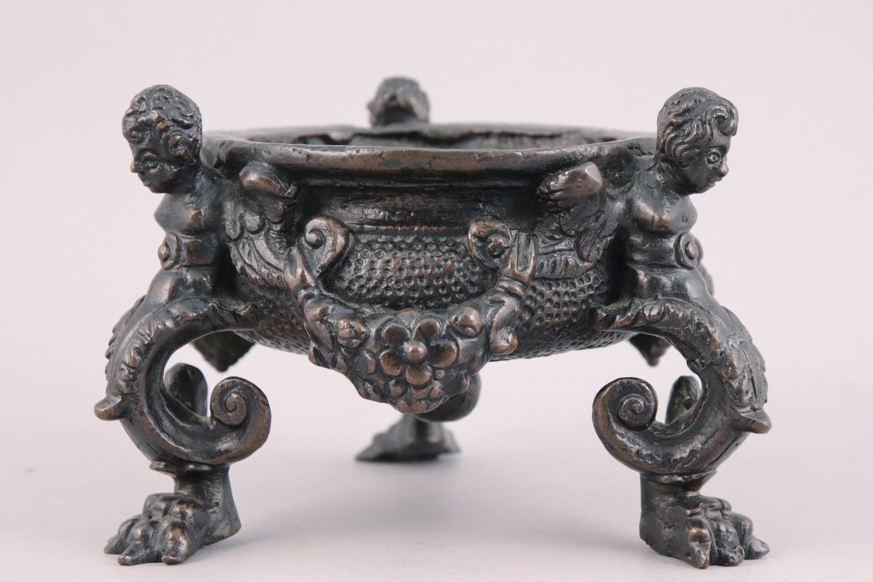 en bronze à patine noire à décor de putti au corps se terminant par un feuillage en volute et reposant sur une patte griffue, guirlande de fleurs sur le corps.