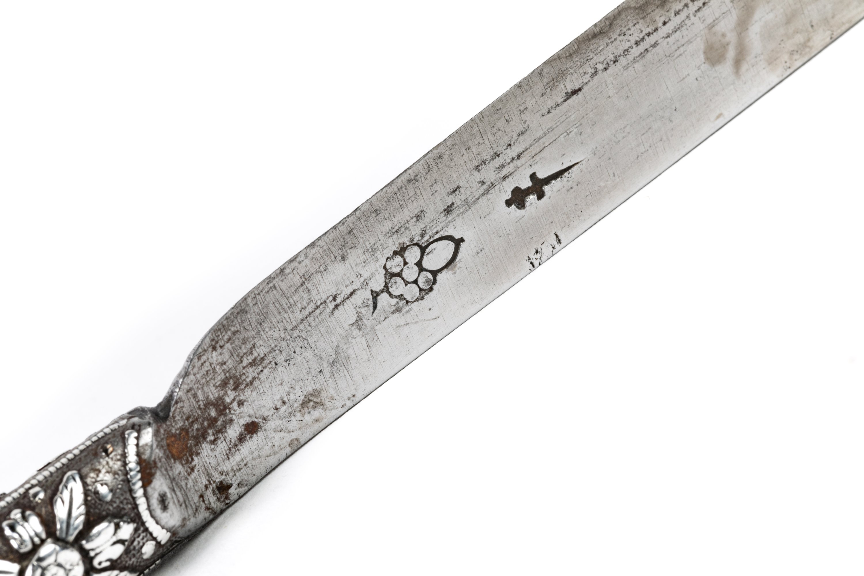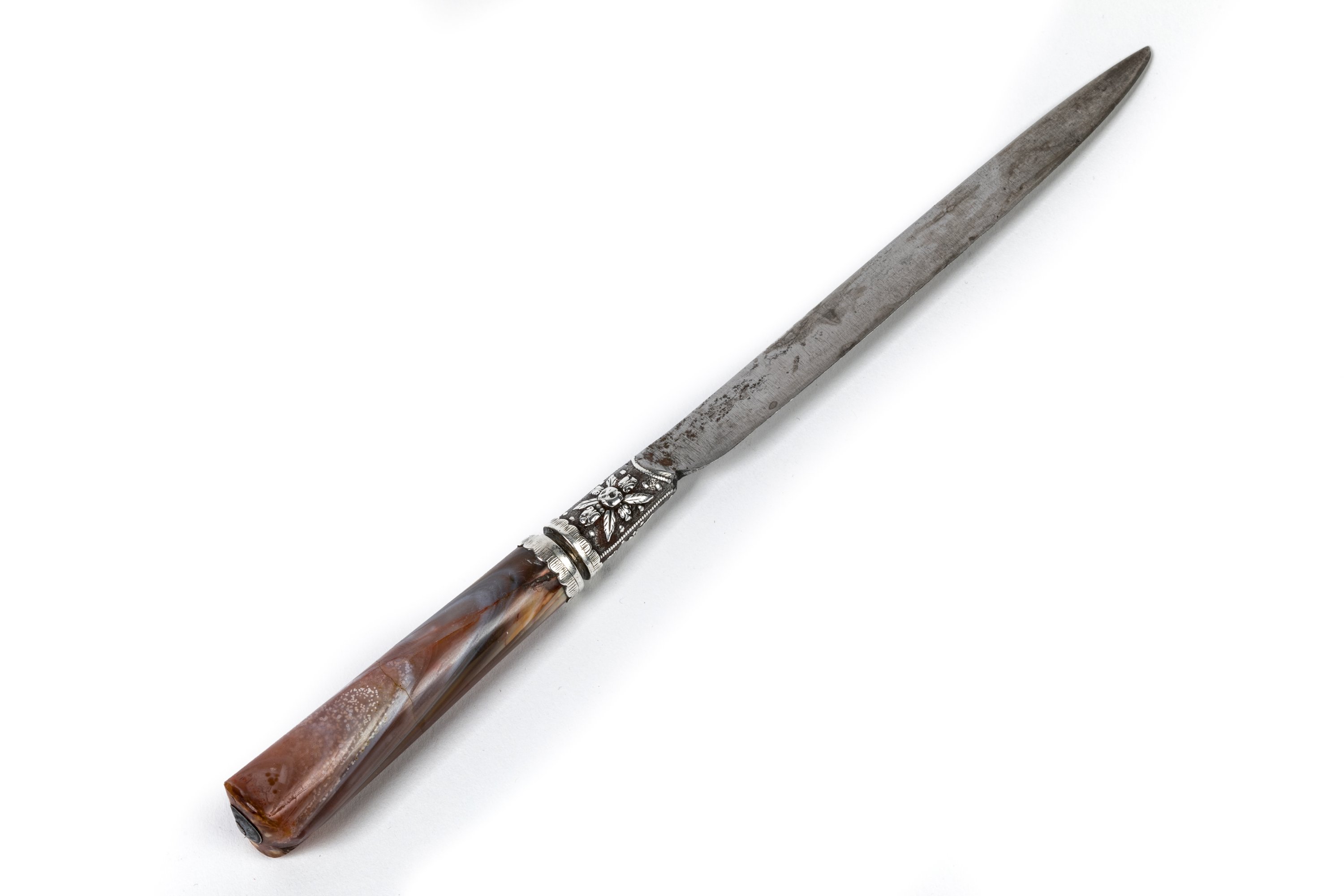 en agate, lame en acier à la base ornée d’un groupe de fruits et de feuilles, virole en argent.