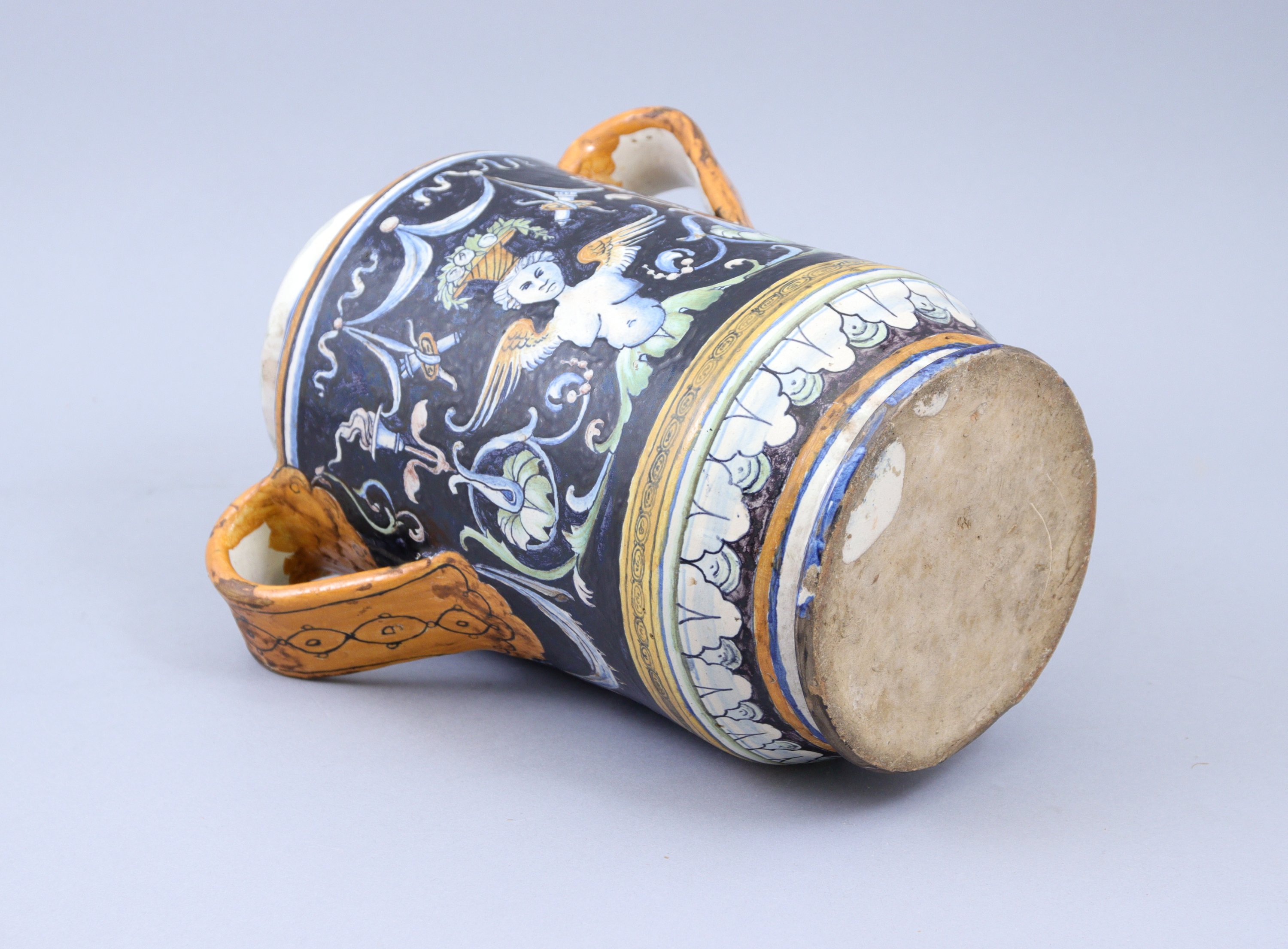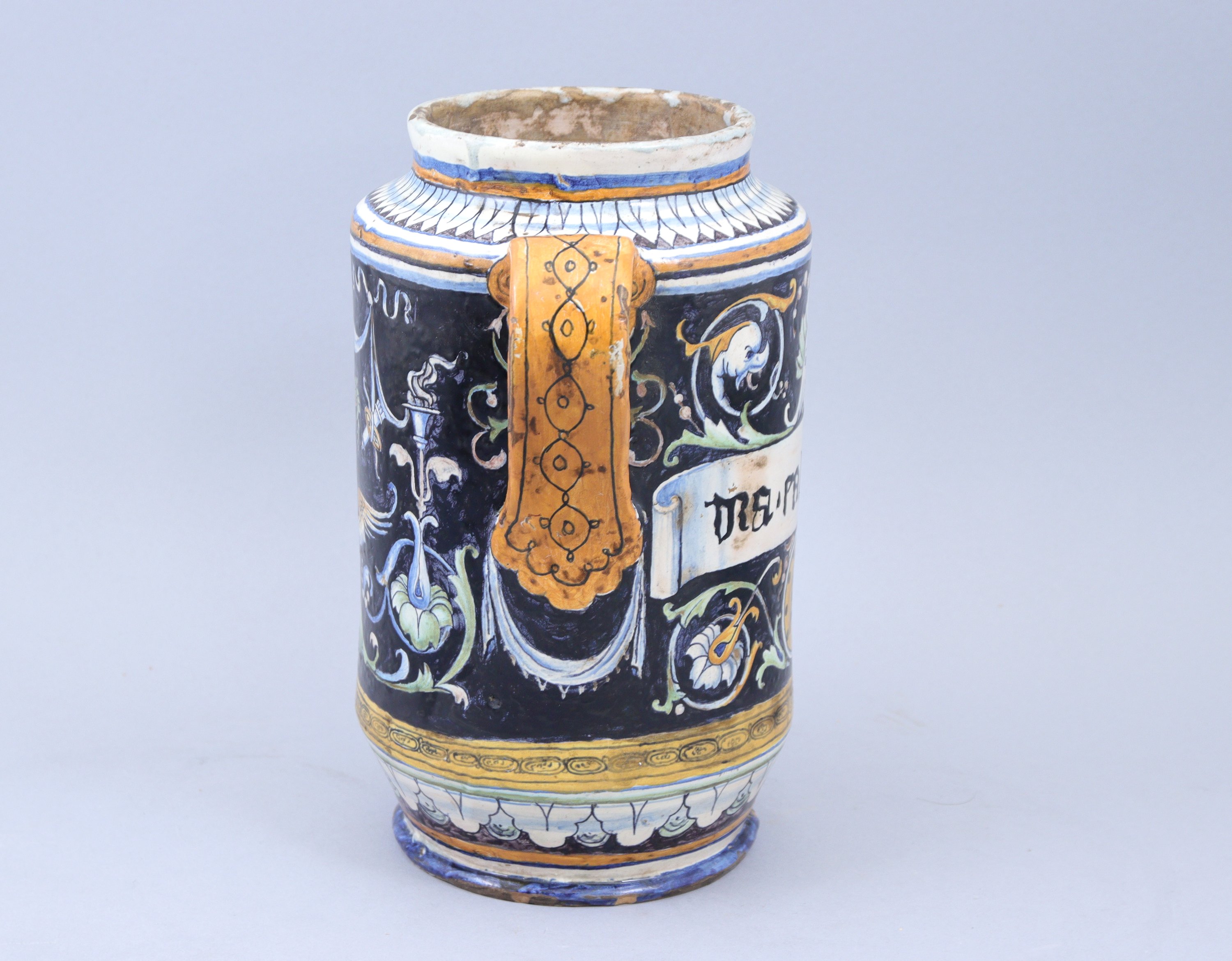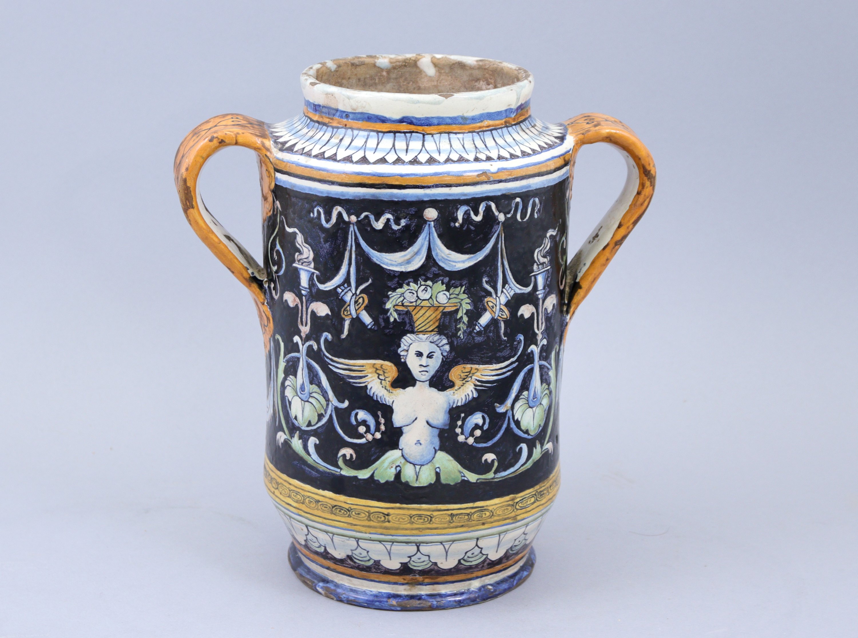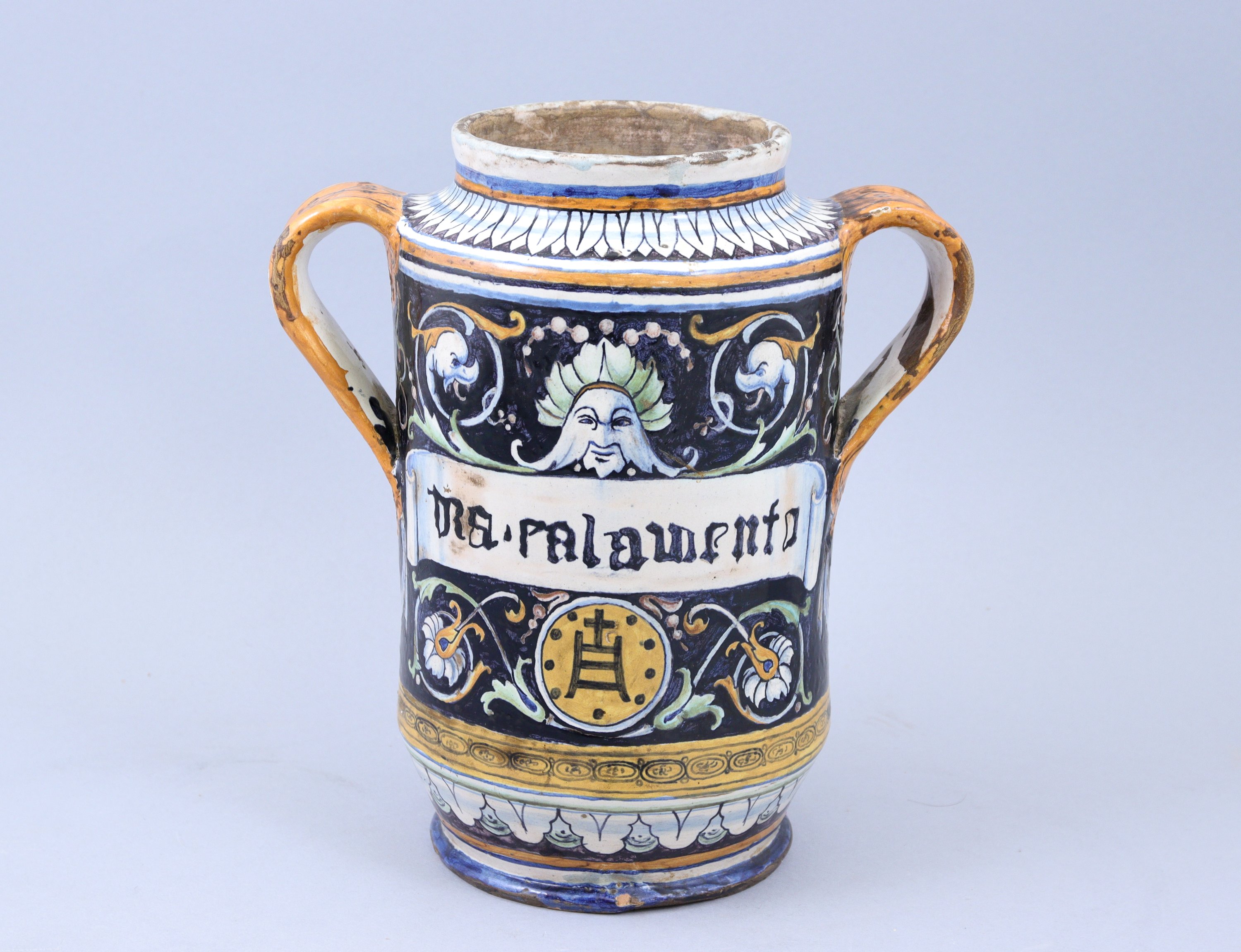 en faïence polychrome à fond bleu, à décor sur une face de rinceaux et dauphins avec l’inscription « ma pala viento », sur l’autre d'une chimère coiffée d’une coupe de fruits.