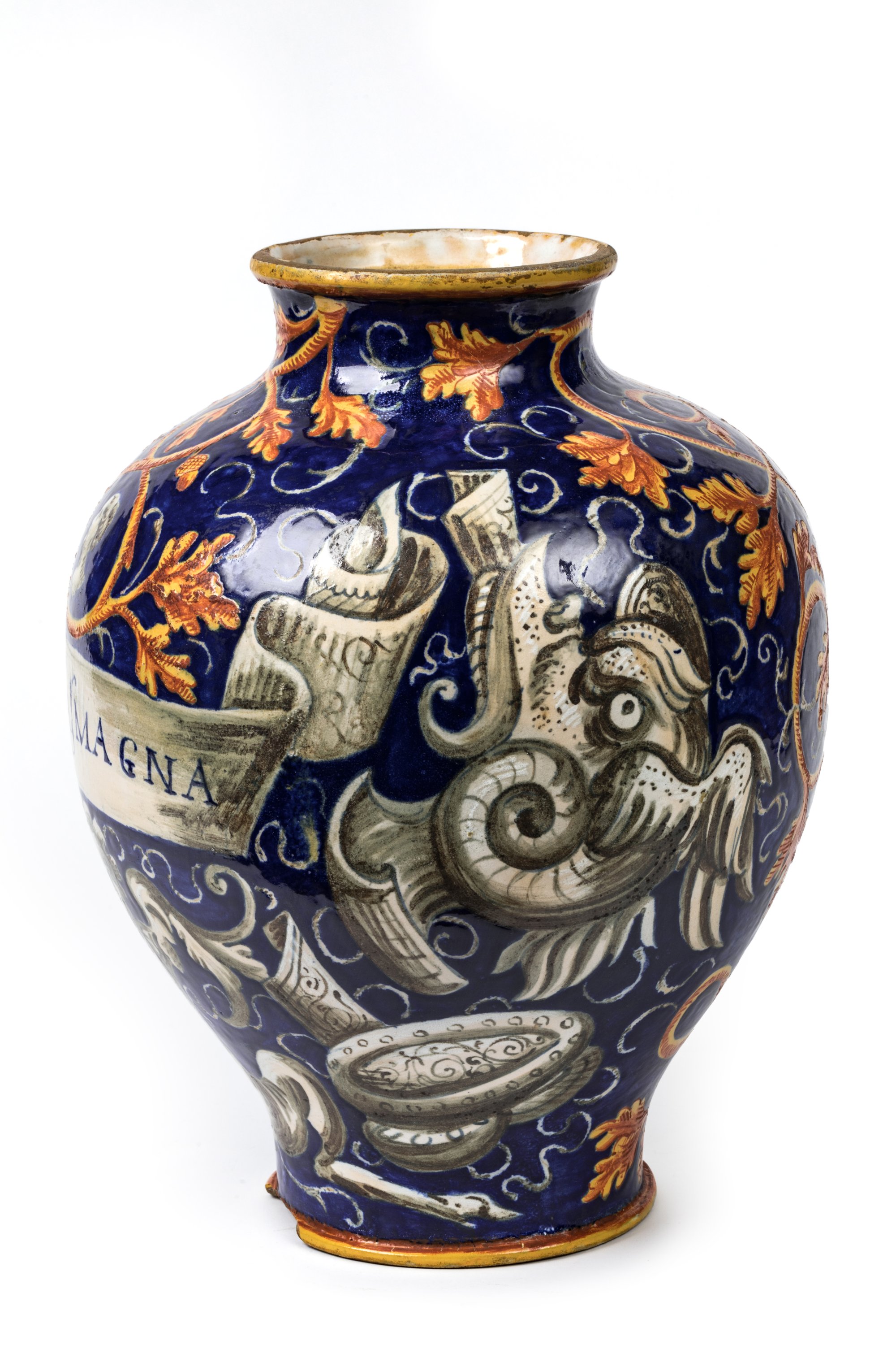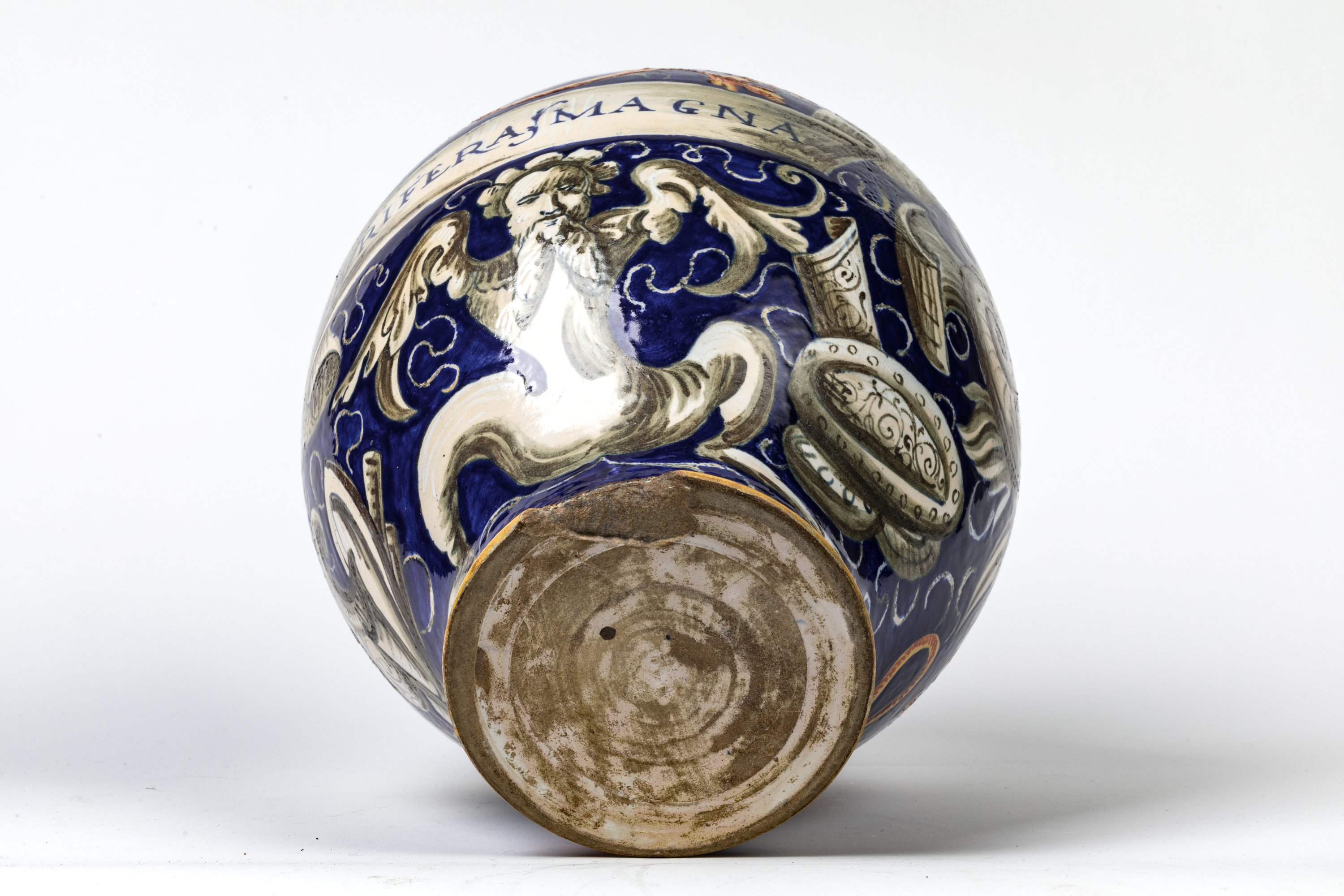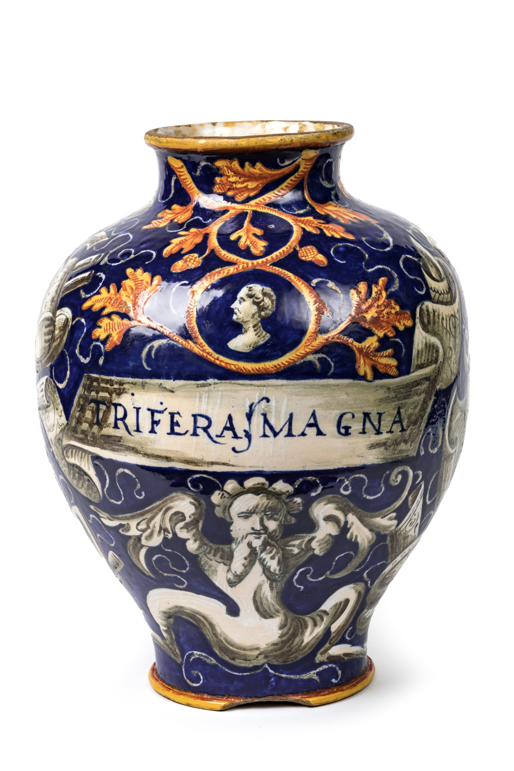 en faïence, à décor italien composé de feuilles de chêne, dauphins, portrait à l'antique, mascaron ailé et phylactère portant la mention "Trifera-magna".