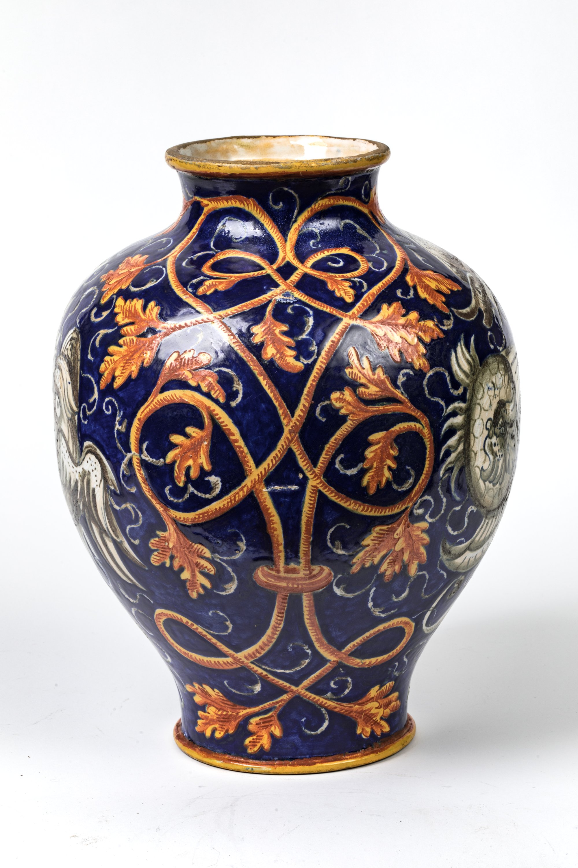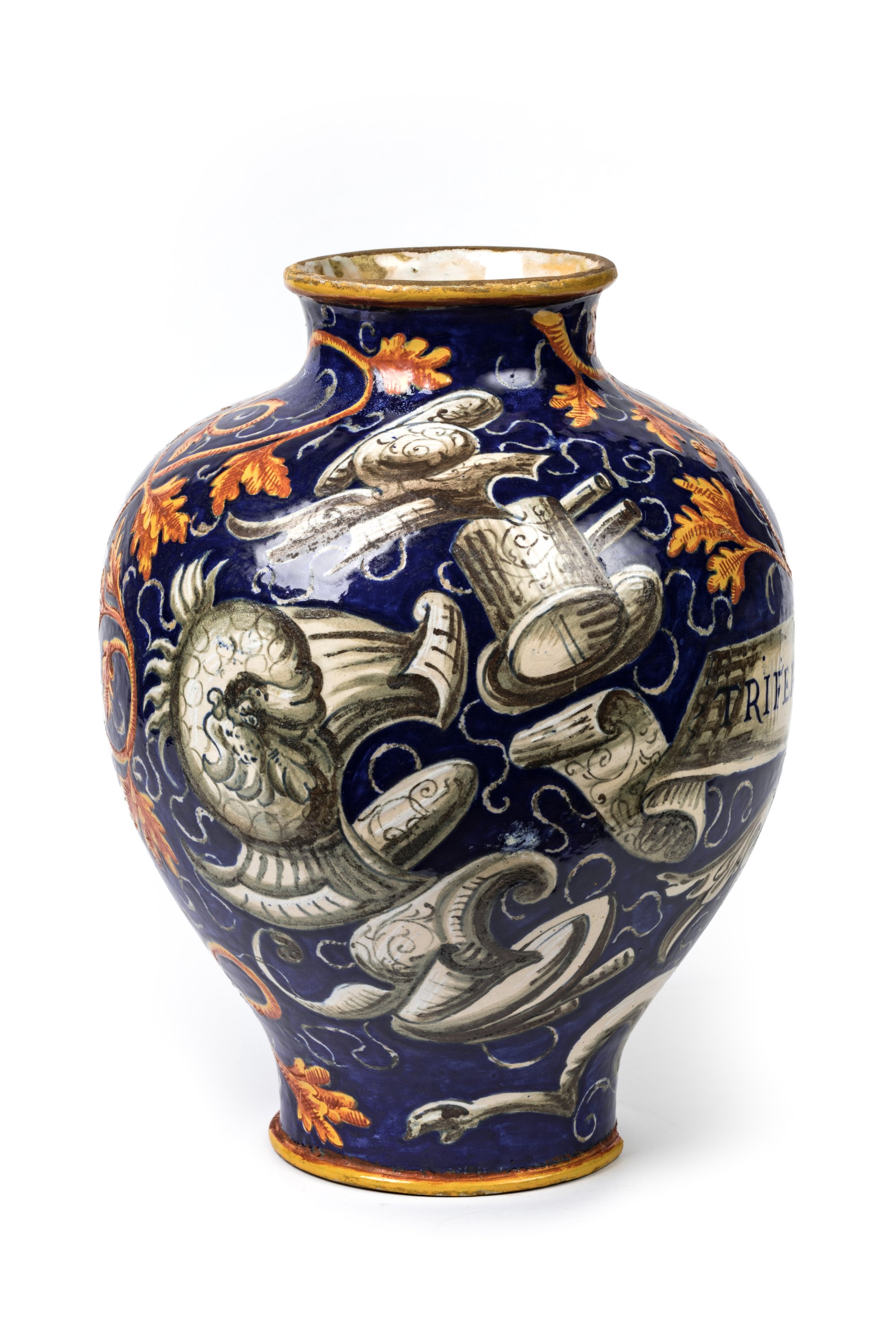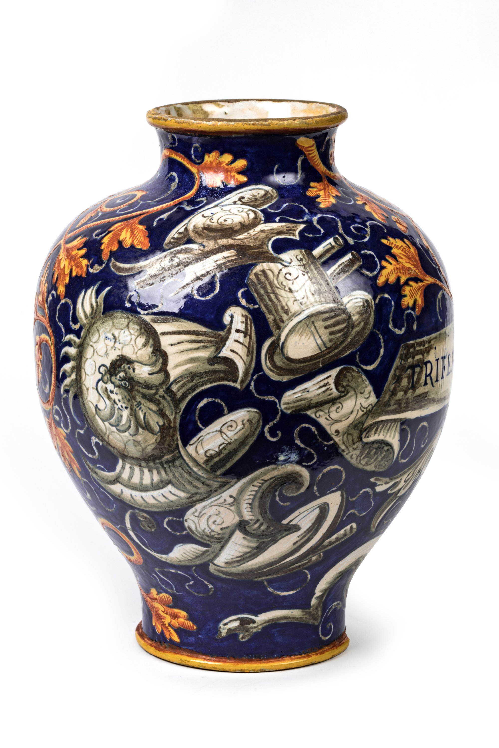 en faïence, à décor italien composé de feuilles de chêne, dauphins, portrait à l'antique, mascaron ailé et phylactère portant la mention "Trifera-magna".