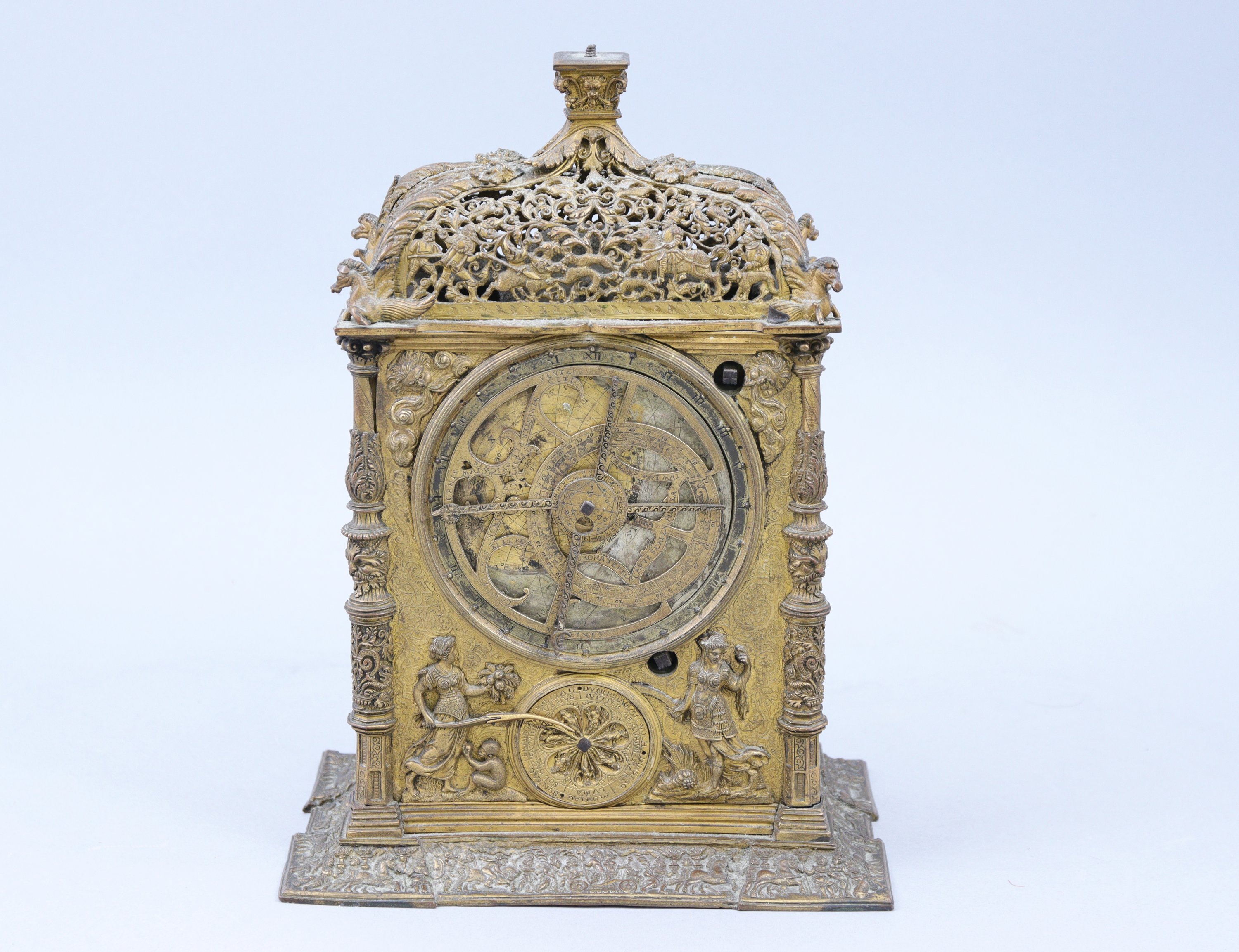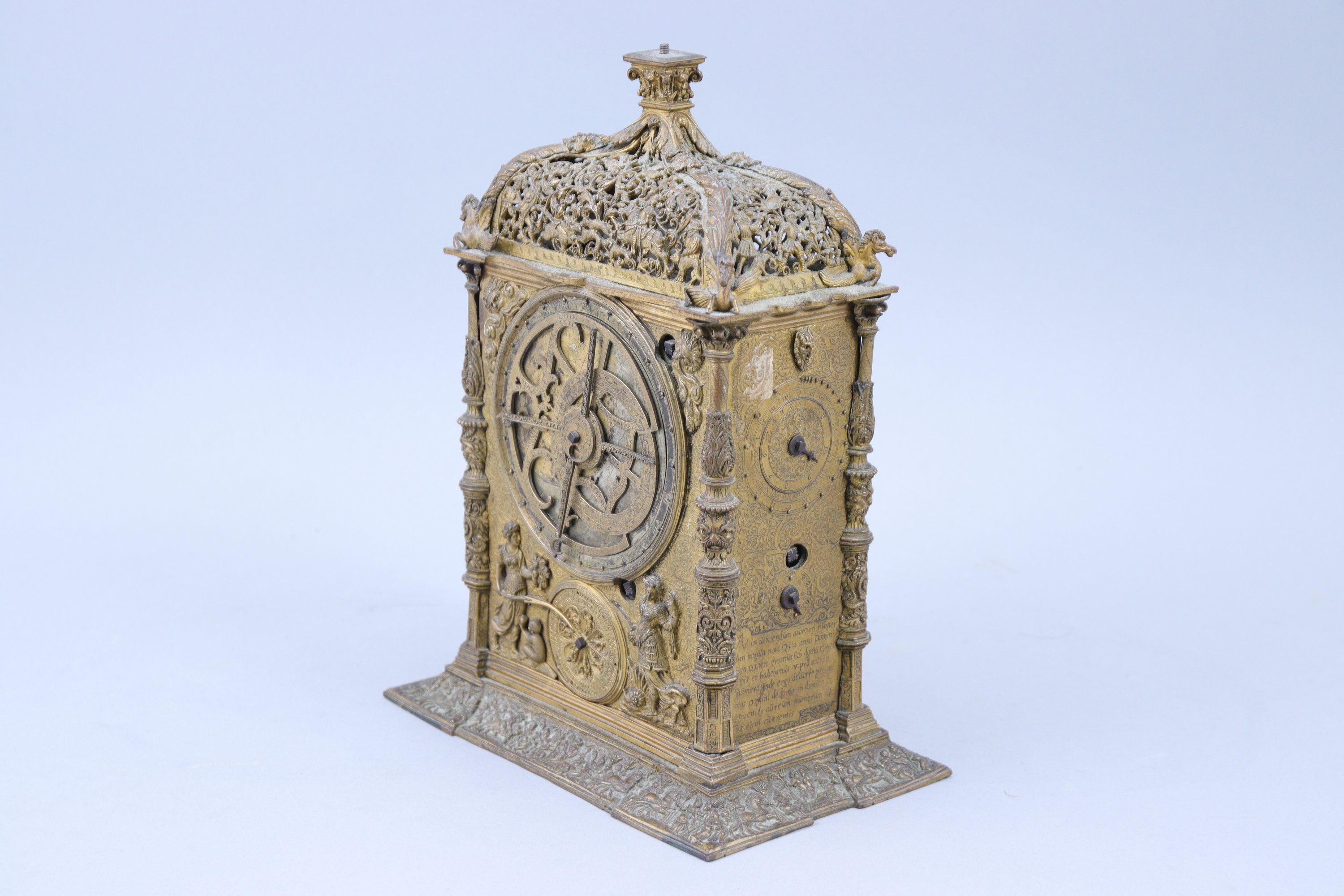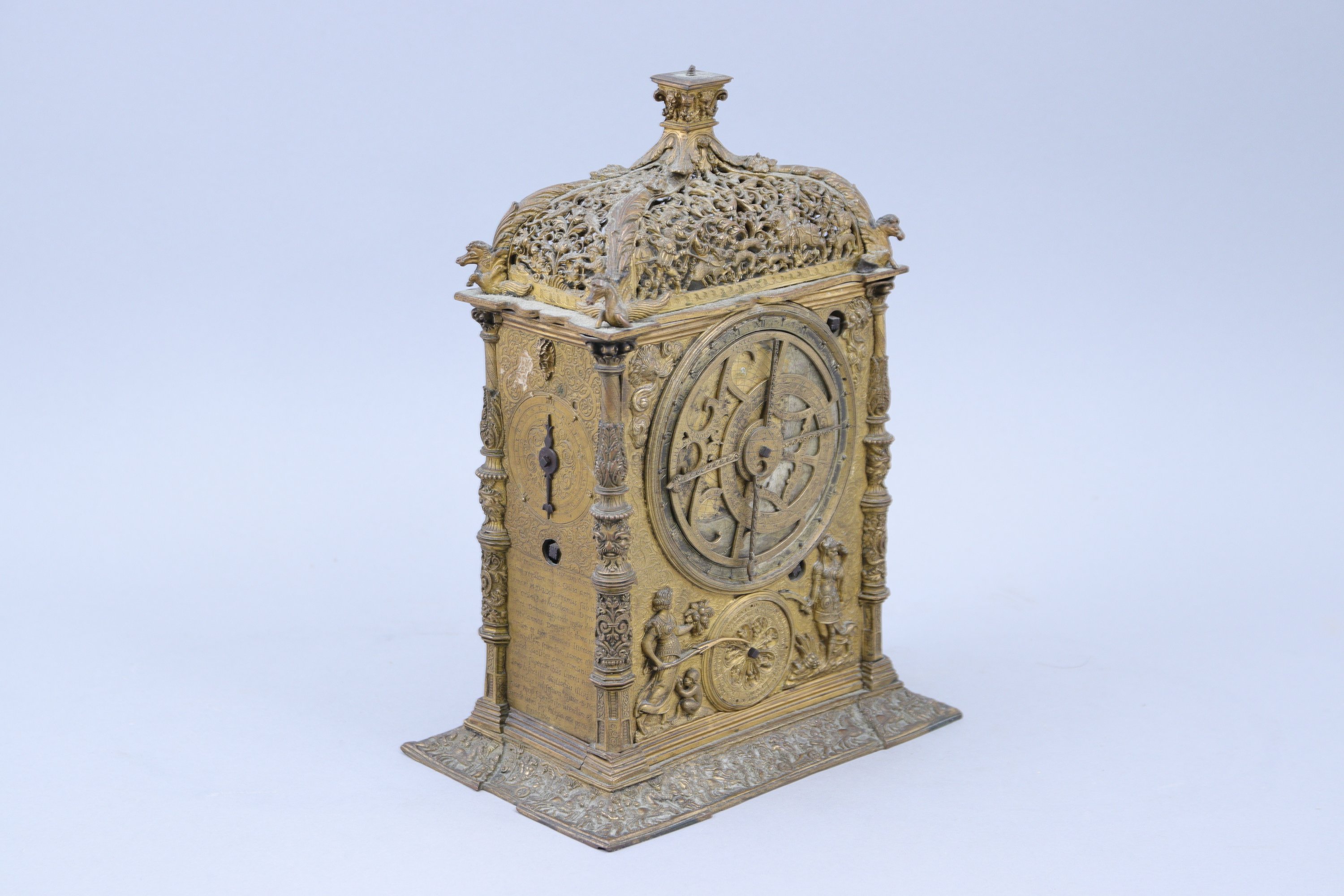de forme rectangulaire, en galvanoplastie. La partie supérieure à décor ajouré d’une chasse à l’ours d'un côté et d'une chasse au sanglier de l'autre, est coiffée d’un chapiteau ionique stylisé reposant sur quatre feuilles d’acanthe se prolongeant par des chevaux ailés. Sur une face, trois cadrans sont entourés d'allégories. Le premier indique les jours et les heures, le deuxième les signes du zodiaque. Sur l'autre face, deux cadrans entourés d'une allégorie du Temps et une jeune femme à l'escargot, les écoinçons à la figure de Jupiter soufflant le vent. Les côtés composés chacun d'un cadran et mentionnant l'année "1562", avec textes en latin. Quatre colonnes. La base à décor d’un triomphe.