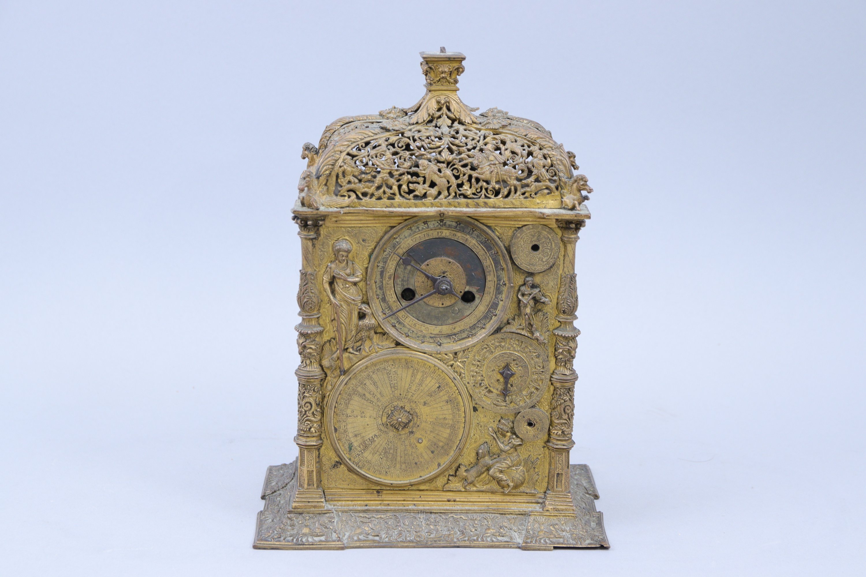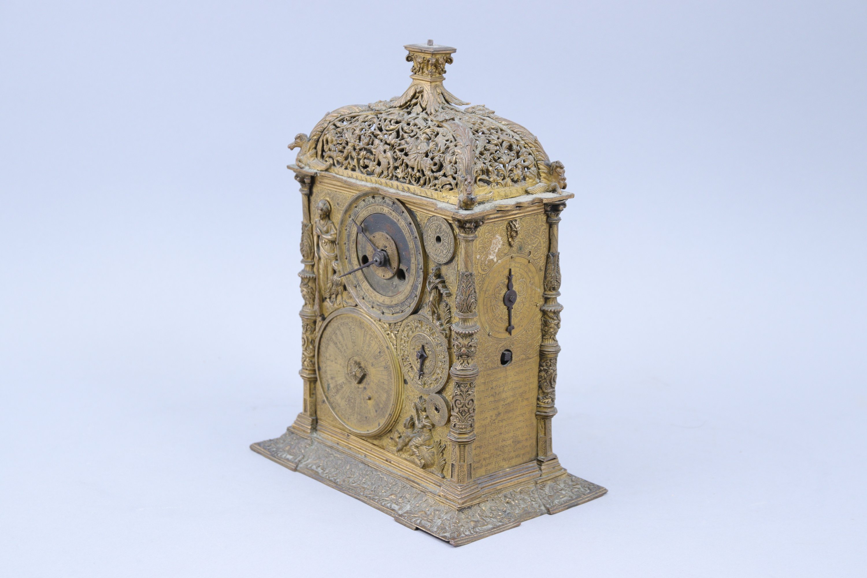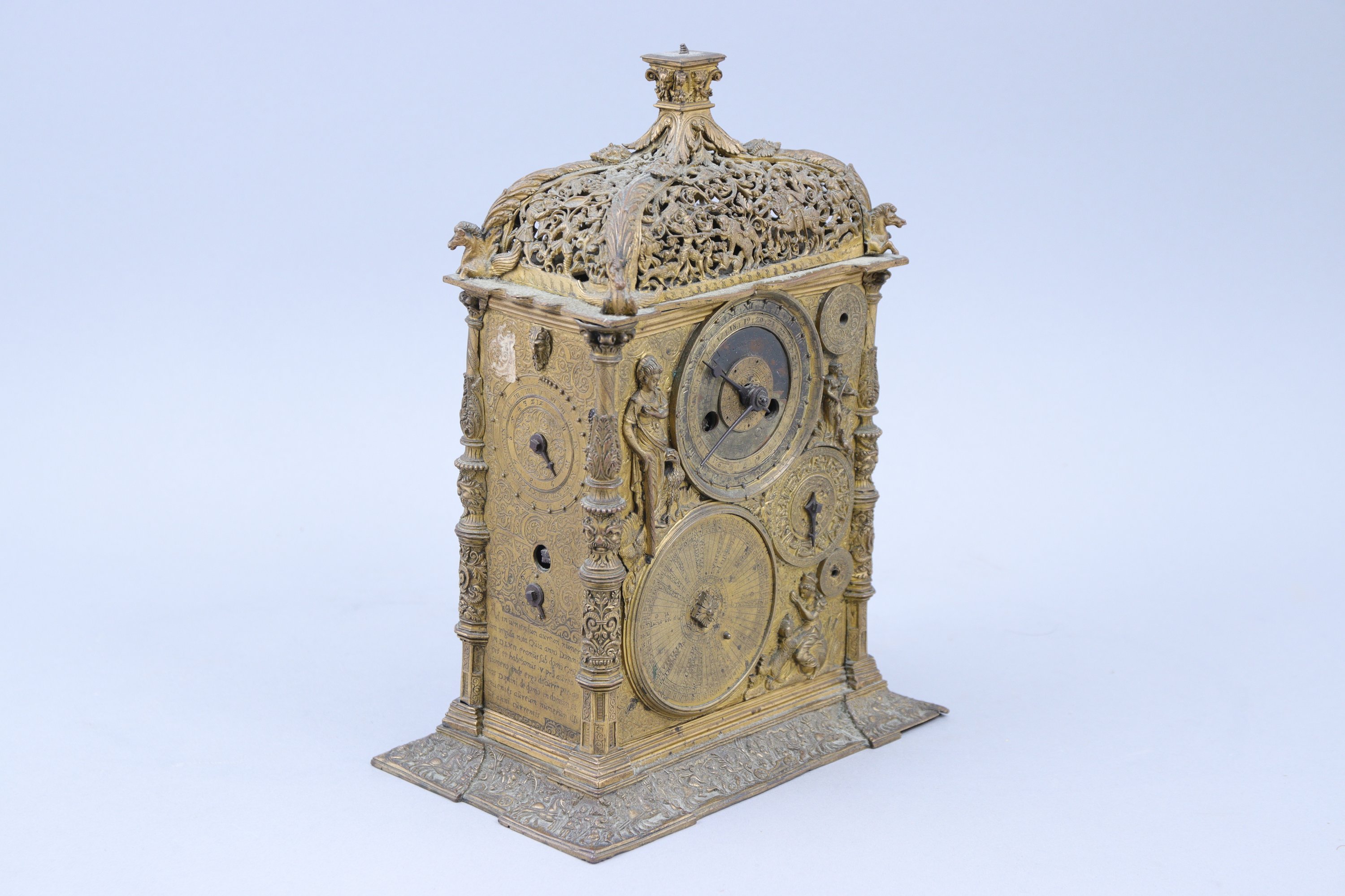 de forme rectangulaire, en galvanoplastie. La partie supérieure à décor ajouré d’une chasse à l’ours d'un côté et d'une chasse au sanglier de l'autre, est coiffée d’un chapiteau ionique stylisé reposant sur quatre feuilles d’acanthe se prolongeant par des chevaux ailés. Sur une face, trois cadrans sont entourés d'allégories. Le premier indique les jours et les heures, le deuxième les signes du zodiaque. Sur l'autre face, deux cadrans entourés d'une allégorie du Temps et une jeune femme à l'escargot, les écoinçons à la figure de Jupiter soufflant le vent. Les côtés composés chacun d'un cadran et mentionnant l'année "1562", avec textes en latin. Quatre colonnes. La base à décor d’un triomphe.