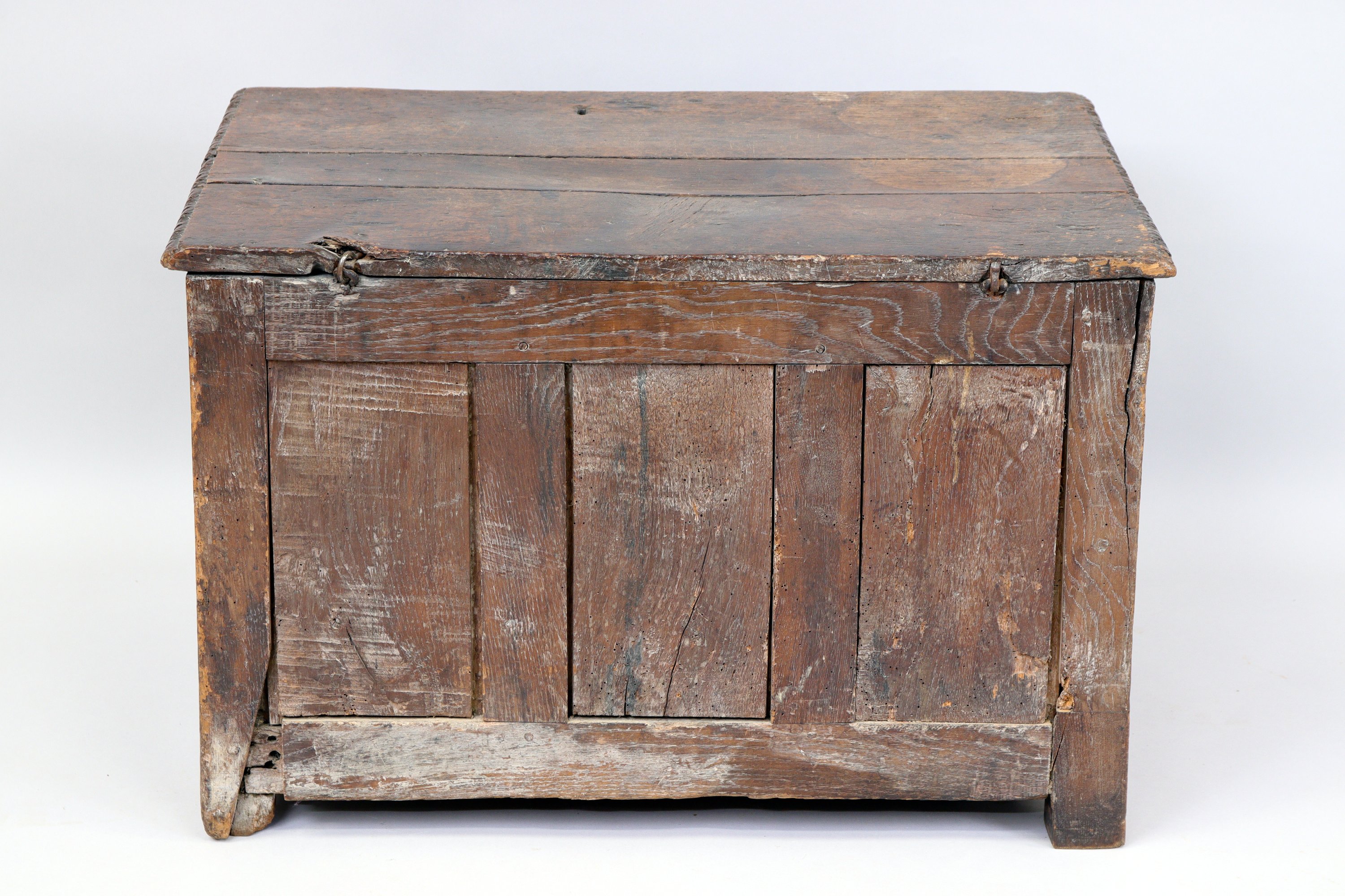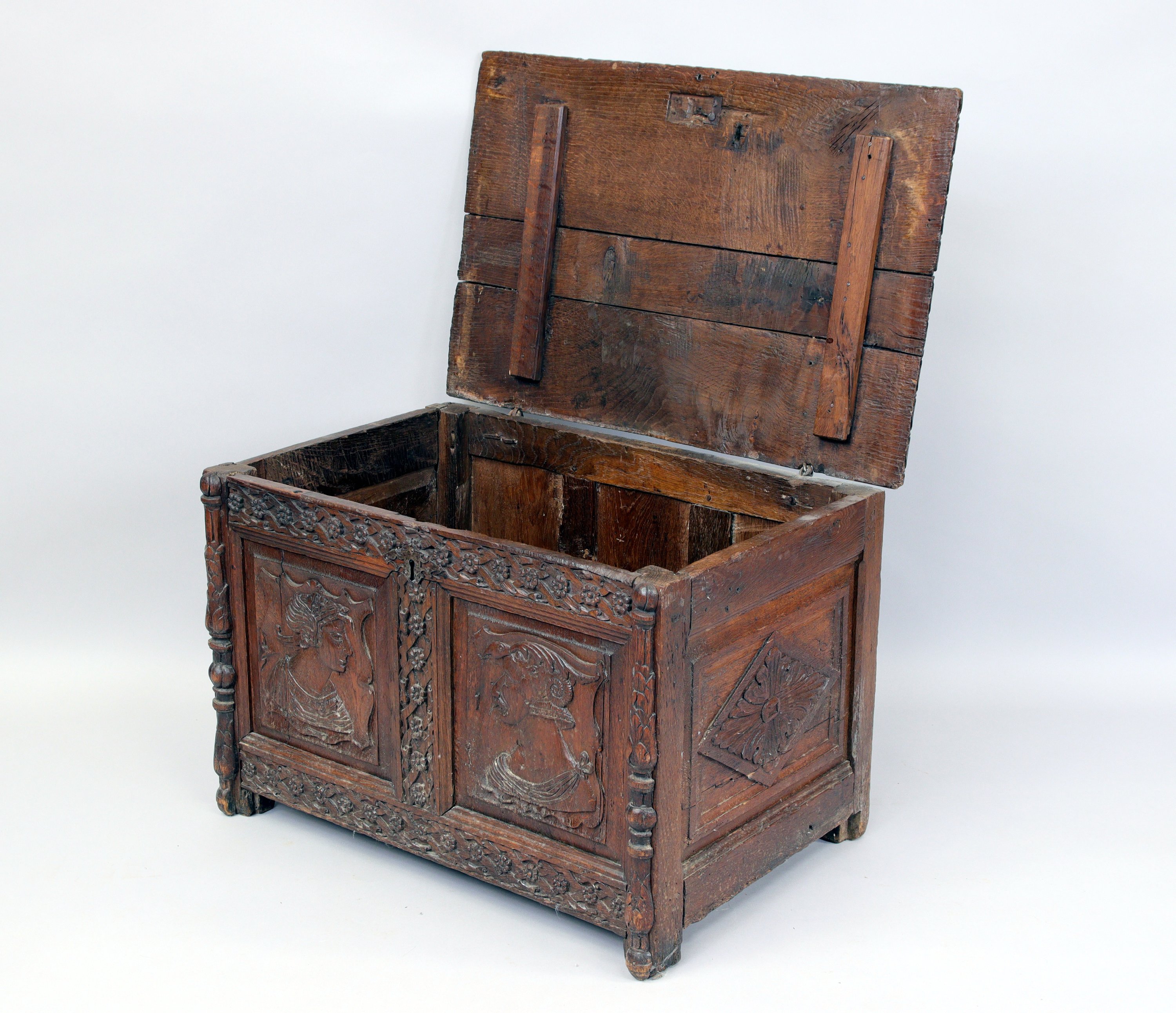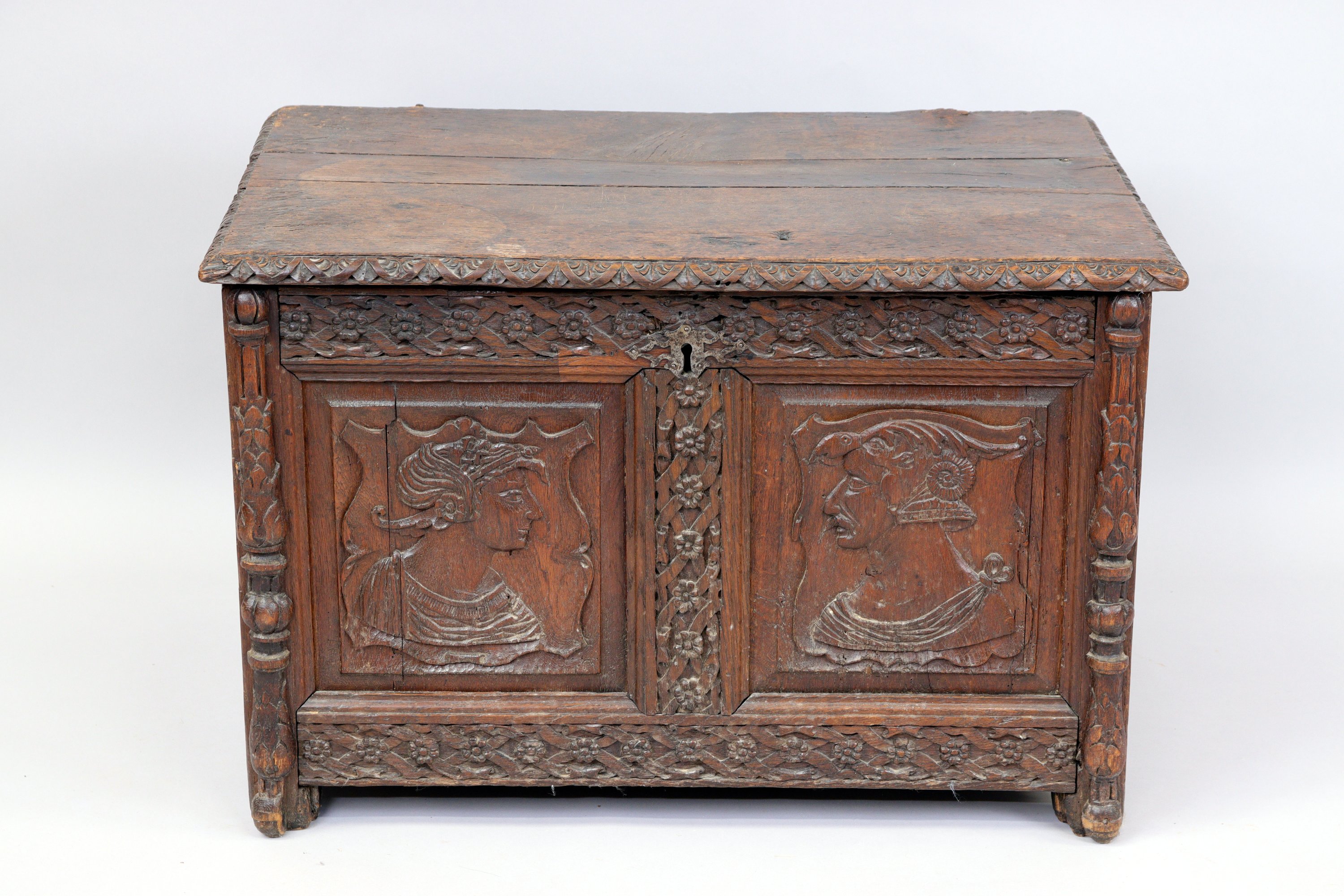 Coffre en chêne mouluré et sculpté, présentant en façade des personnages à l'Antique se faisant...