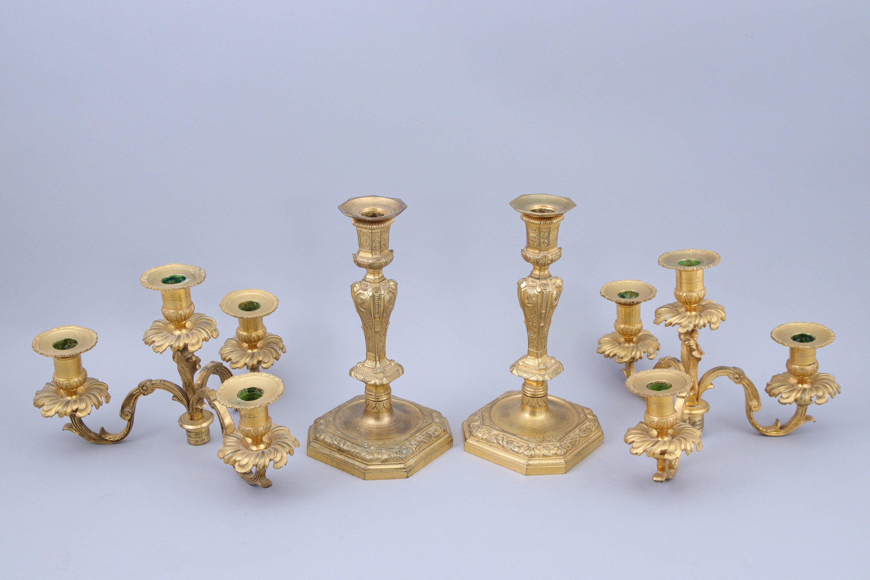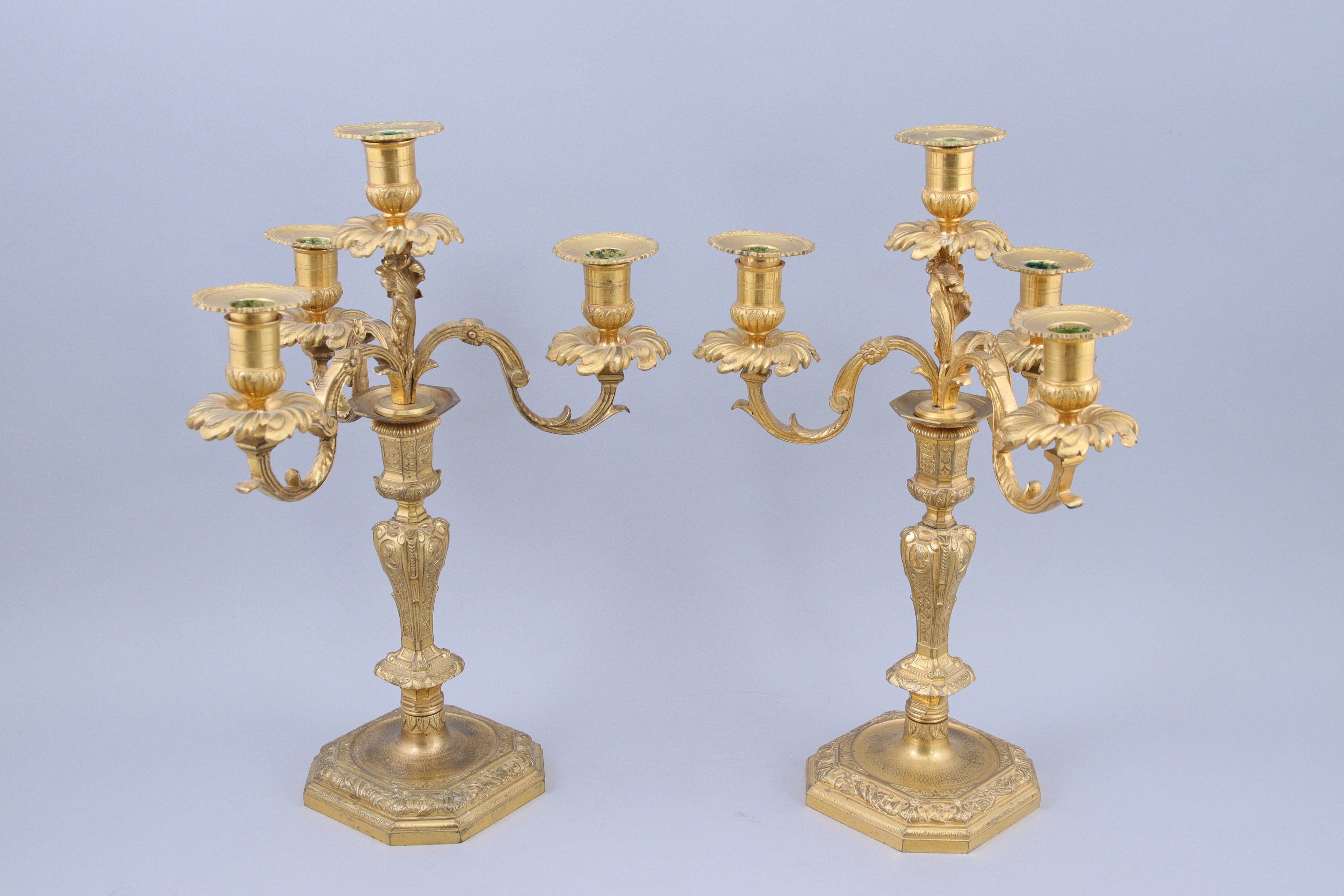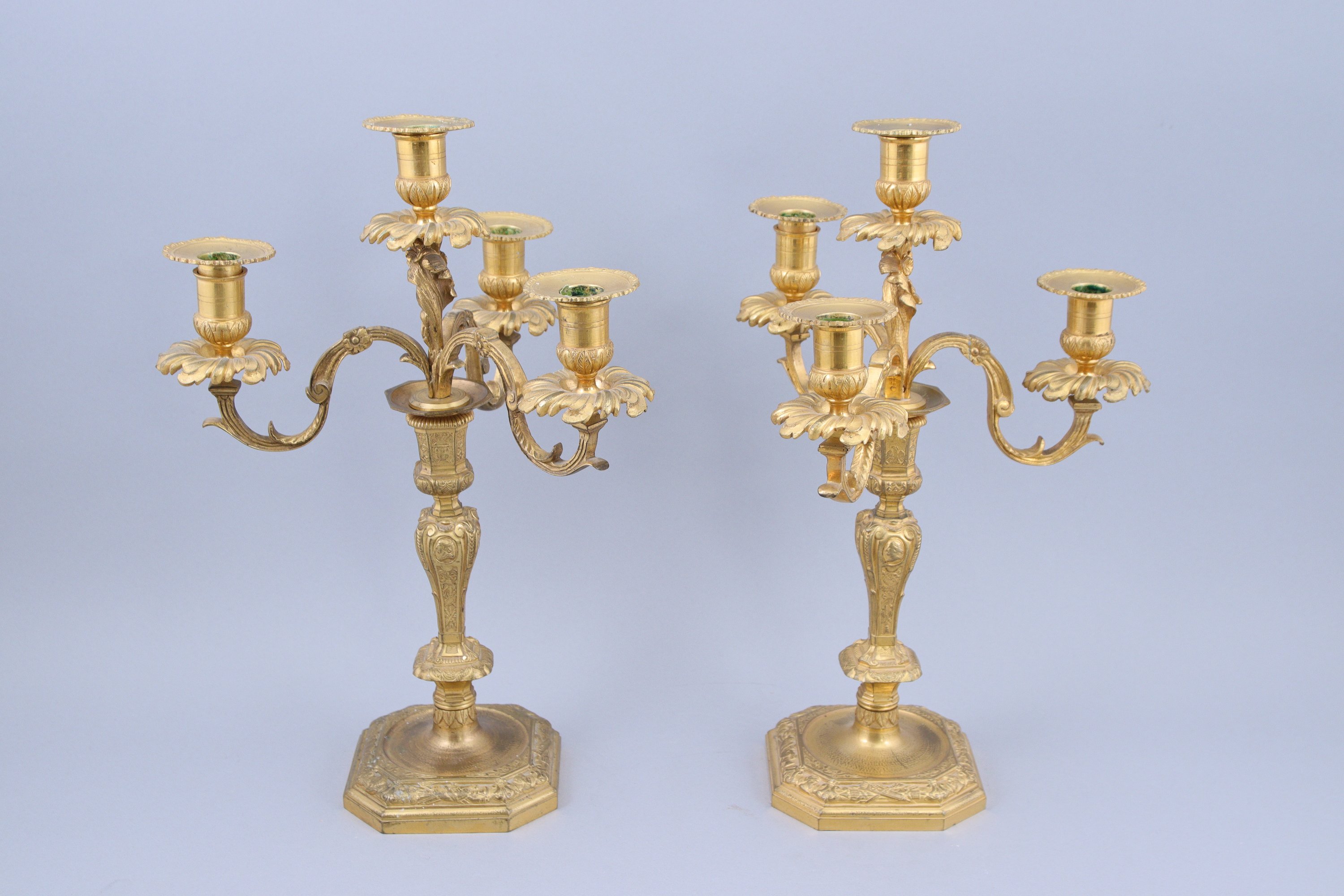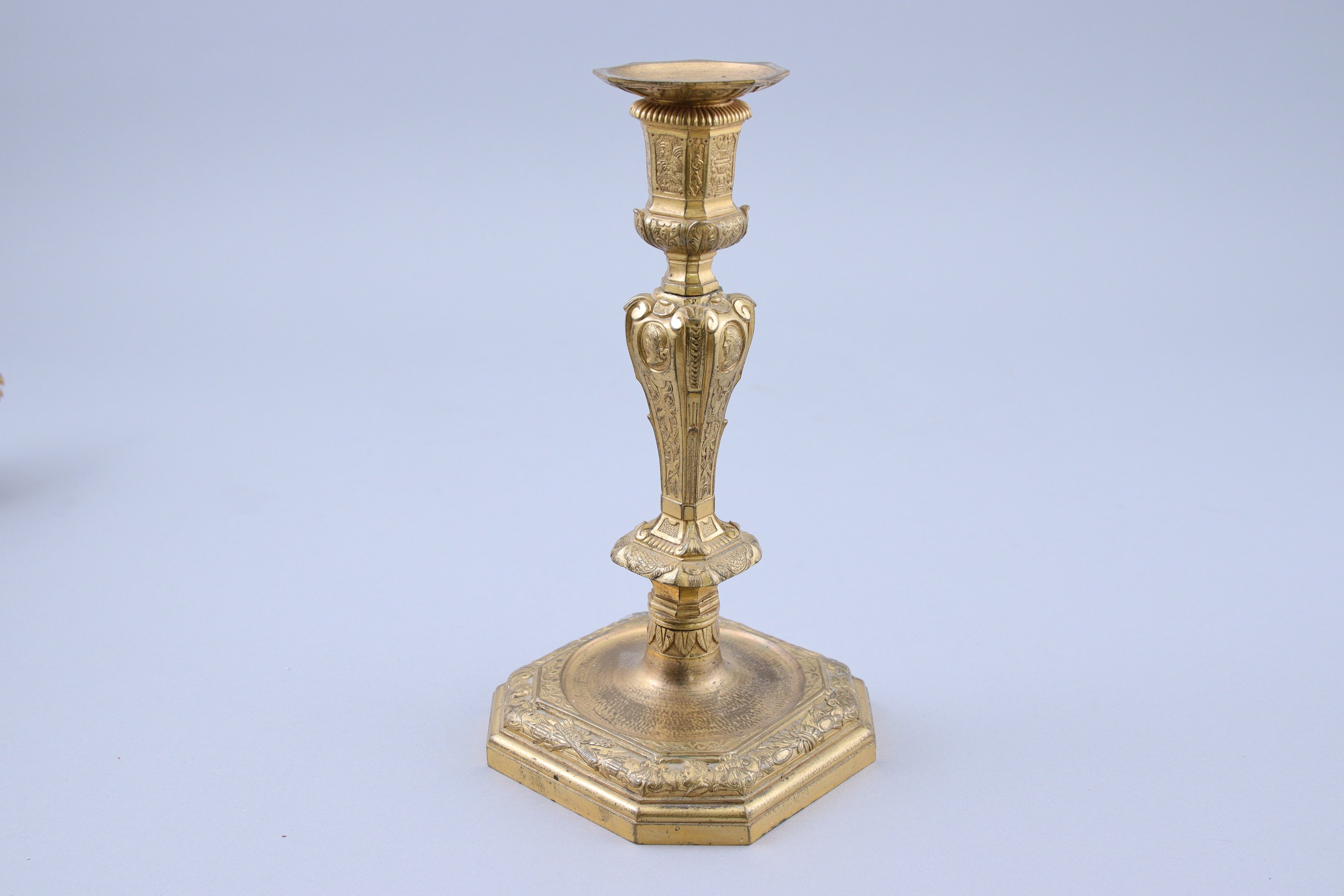en bronze doré et ciselé. Le binet à pans coupés à décor d'oiseaux et vases à l'antique, le fût orné de profils dans des médaillons surmontant des trophés d'armes et instruments de musique. Ils reposent sur un pied octogonal décoré dans les écoinçons de guirlandes feuillagées et soulignés par un décor d'instruments et portraits de profil.