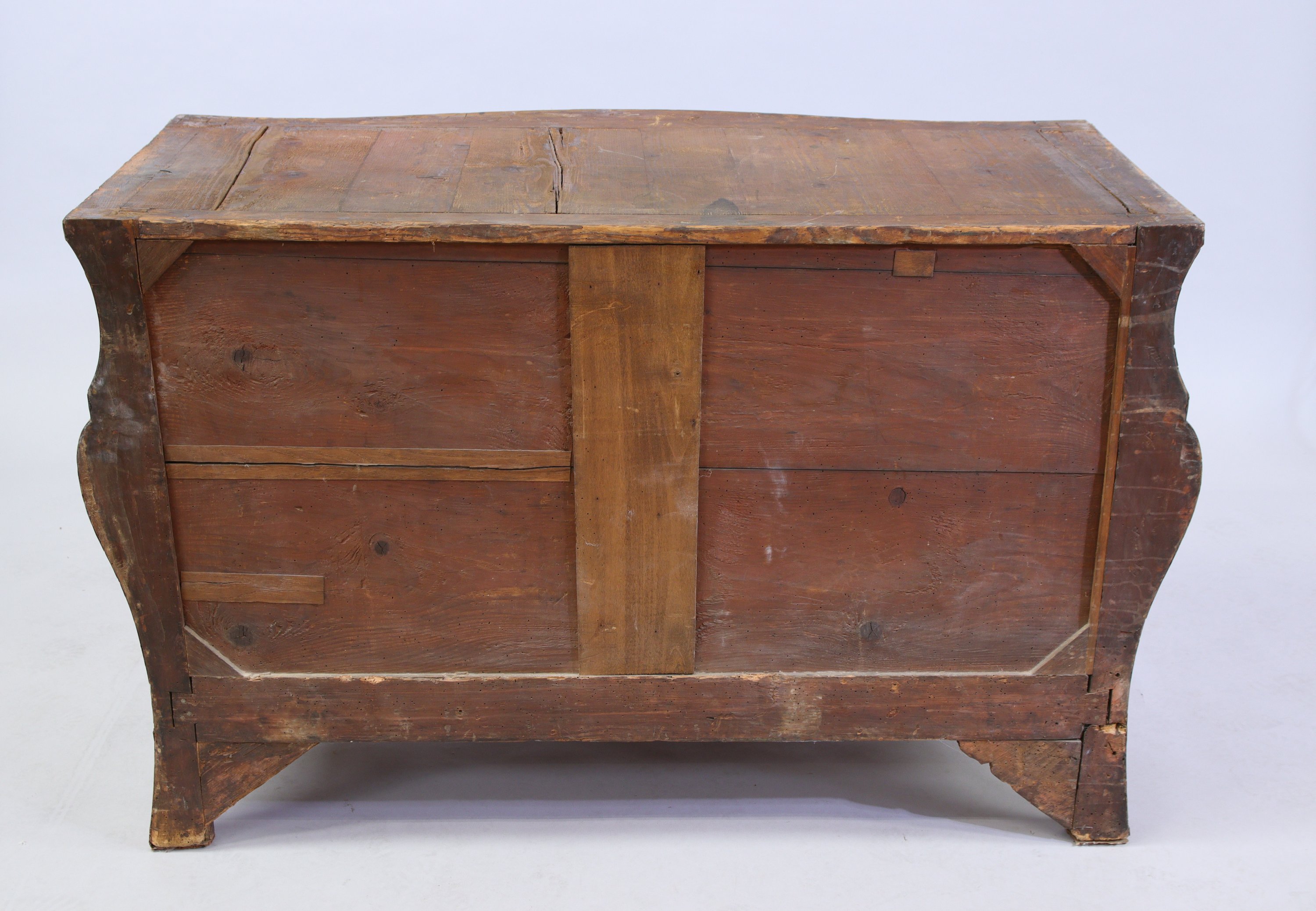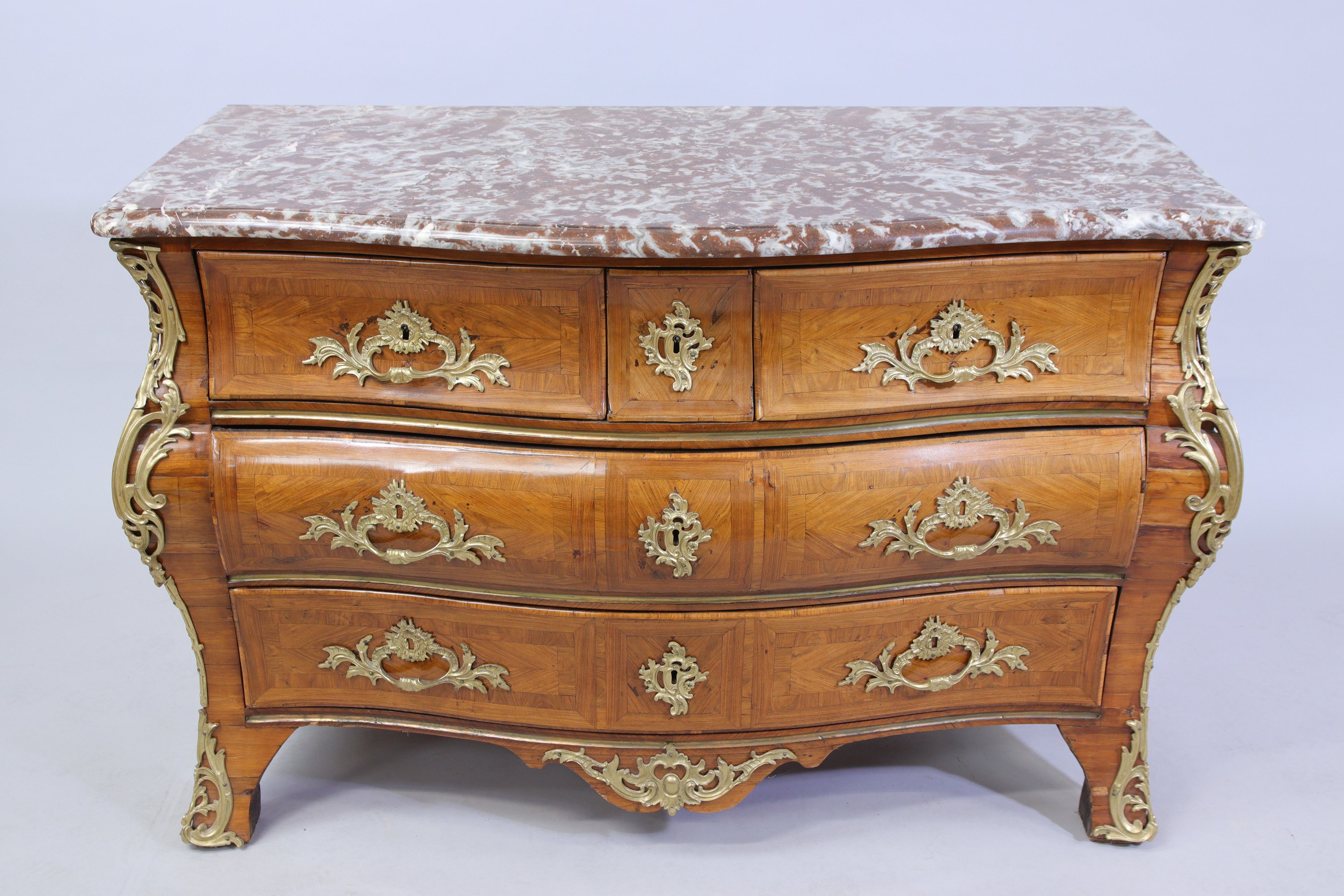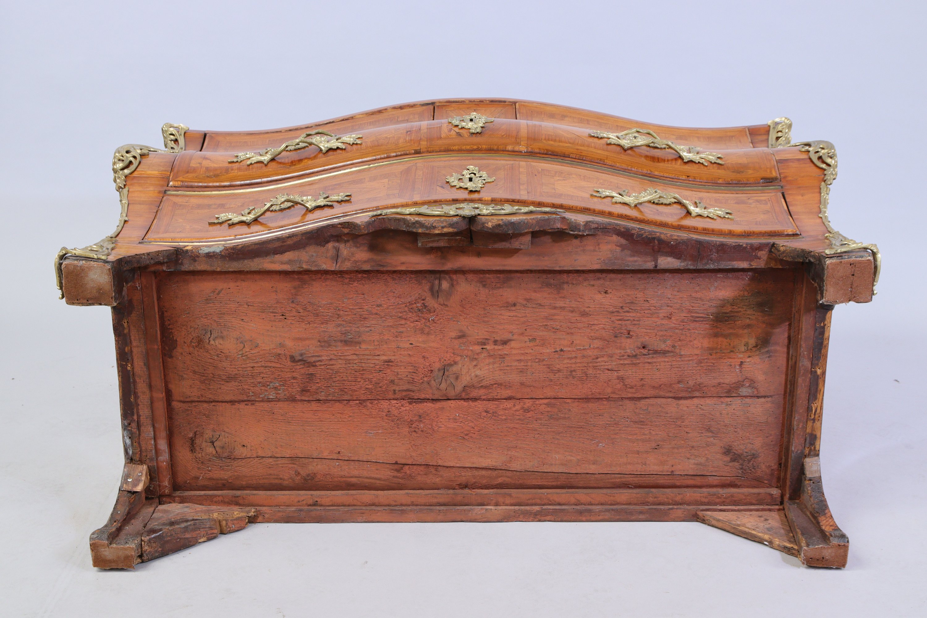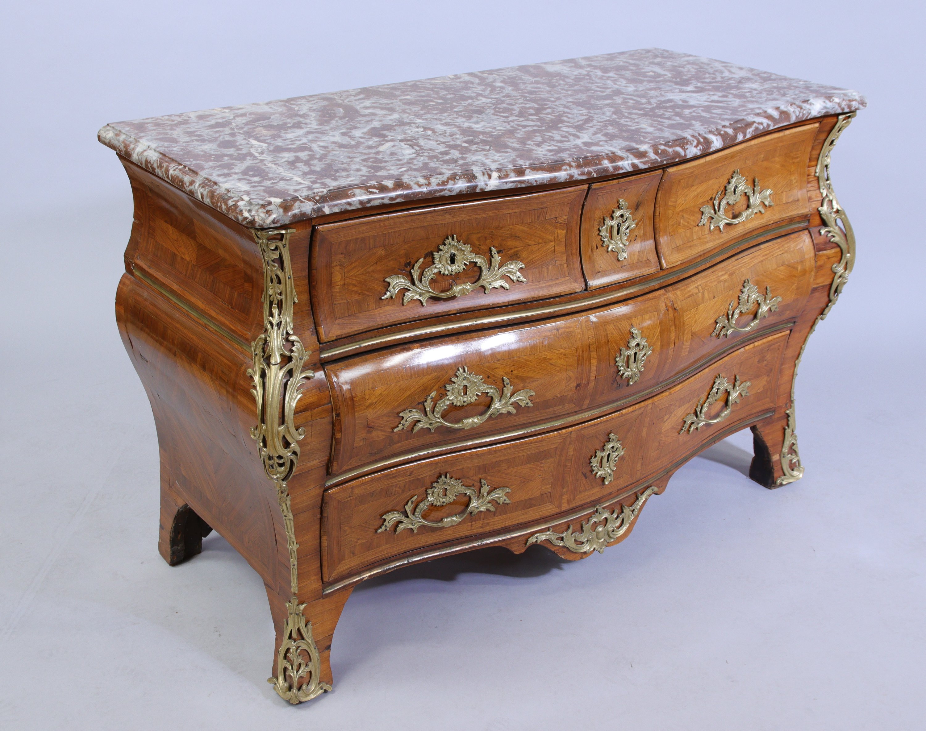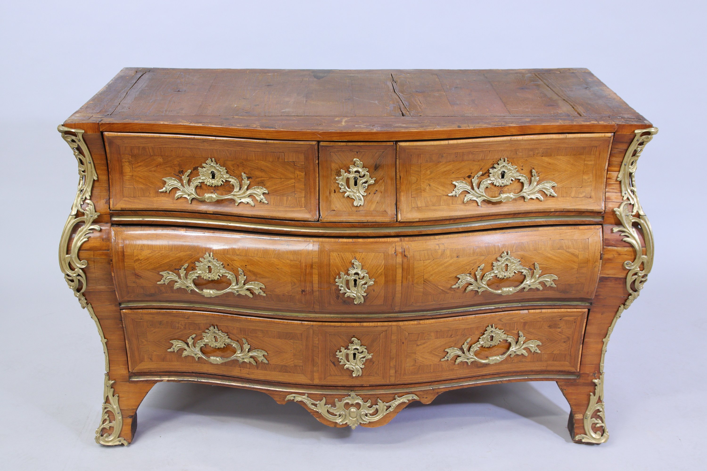Riche ornementation en bronze doré rapportée à décor rocaille : entrées de serrures, chutes, poignées de tirage fixes, sabots et cul de lampe.