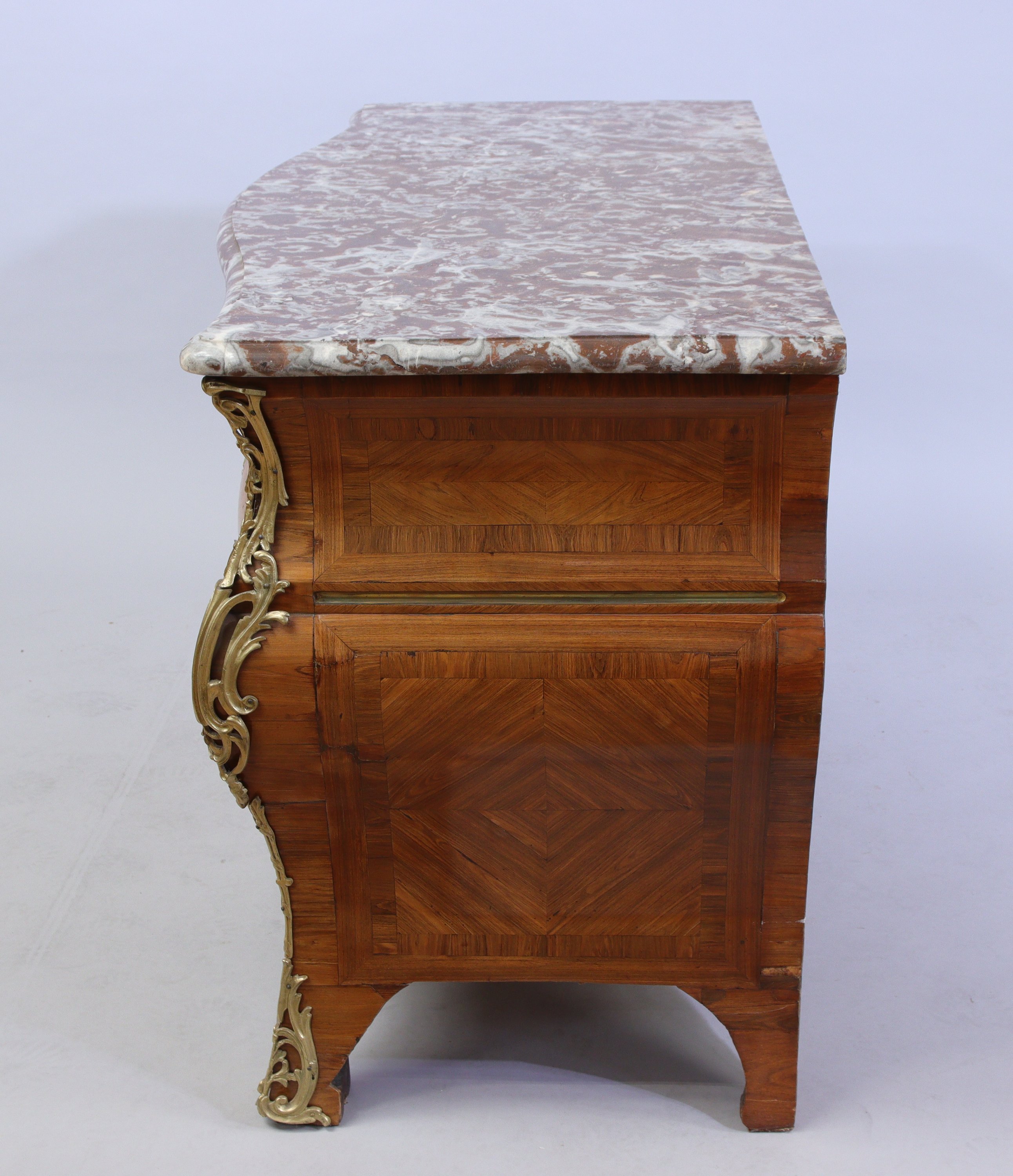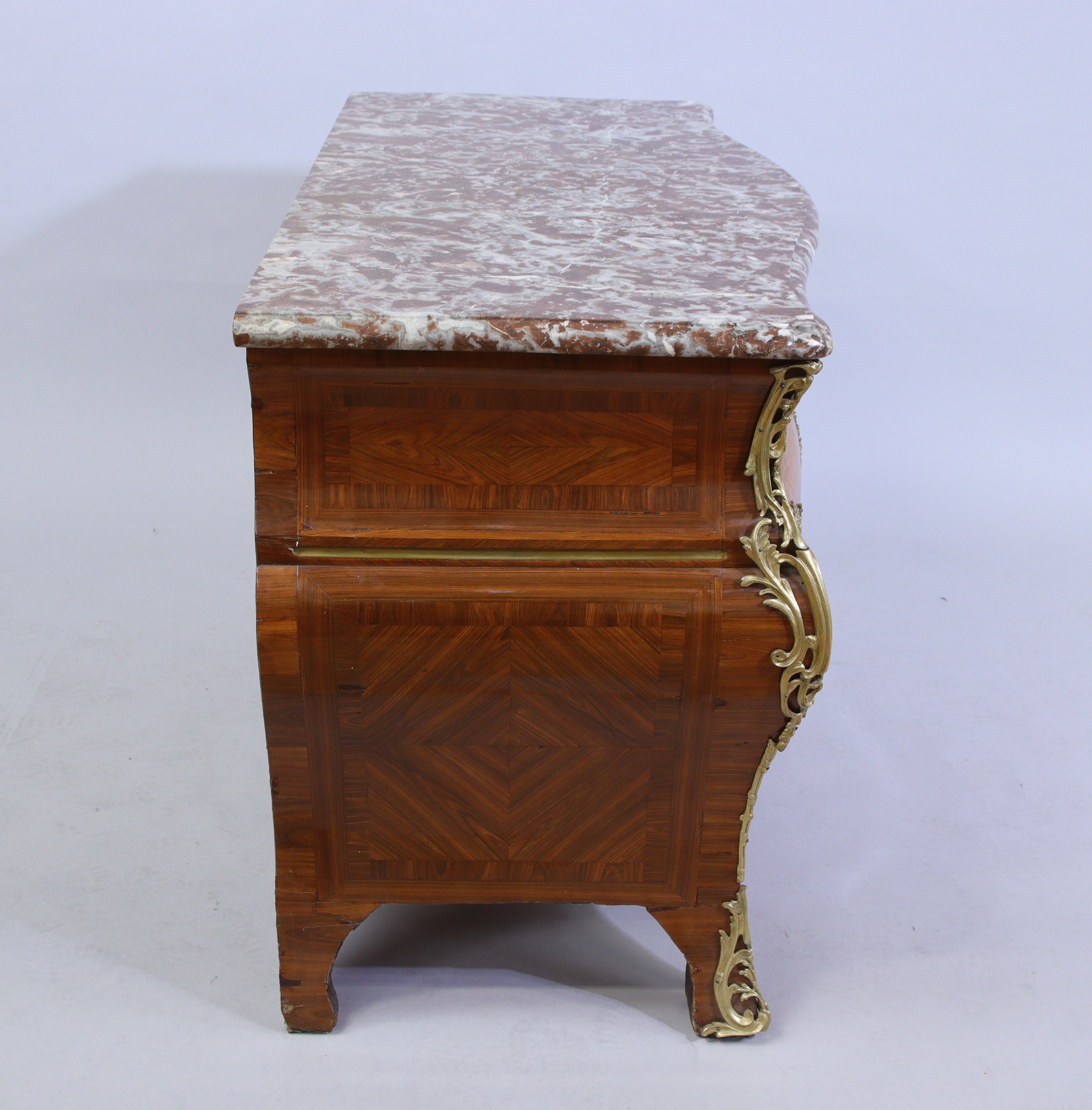 en placage de bois de rose ouvrant par cinq tiroirs sur trois rangs séparés par des traverses foncées de laiton. Les côtés galbés sont incrustés de laiton et décorés d'une marqueterie en losange.