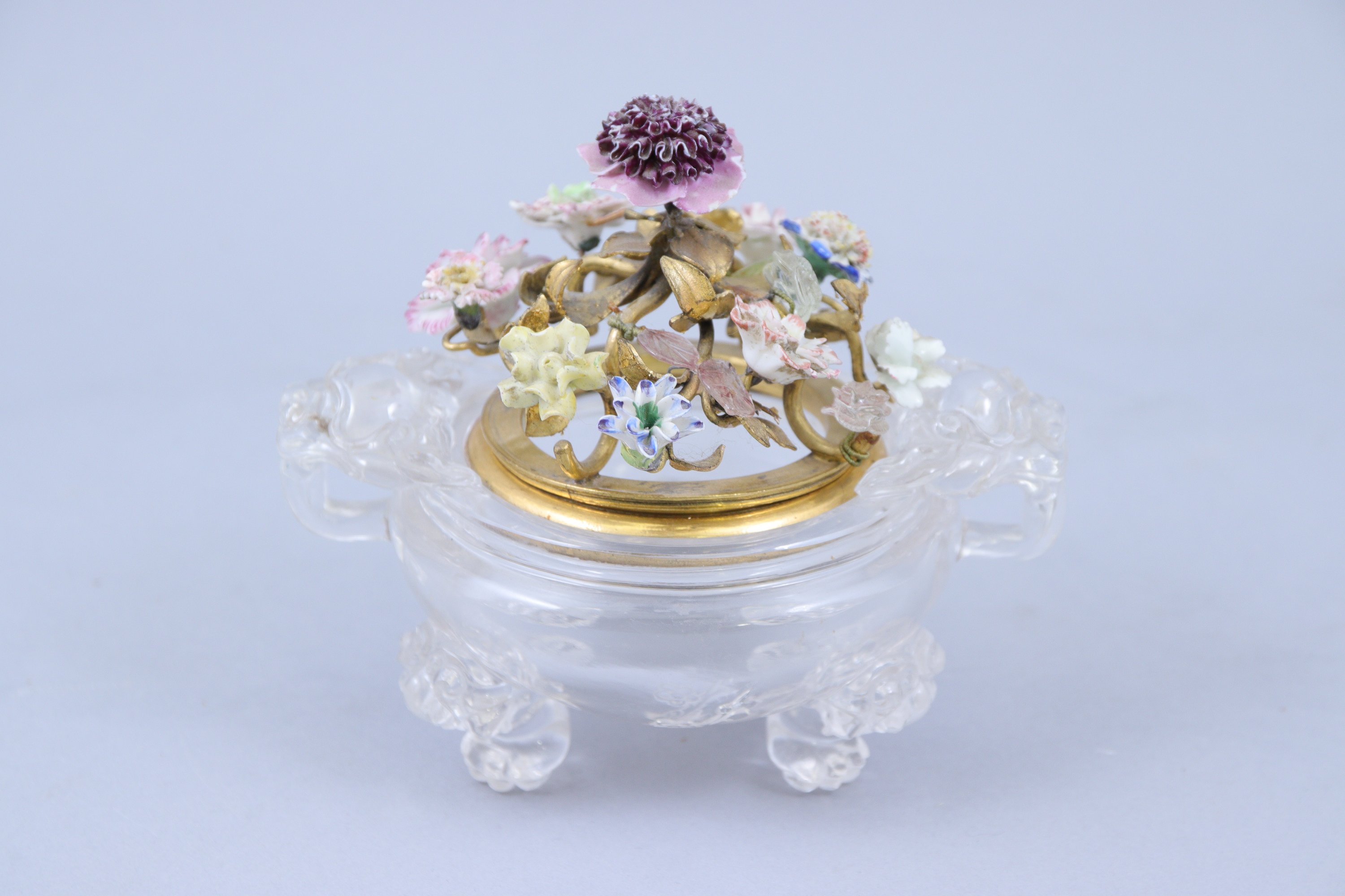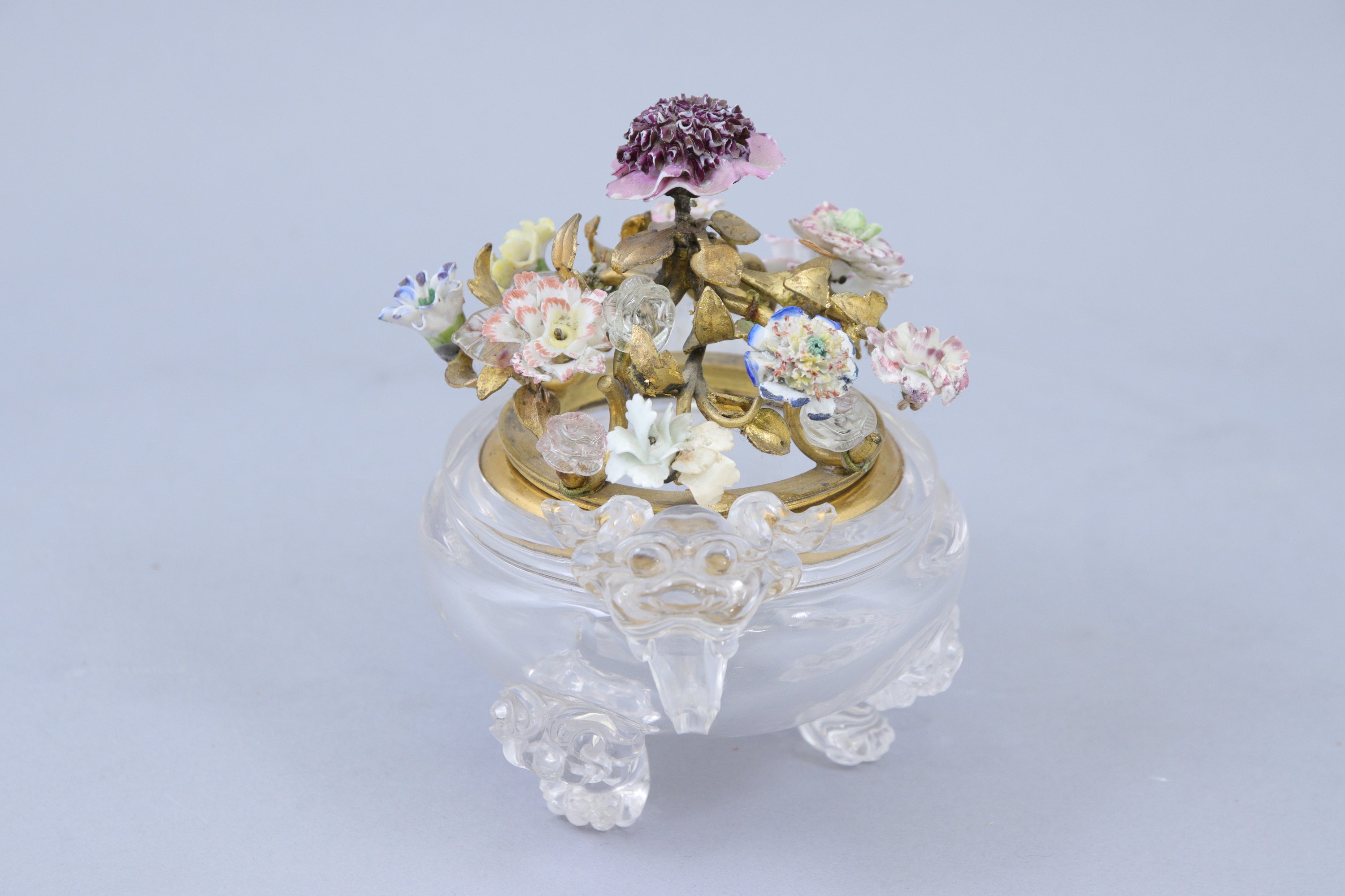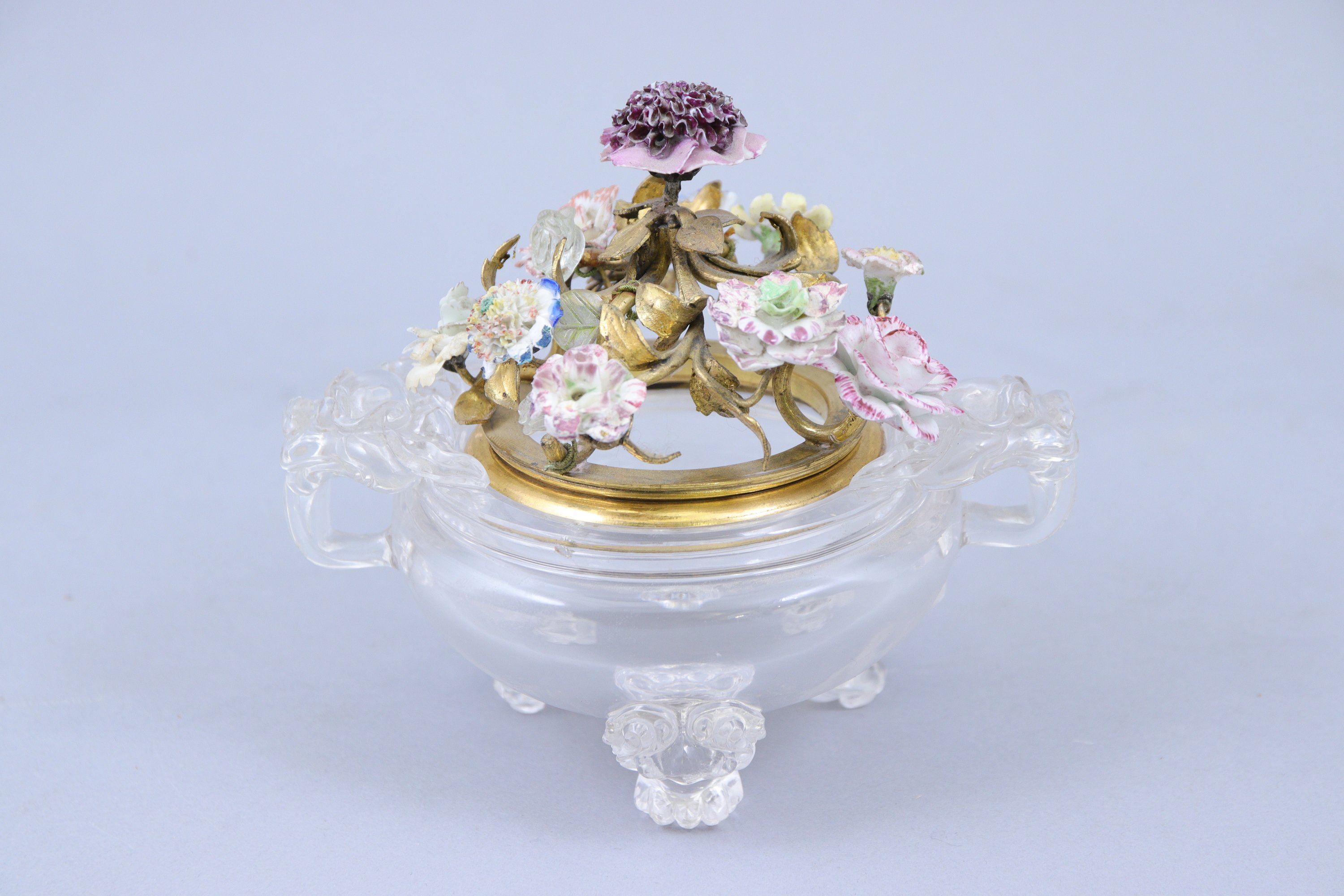 en cristal de roche de forme circulaire, à deux anses en forme de têtes de chien de phô. Piétement tripode. Le couvercle en bronze doré à décor de feuillages sertie de fleurs en porcelaine dans le goût de Vincennes.