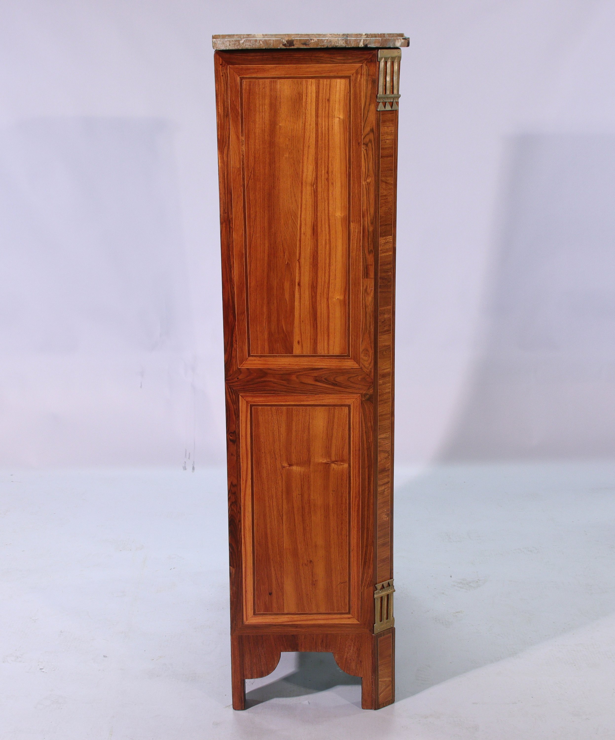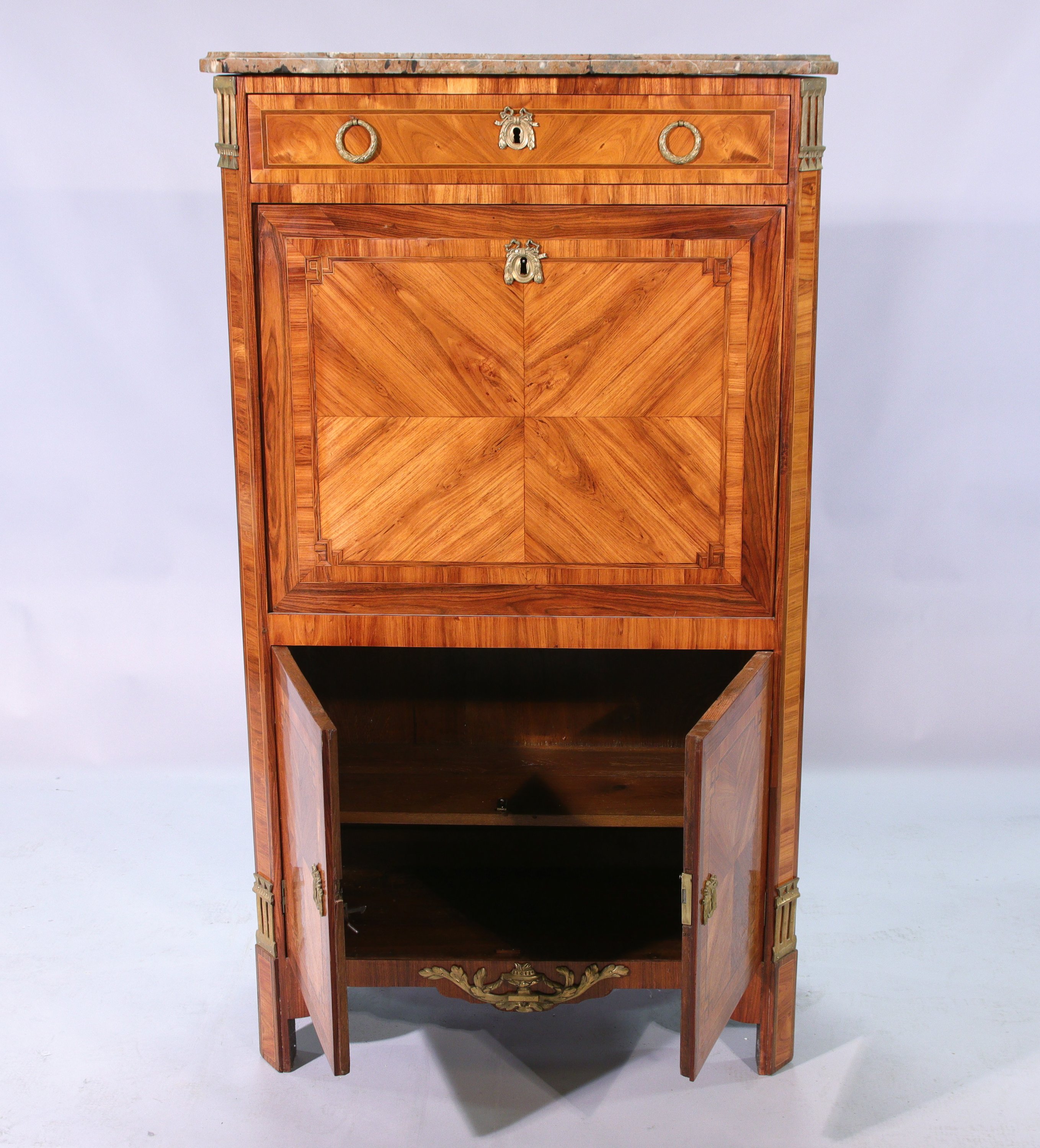 en placage de bois de rose et marqueterie en aile de papillon. Il ouvre en façade par un tiroir dans la partie supérieure. L'abattant foncé d'un cuir vert décoré au petit fer dévoile une étagère, trois compartiments et quatre tiroirs sur deux rangs. La partie basse ouvre par deux portes soulignées d'un filet rectangulaire aux angles rentrés et entrelacés. Les montants à pans coupés, le tablier en cul de lampe. Il repose sur quatre pieds de section rectangulaire.