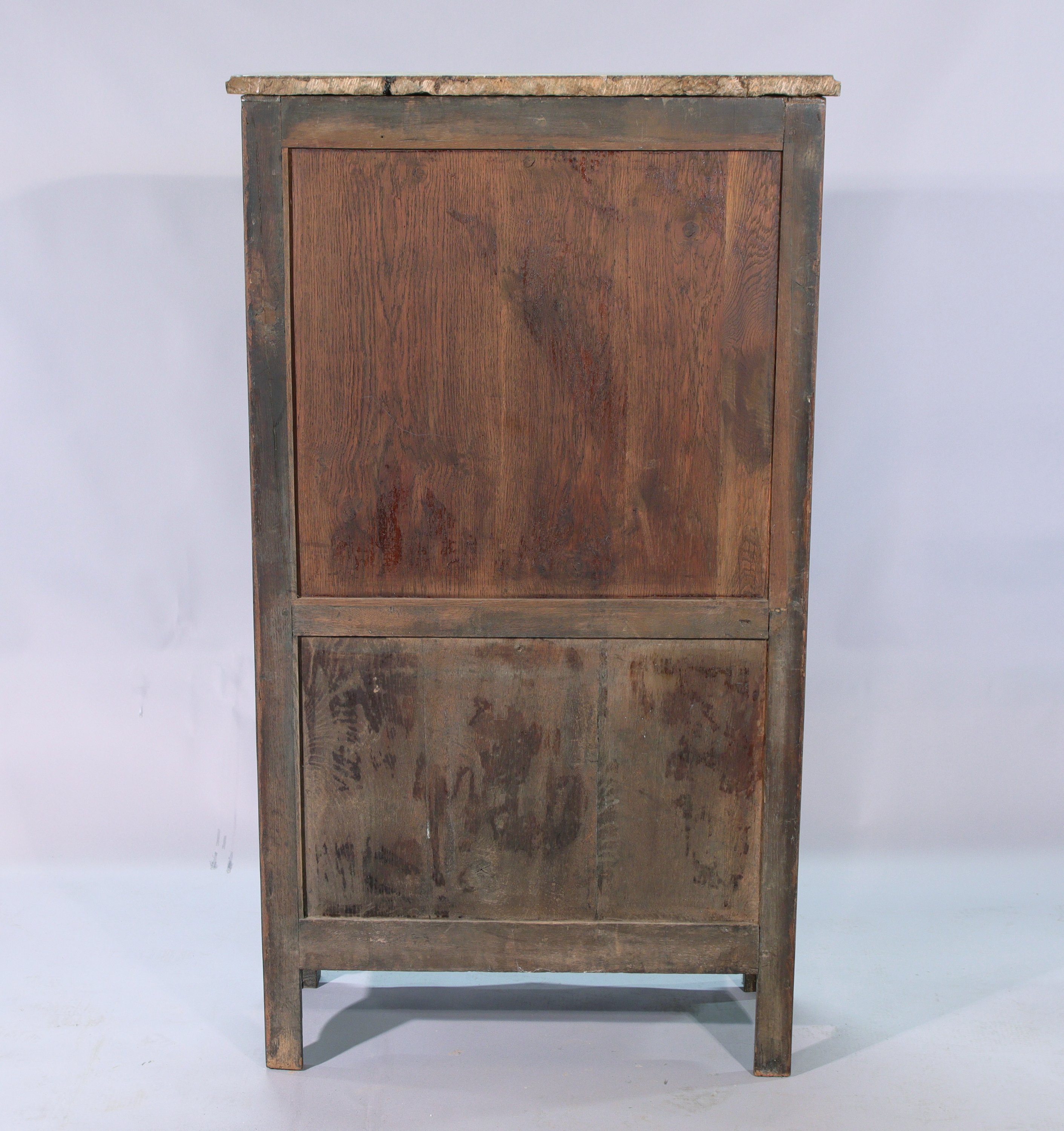 Garniture en bronze rapportée : poignées de tirage, chutes d'angles, entrées de serrures et cul de lampe.