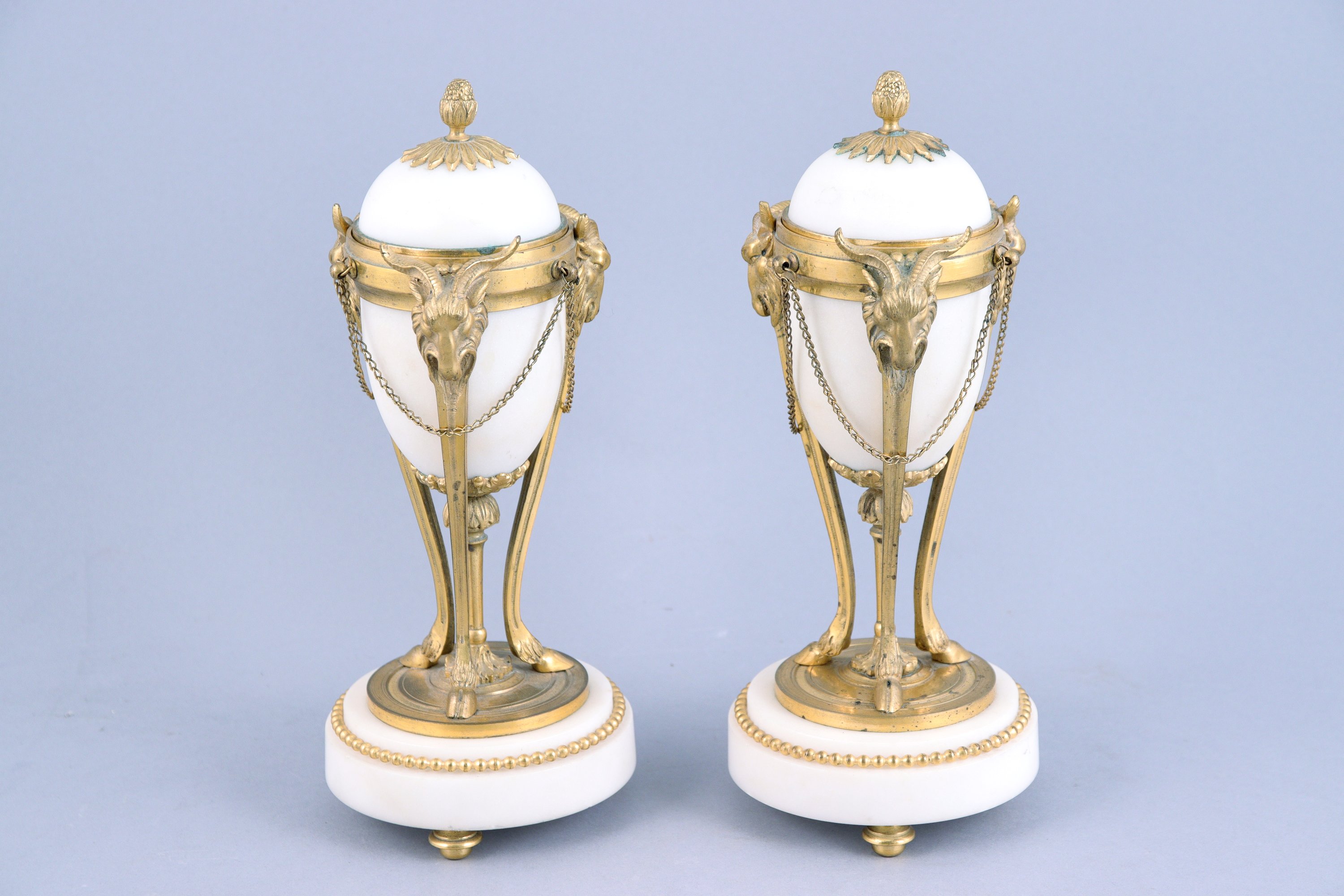 en marbre blanc de forme ovoïde sur un piétement tripode en bronze doré et ciselé. La partie supérieure en dôme présente un fretel en forme de grenade sur une terrasse de feuilles se renversant pour former bougeoirs. Le piétement tripode en athénienne à décor de têtes de bélier se terminant par des sabots. Un fût central fuselé terminé par une terrasse végétale. La base circulaire moulurée est soulignée par une frise de perles et soutenue par trois pieds à patins.