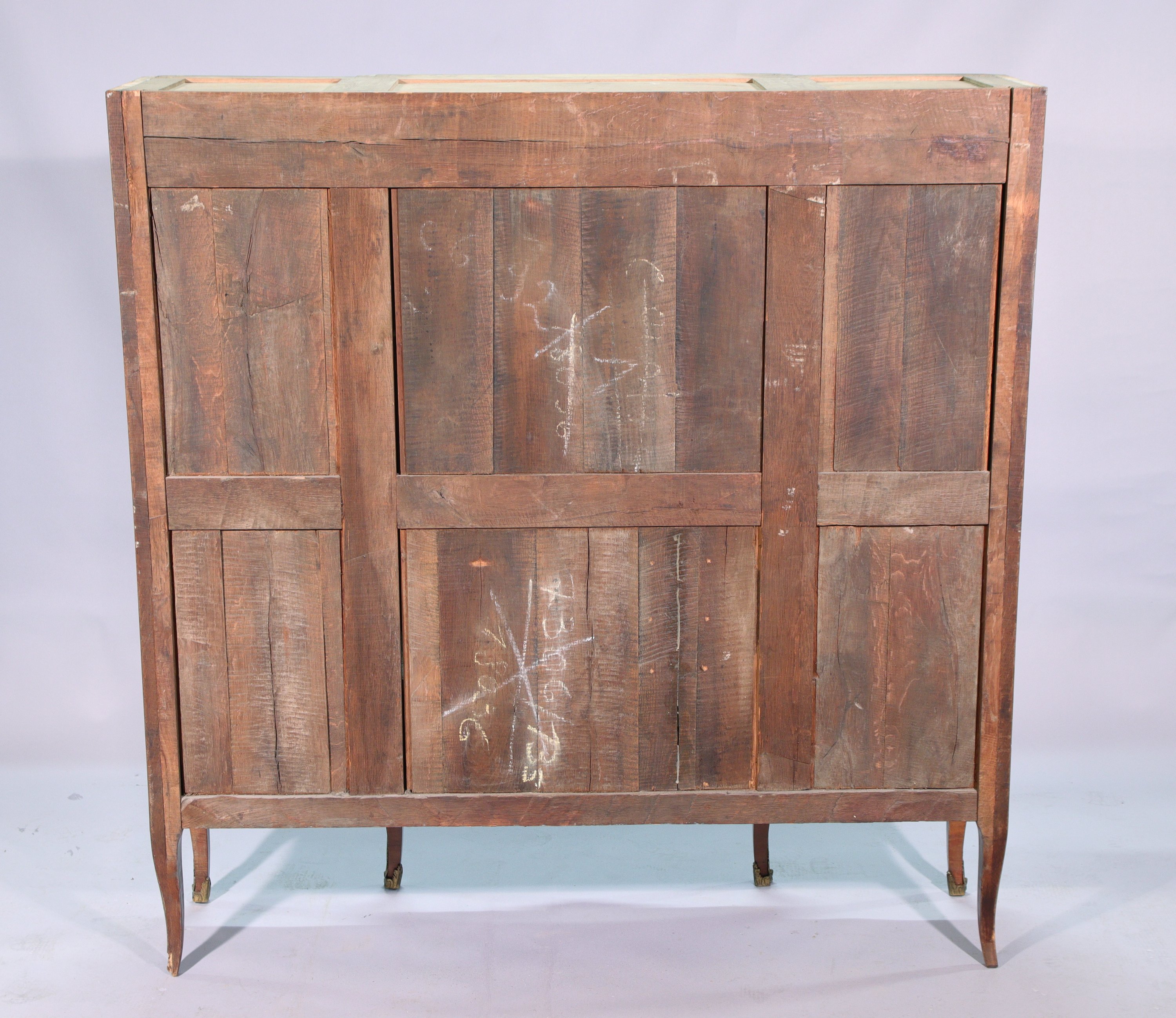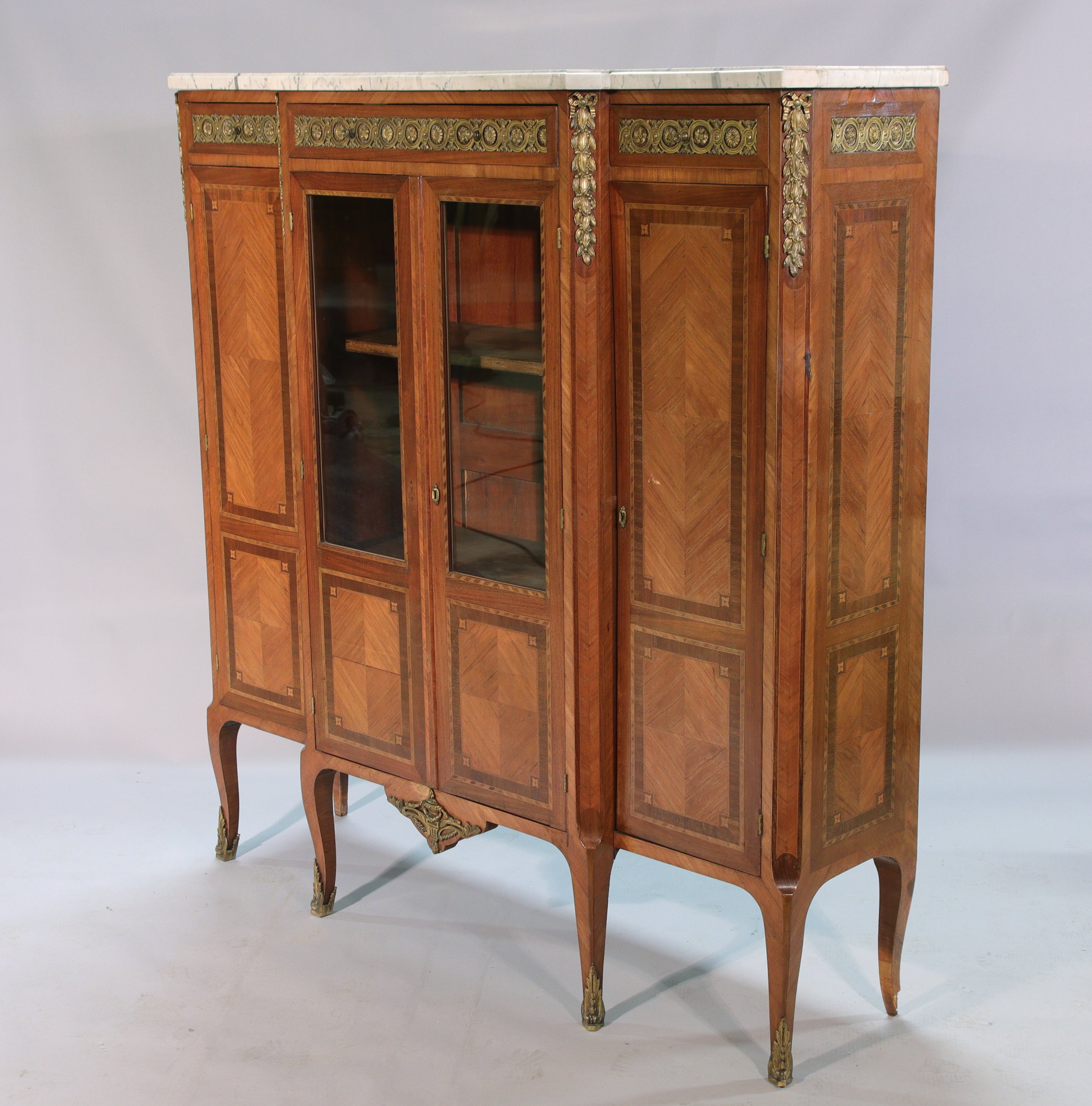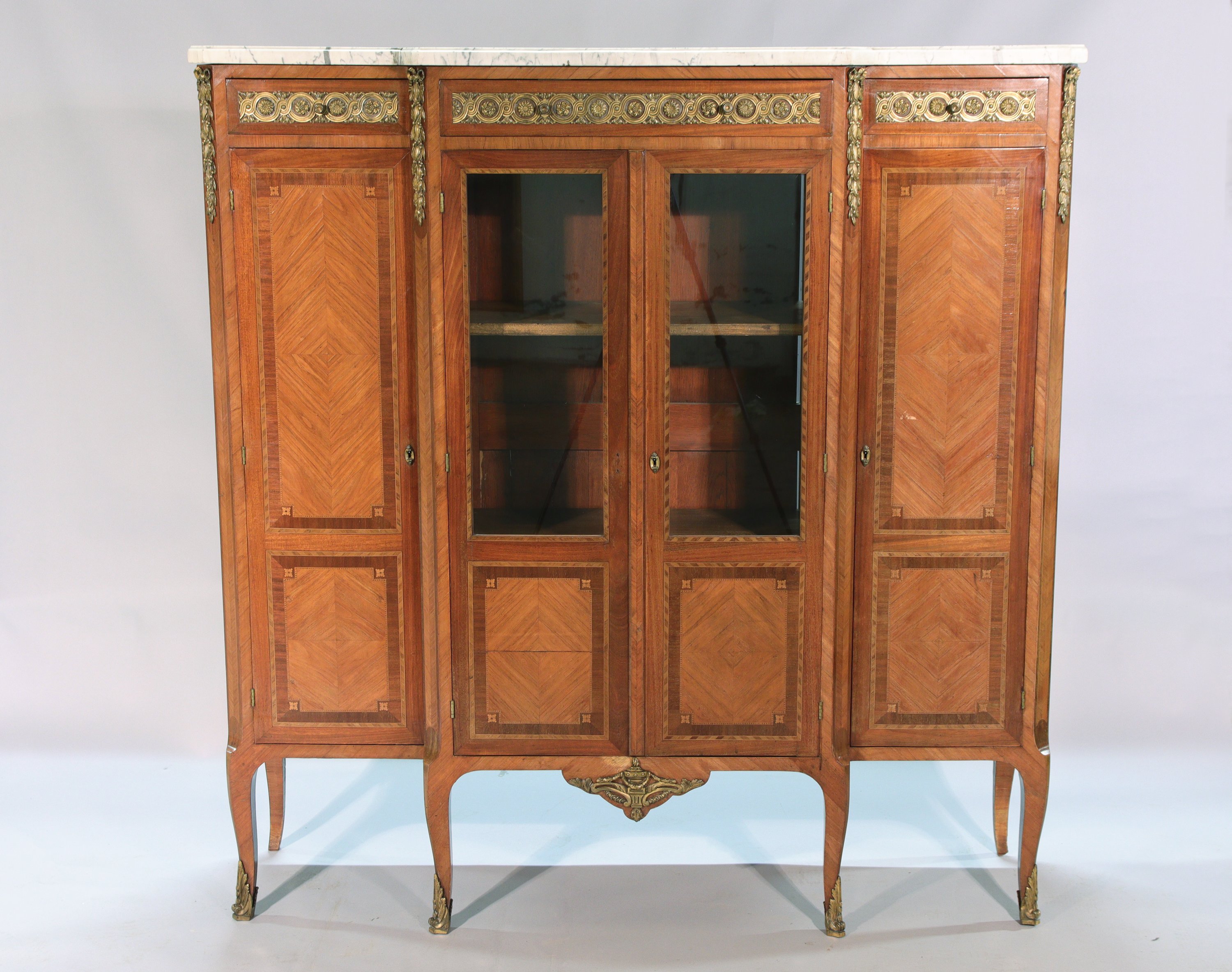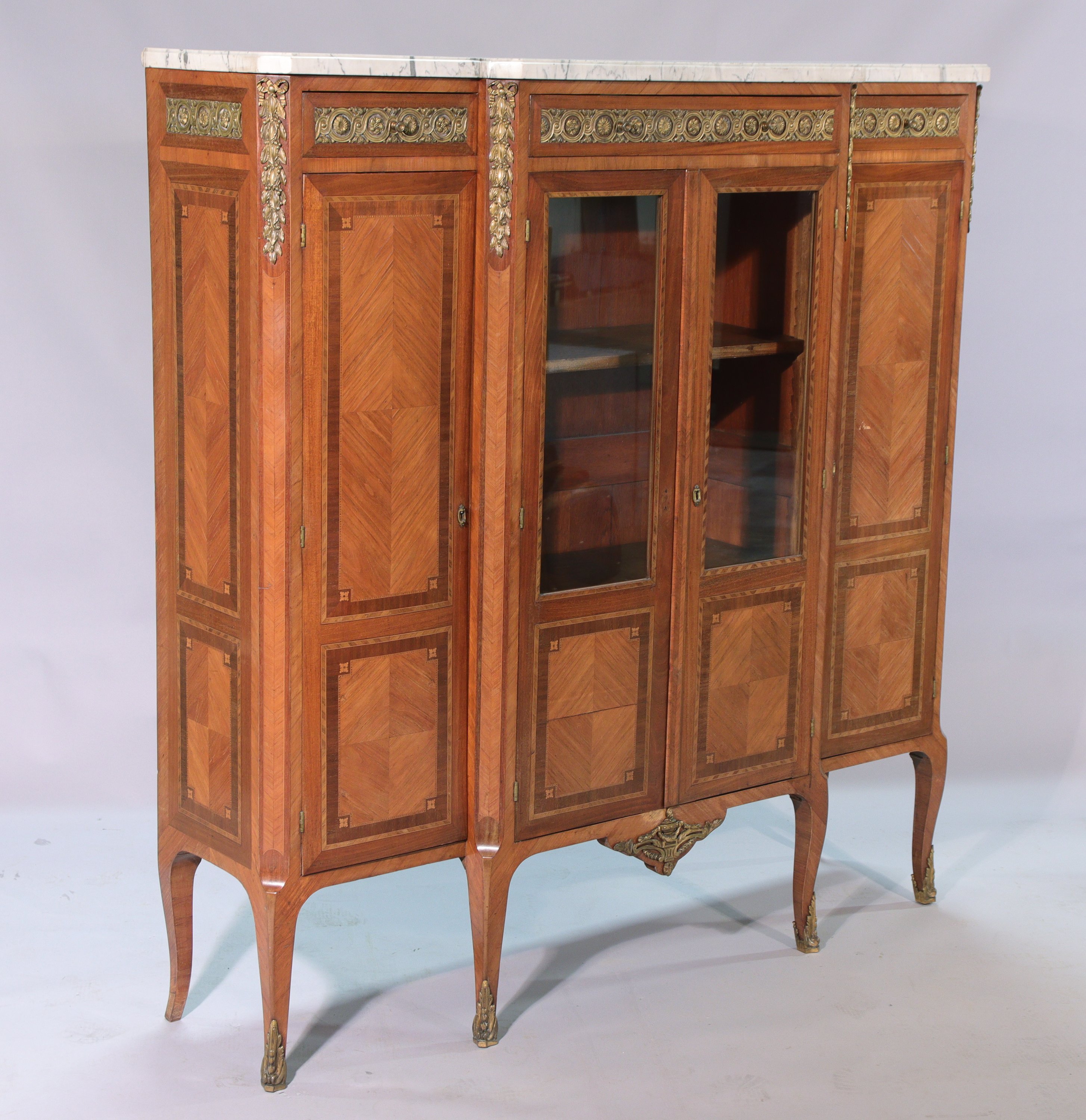 en bois de placage. Elle ouvre en partie supérieure par trois tiroirs, la partie centrale à deux portes vitrées entourée par deux vantaux à décor de tables aux angles rentrés. Les montants à pans coupés, le tablier en cul de lampe. Six pieds cambrés.