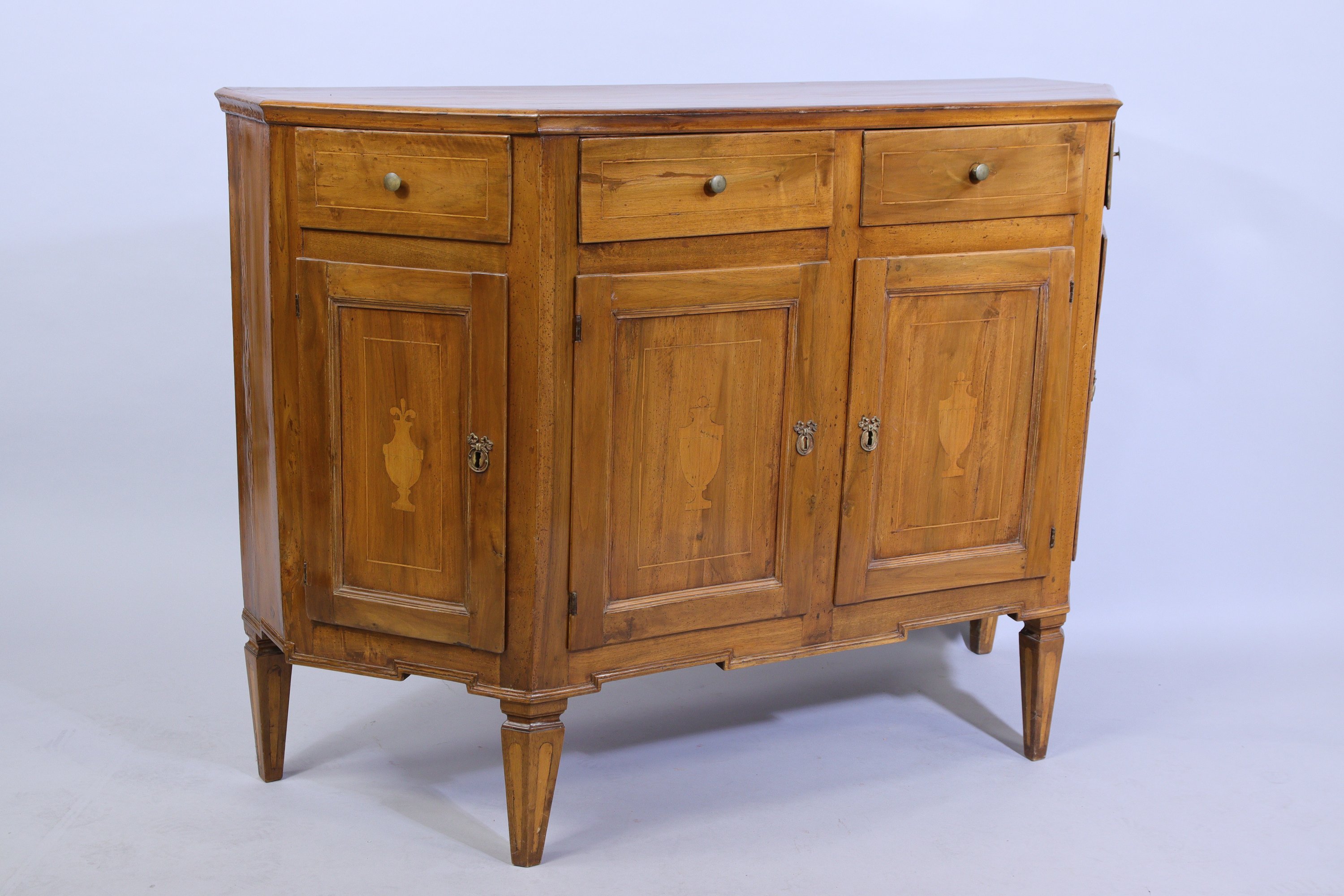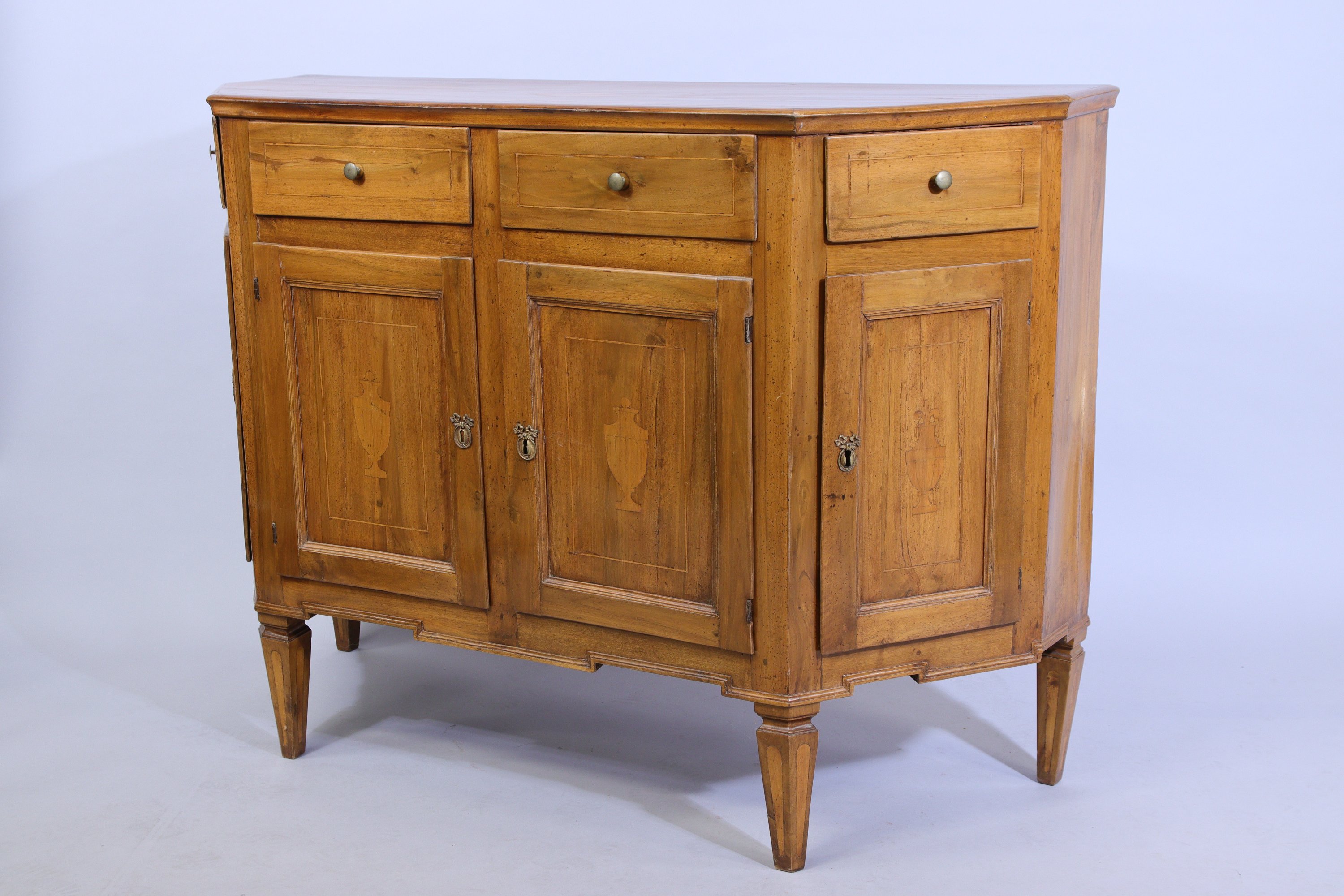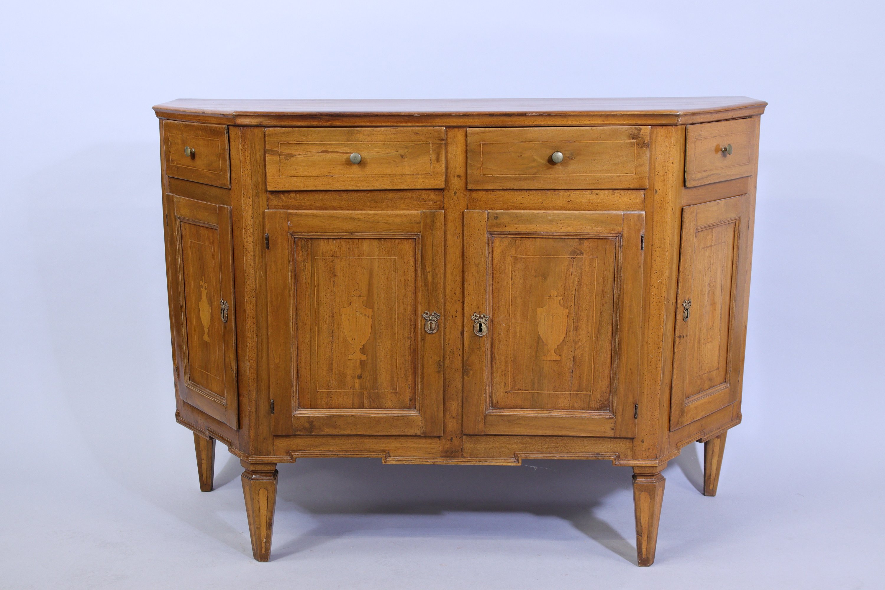 en noyer mouluré, ouvrant en façade par deux tiroirs surmontant deux vantaux décorés de vases sur piédouche dans un entourage de filet de bois clair. Le plateau reprenant le même décor. Les côtés composés d'un tiroir et un vantail, le tablier mouluré en petit cul de lampe. Quatre pieds gaines, dont les antérieurs à cannelures simulées.