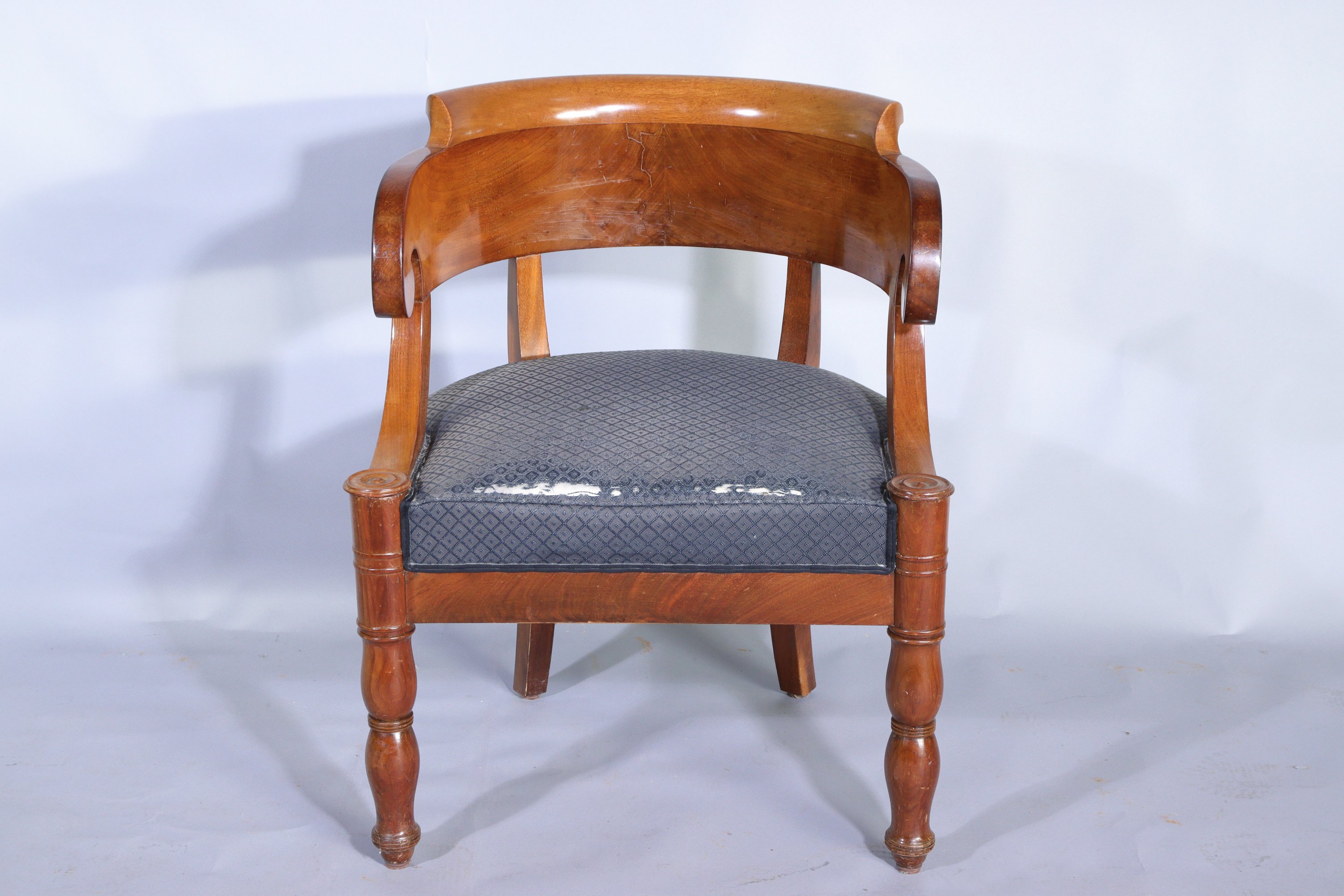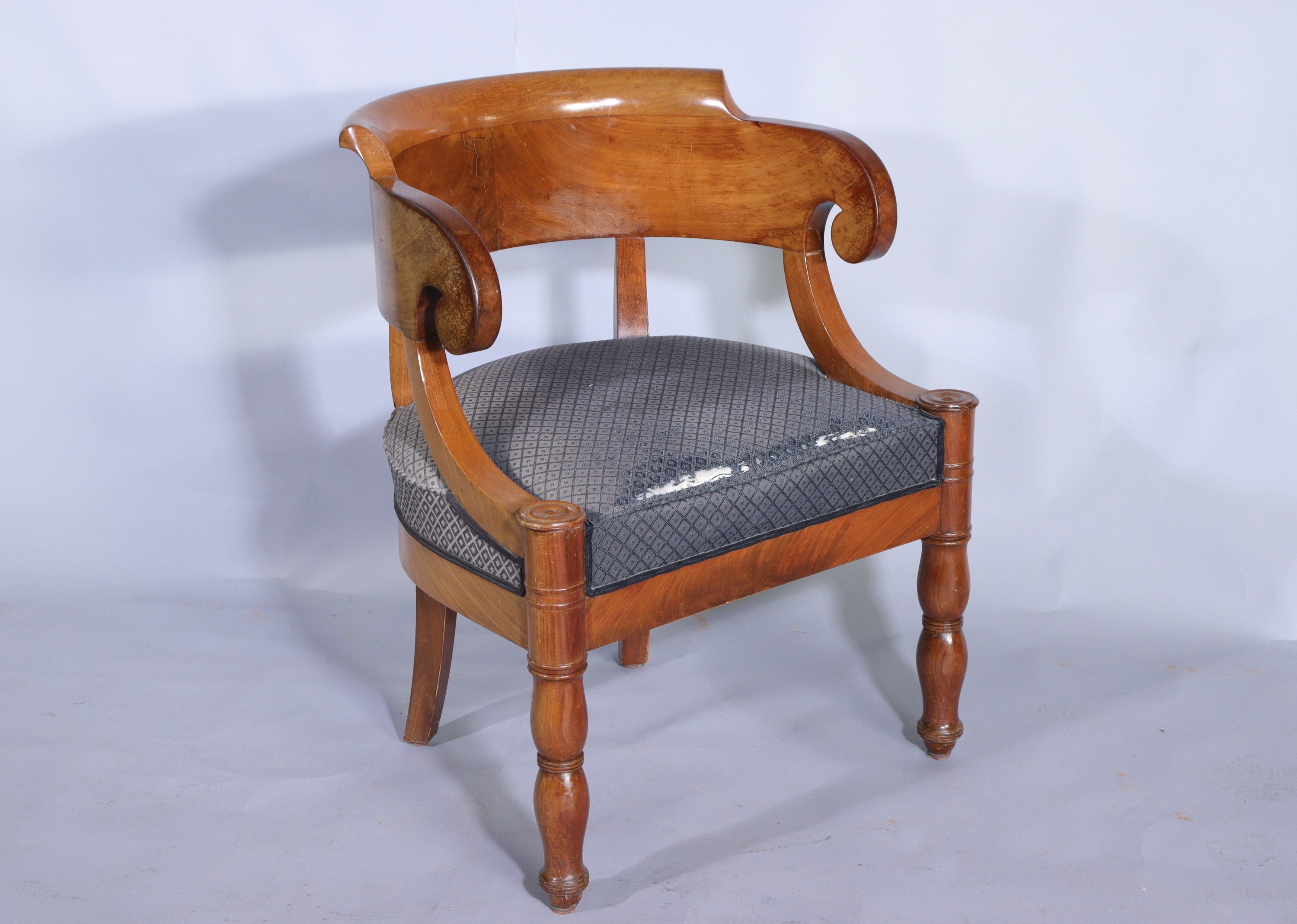 en acajou et placage d'acajou. Le dossier à bandeau se prolongeant par des accotoirs en enroulements et reposant sur des supports en console. Quatre pieds, les antérieurs "Jacob", les postérieurs de section carrée en sabre.