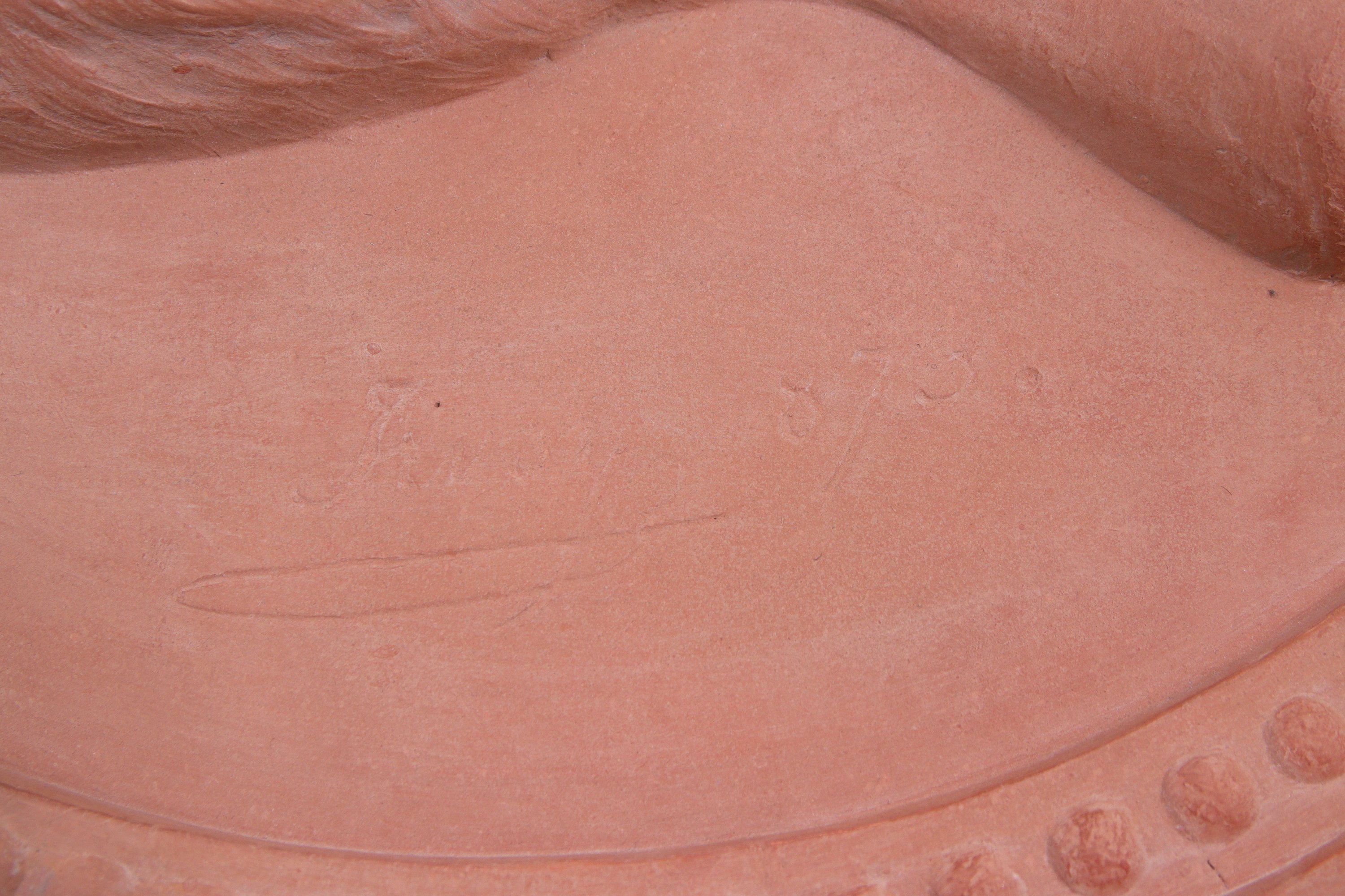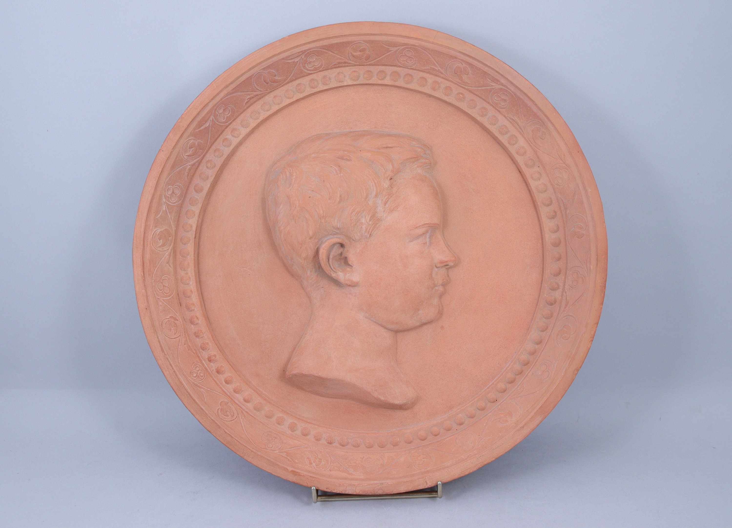 Bas-relief médaillon en terre cuite représentant le buste d'un jeune garçon de profil vers la droite.