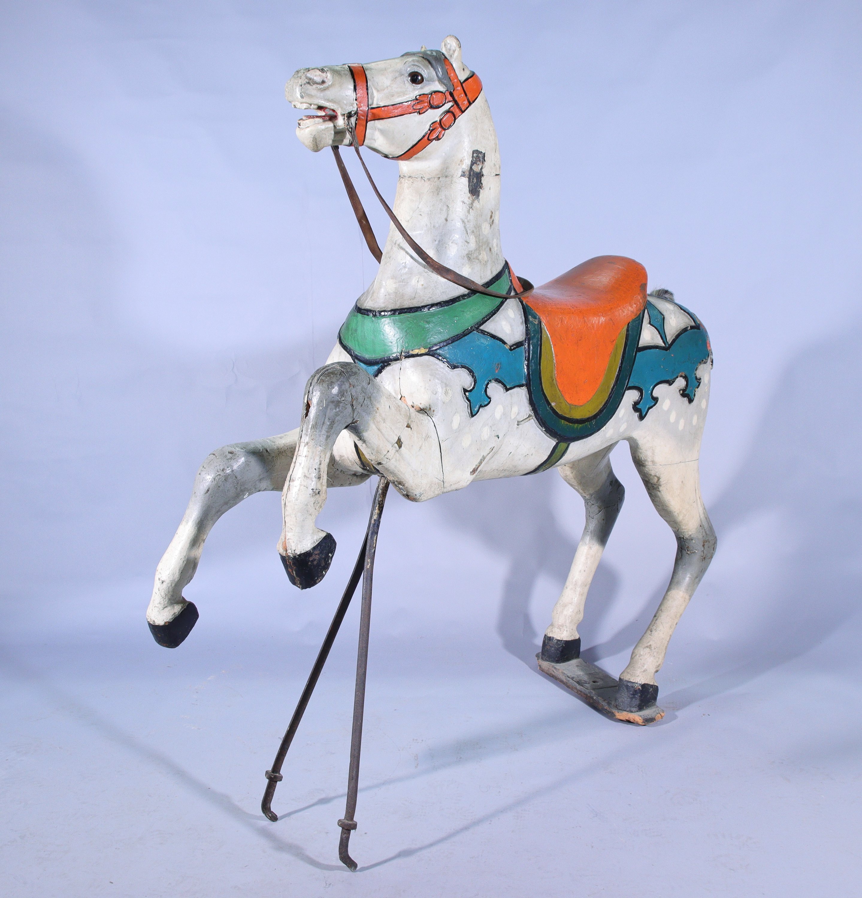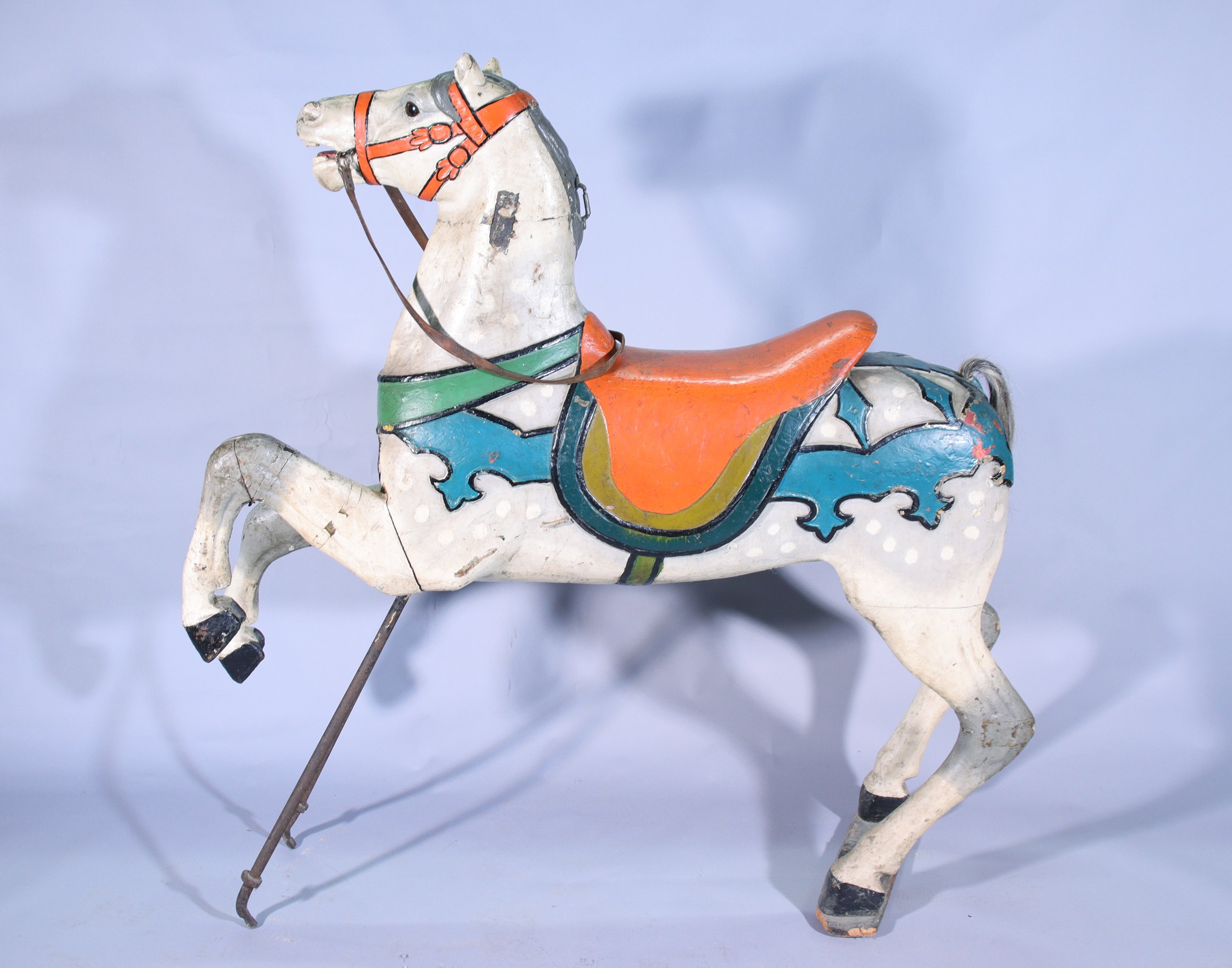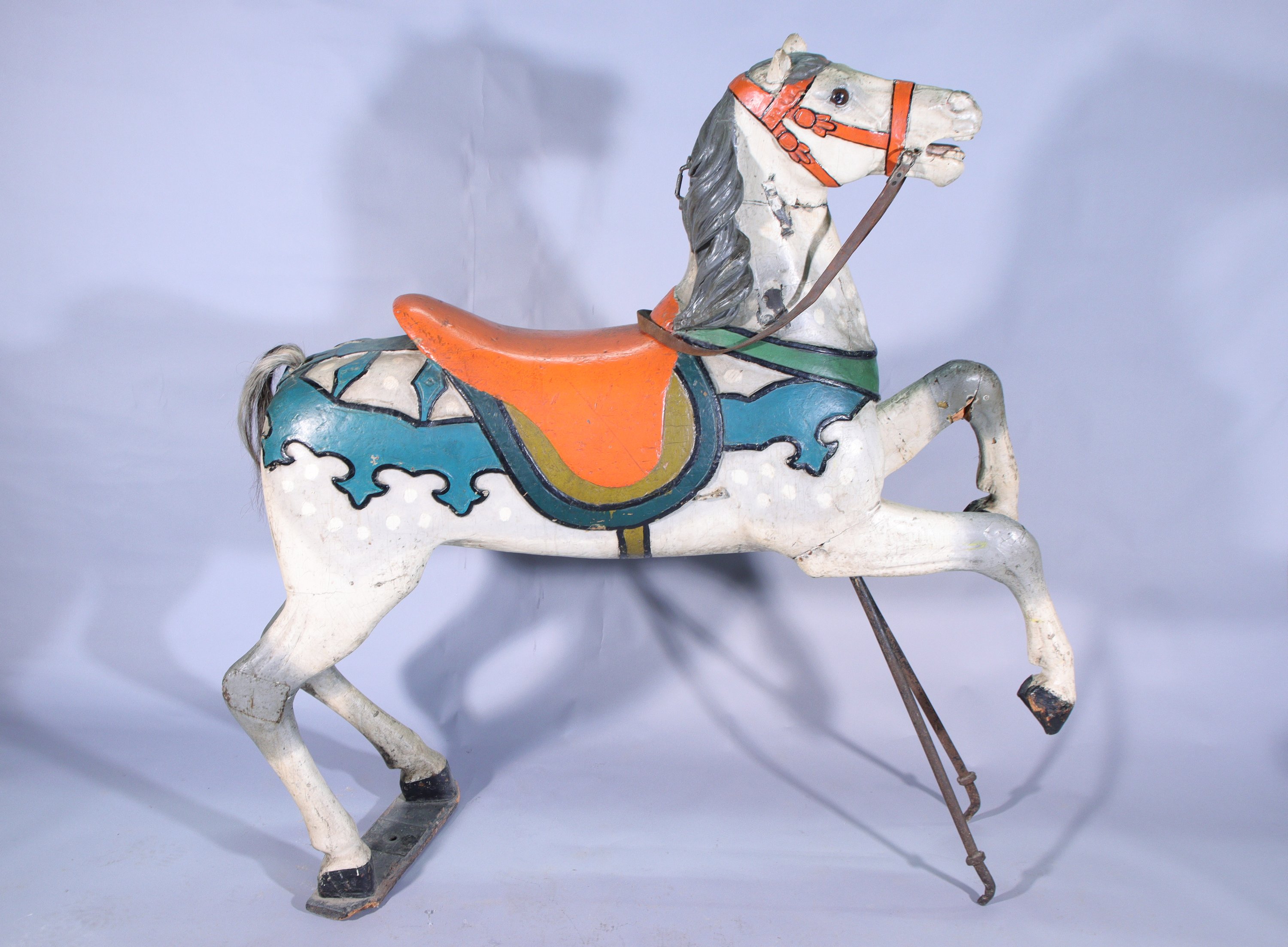 en bois et plâtre polychromé. Les rênes en cuir, les yeux en verre, la queue en crin.
