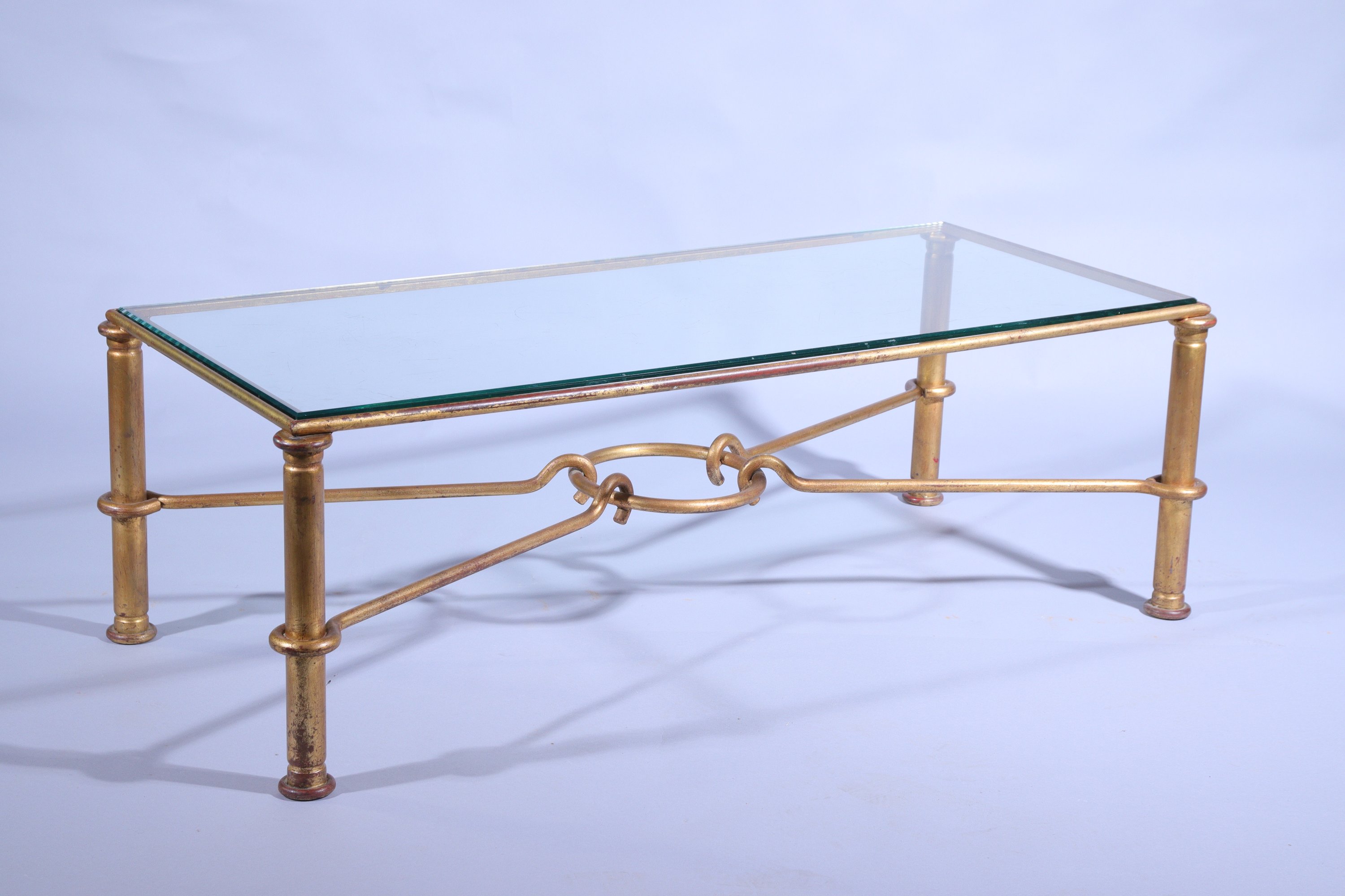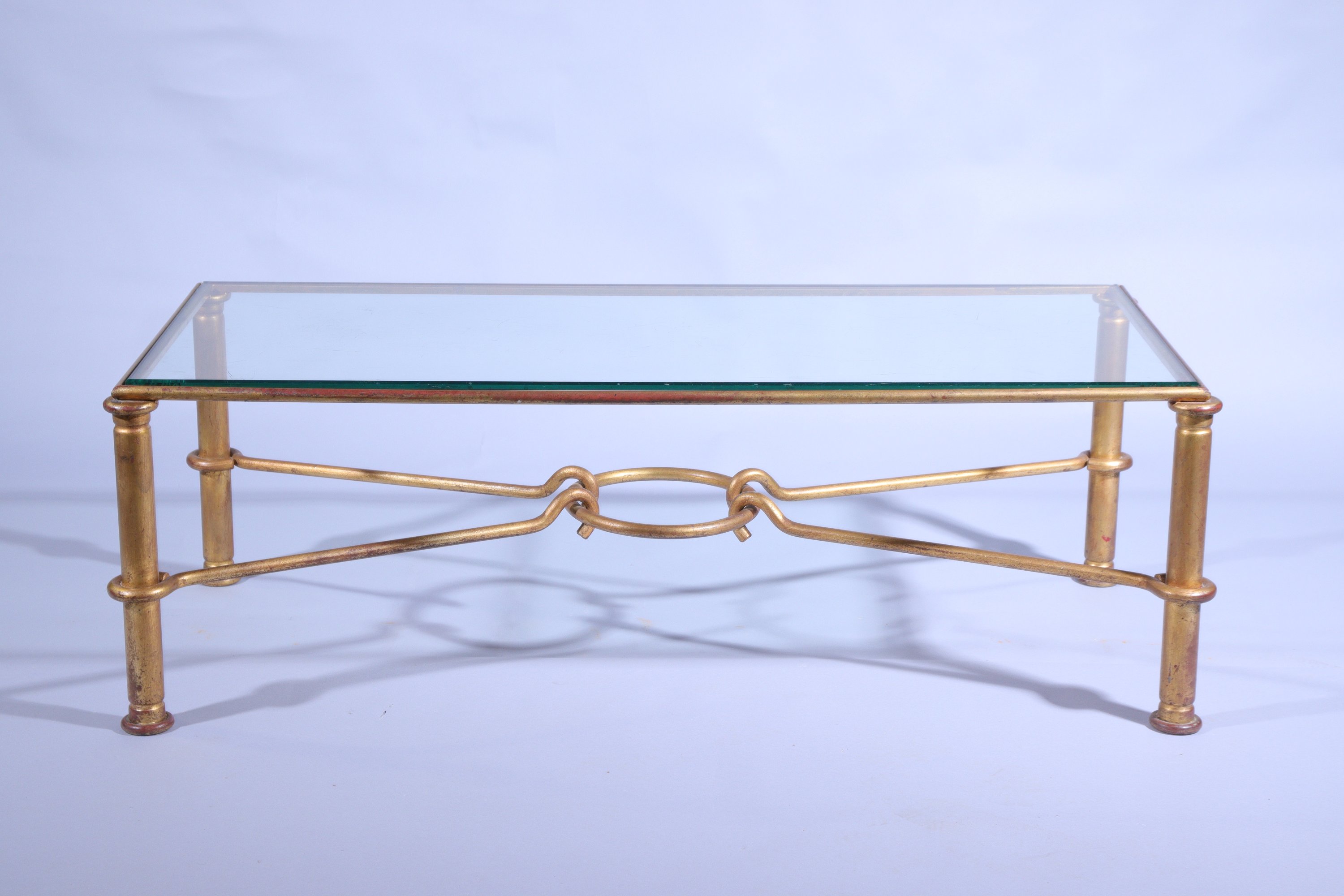 en métal doré. Le plateau en verre de forme rectangulaire repose sur quatre pieds de section ronde réunis par une entretoise en X dont le centre se compose d'un anneau symbolisant un mors de cheval.